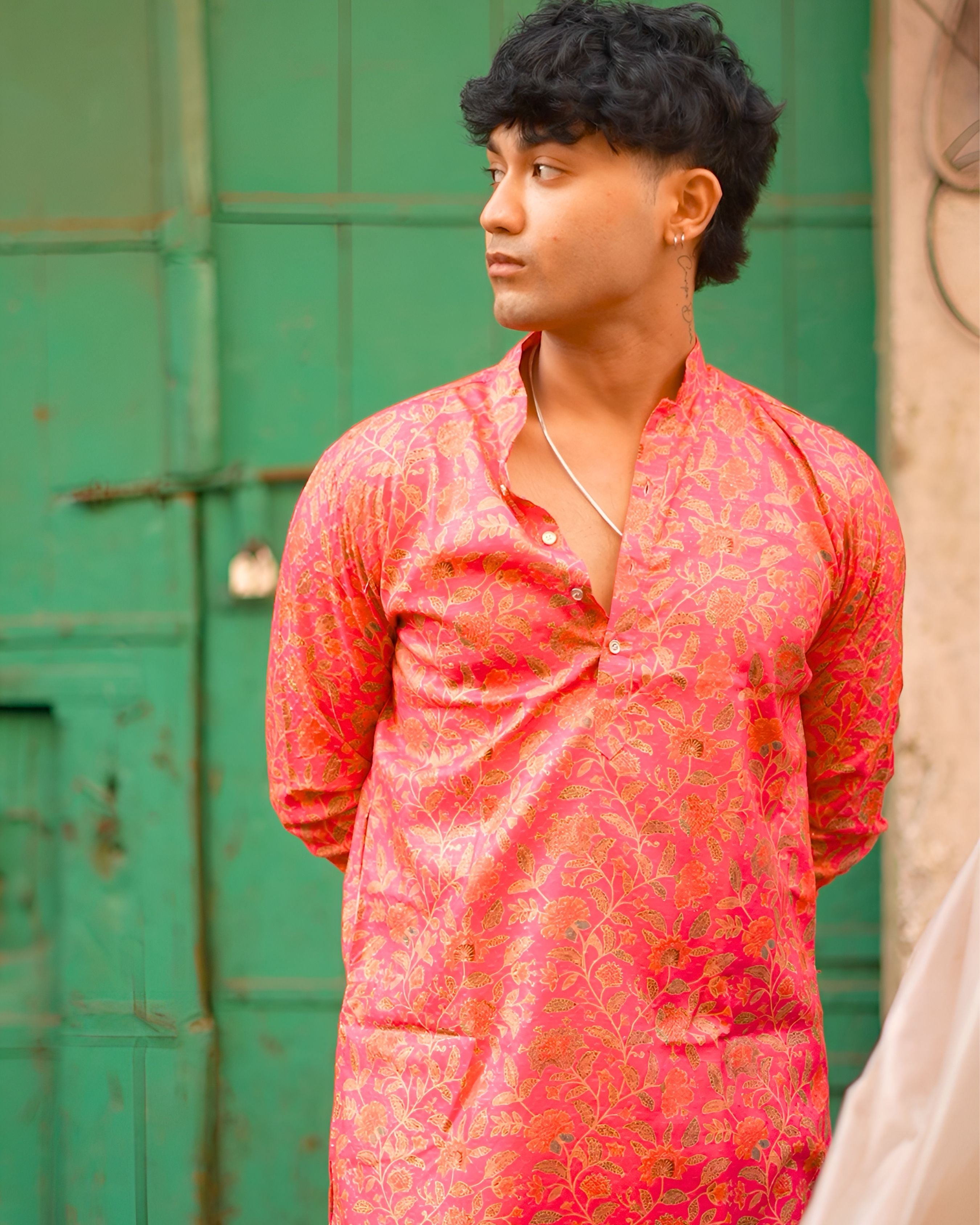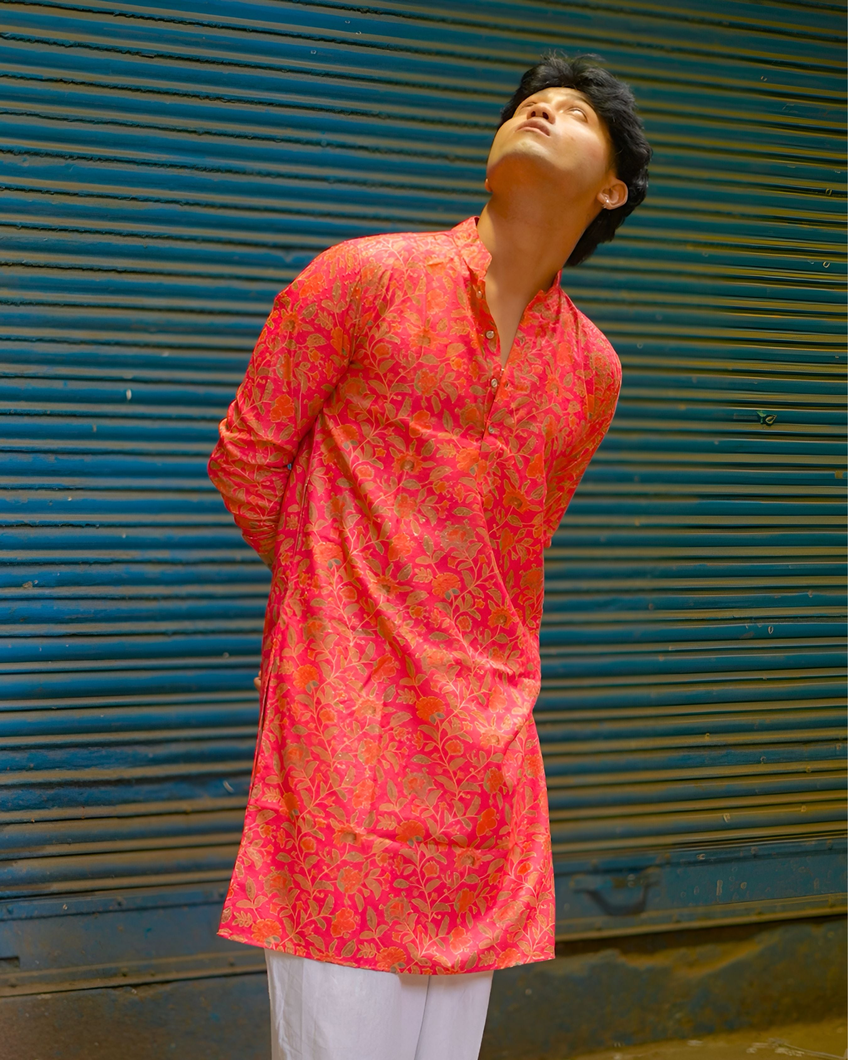 Bring festive charm to your wardrobe with this bright pink floral block print long kurta, adorned with golden highlights and intricate leafy patterns. 🌸 The vibrant florals create an elegant yet bold statement, making it ideal for weddings, cultural events, or festive celebrations. ✨ With a mandarin collar and full sleeves, this kurta blends traditional artistry with modern comfort. ✅ Pair it with white or beige bottoms for a complete festive look.