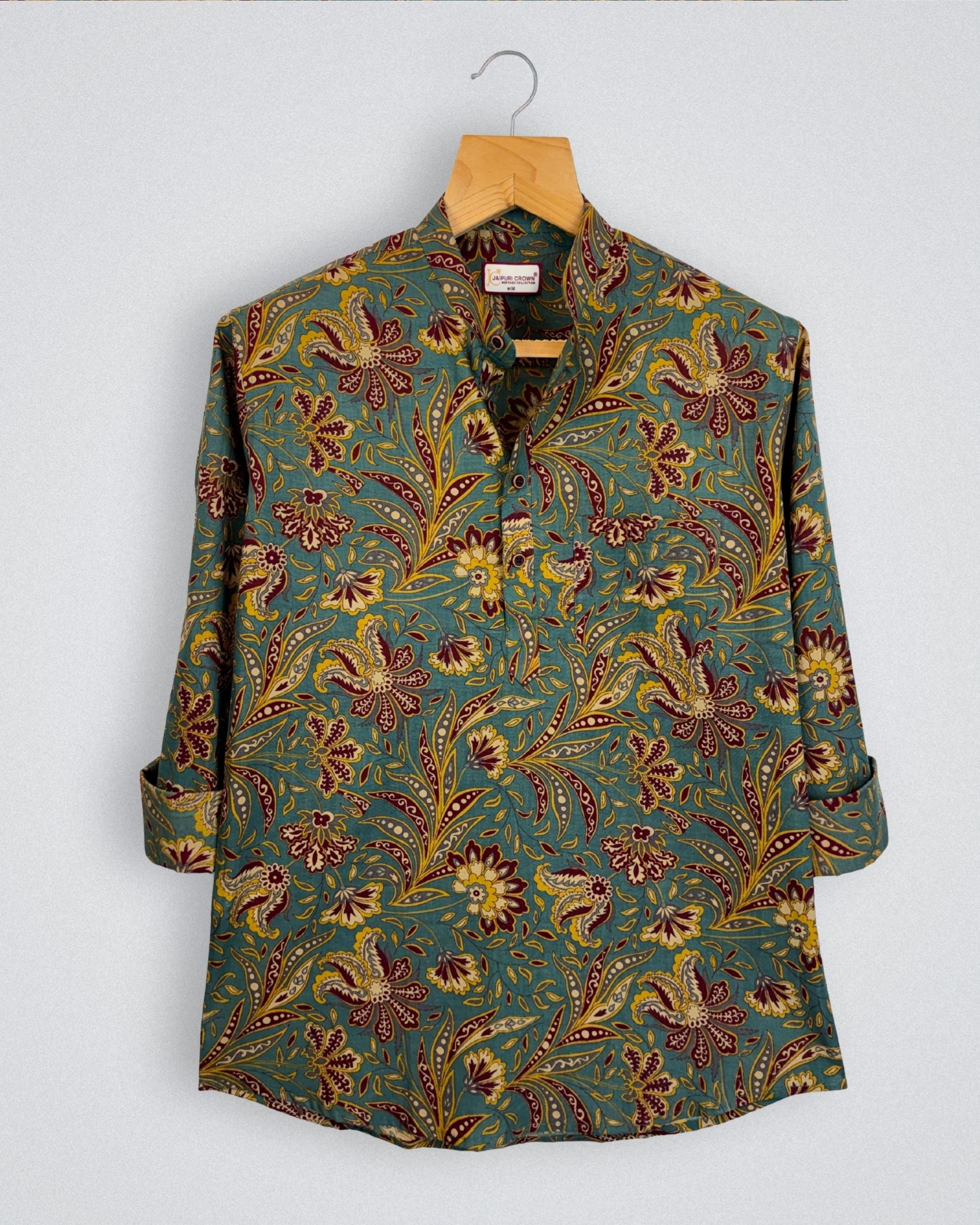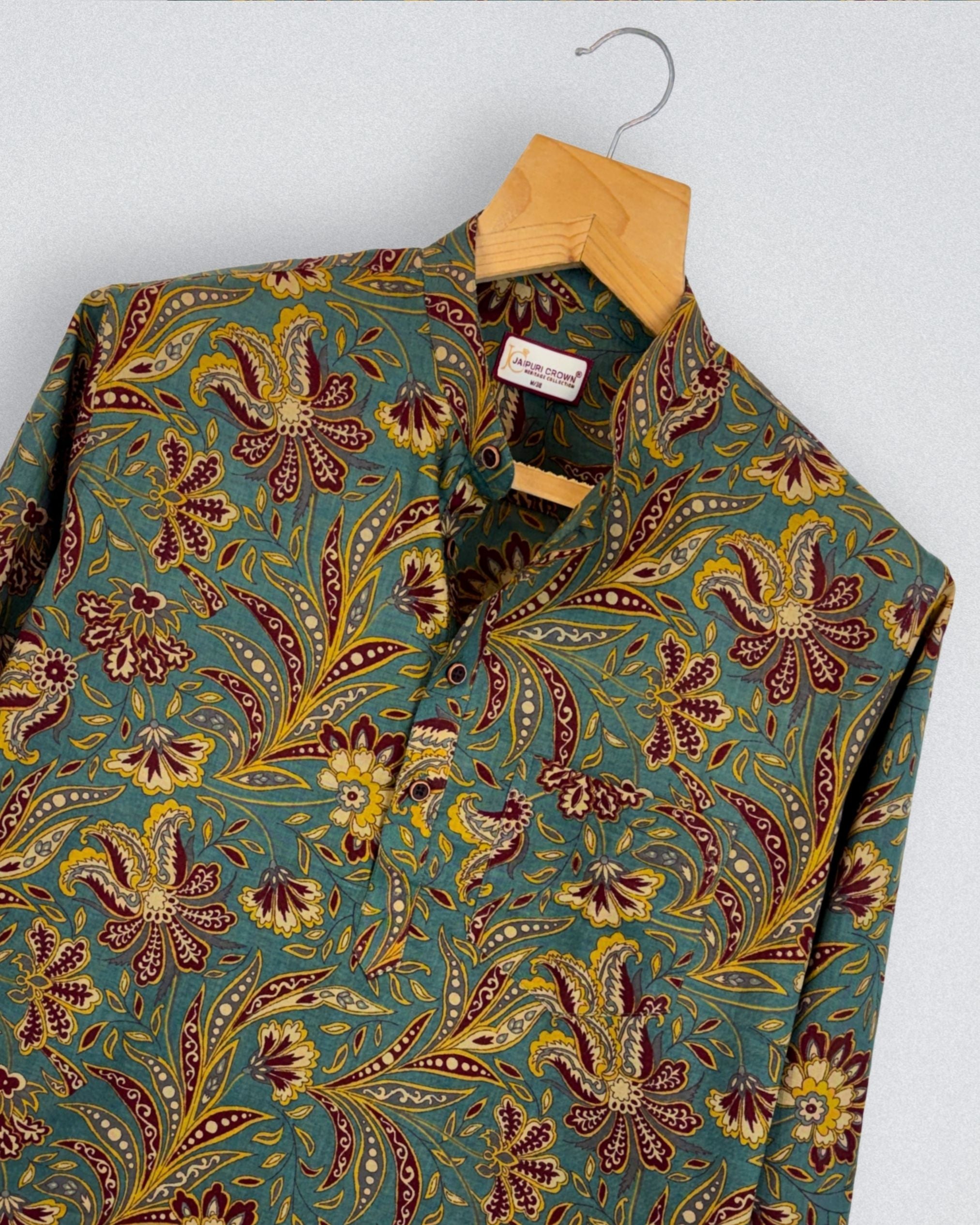 Experience the charm of tradition with Floral Symphony by Jaipuri Crown – a stunning Short Kurta featuring intricate floral prints in rich maroon and golden hues on a serene teal backdrop. Made from 100% Sanganeri cotton, this Kurta promises comfort and breathability, making it an ideal choice for festive occasions, family gatherings, or casual outings.