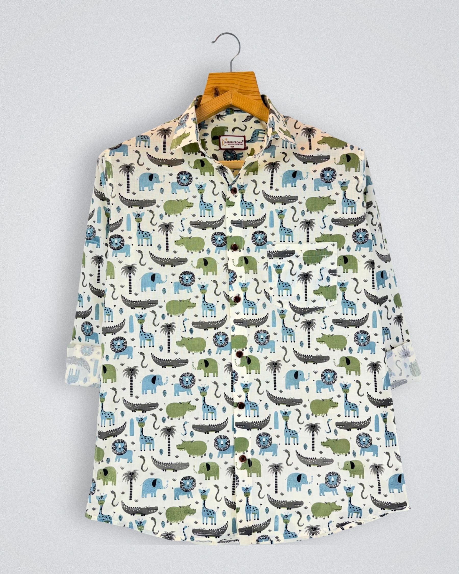 Step into a playful adventure with Forest Fiesta by Jaipuri Crown – a charming Full sleeve cotton shirt featuring a delightful animal print in shades of blue and green against a soft cream background. Made from 100% Sanganeri cotton, this shirt provides a soft, breathable feel, perfect for casual outings, family gatherings, or relaxed days at home.