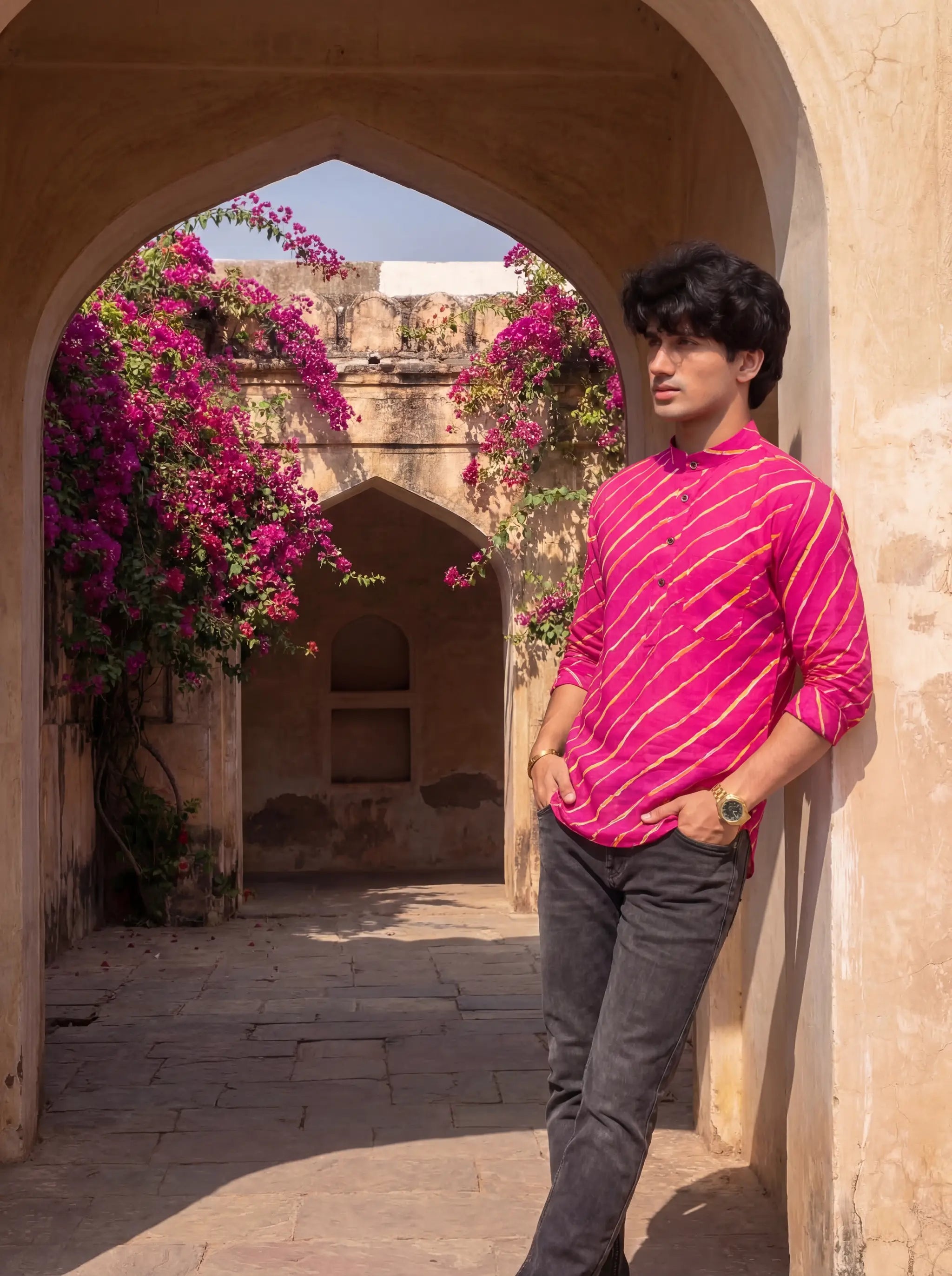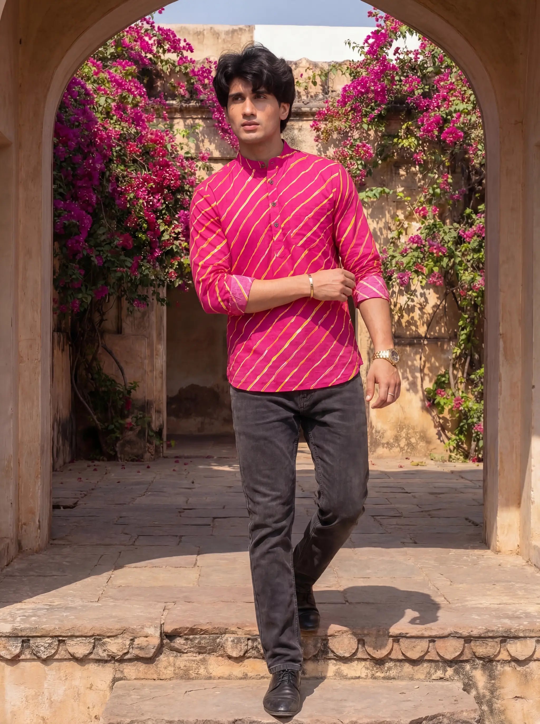 Step out in style with Funky Stripes by Jaipuri Crown – a chic Short Kurta featuring bold pink and yellow stripes on a vibrant backdrop. Made from 100% Sanganeri cotton, this Kurta is soft, breathable, and perfect for warm days, family gatherings, or festive occasions.