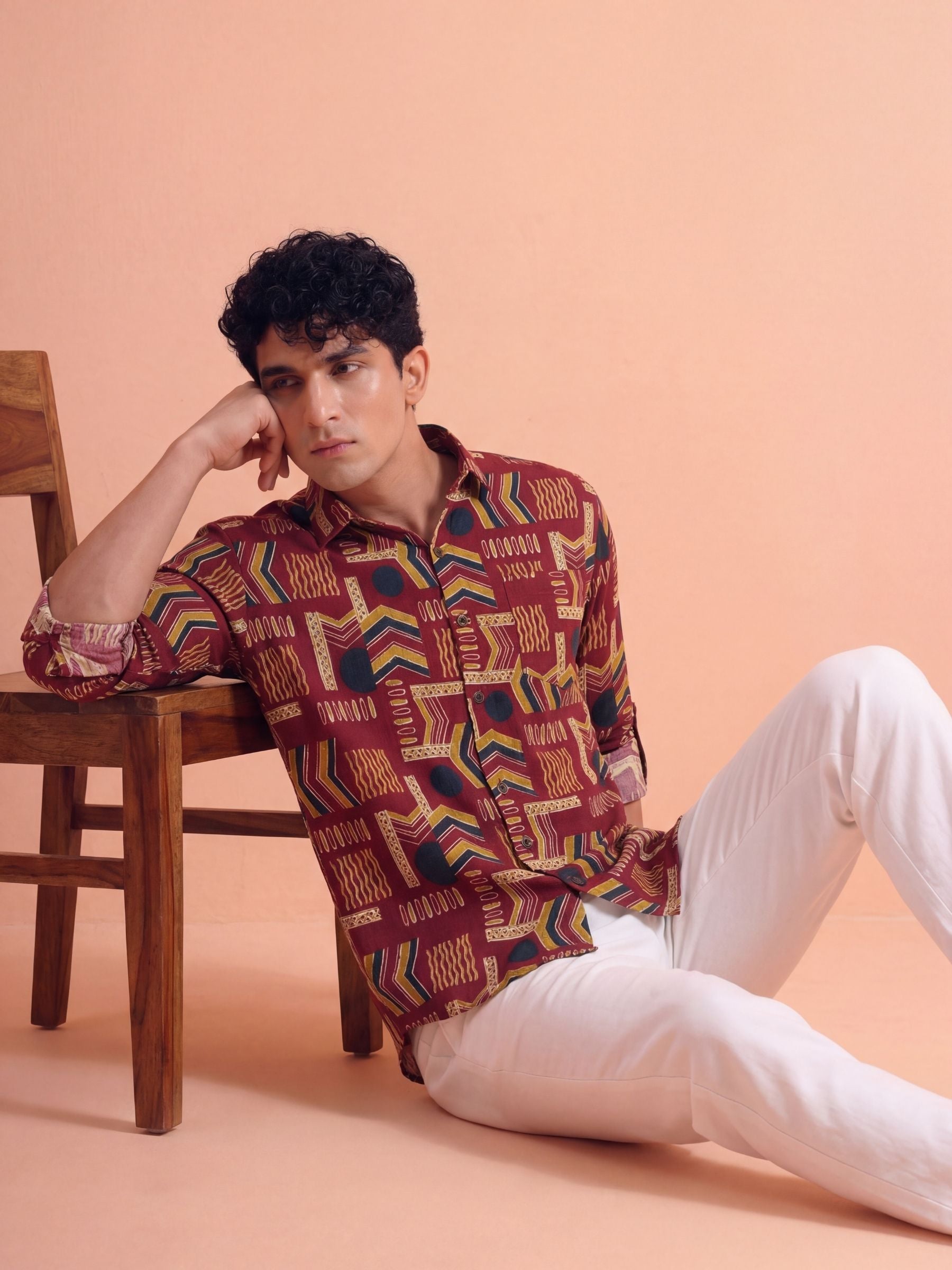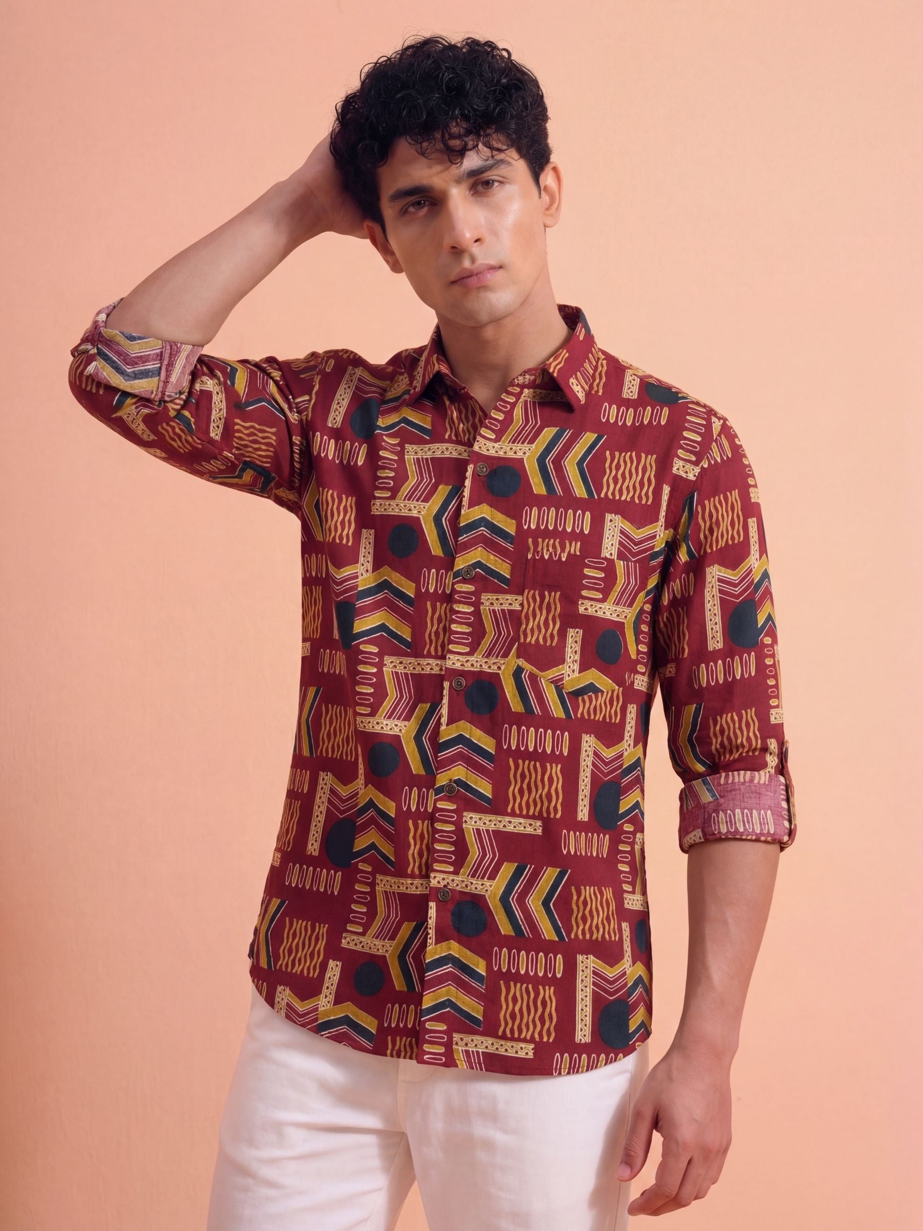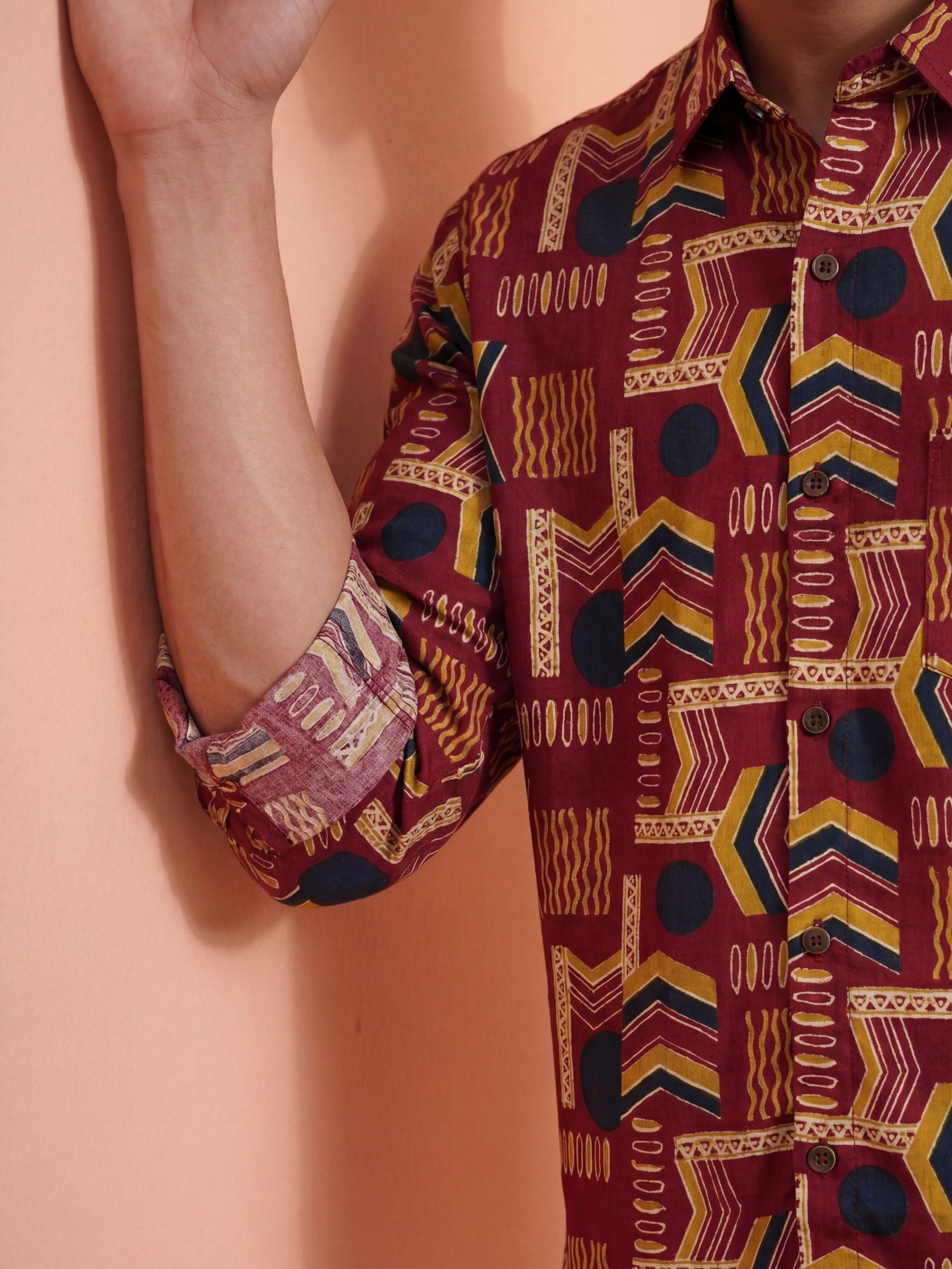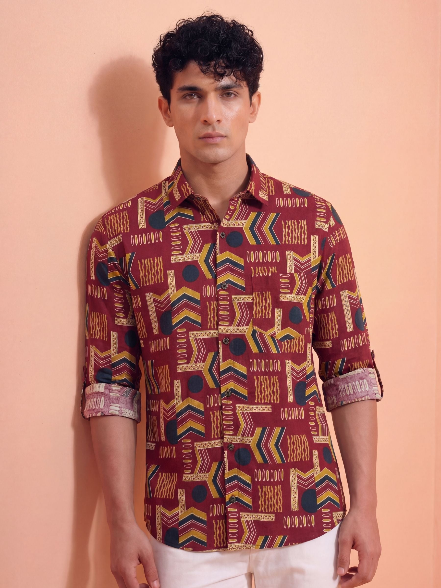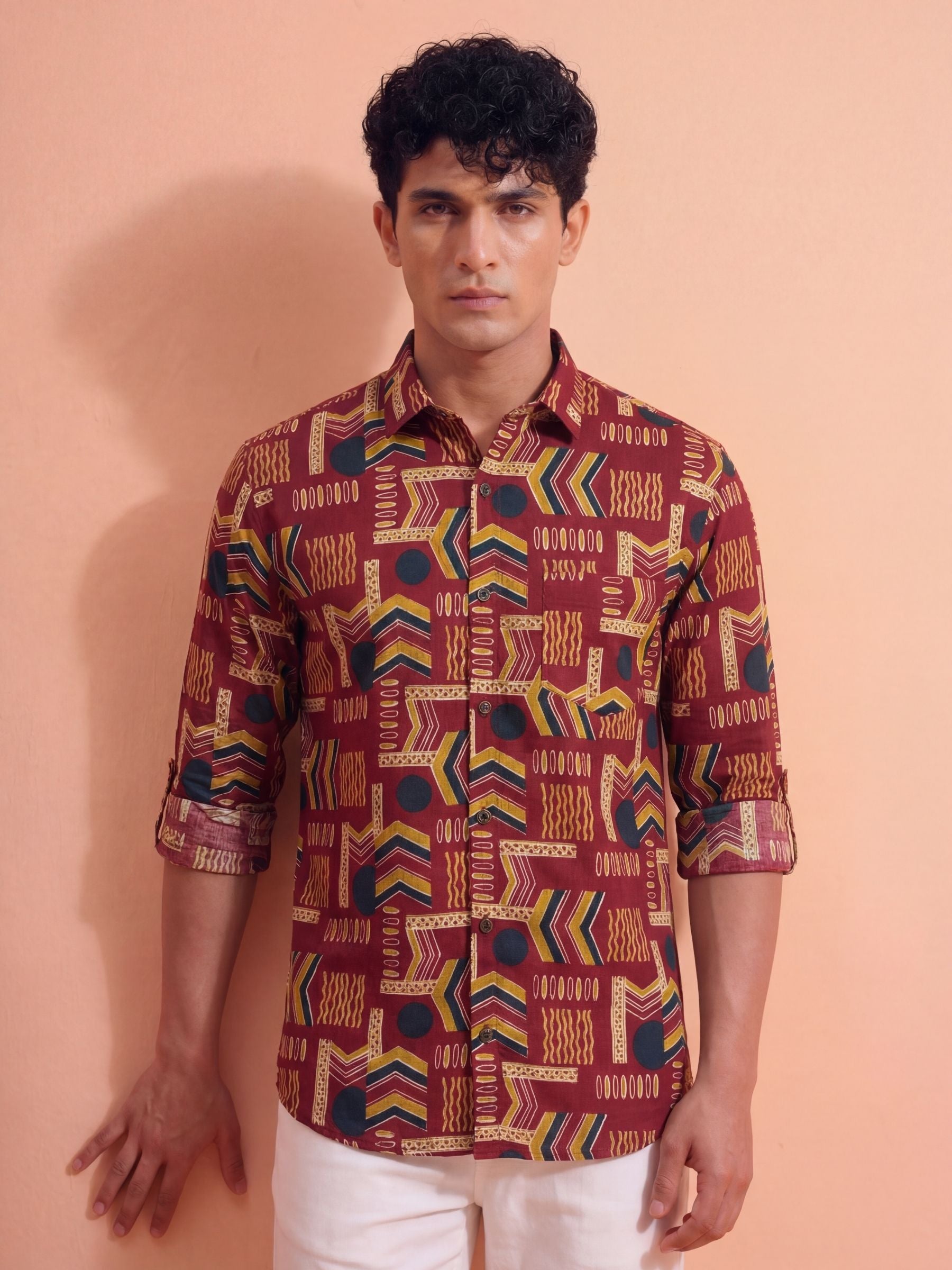 Geometric Harmony – Printed Cotton Full Sleeve in Burgundy