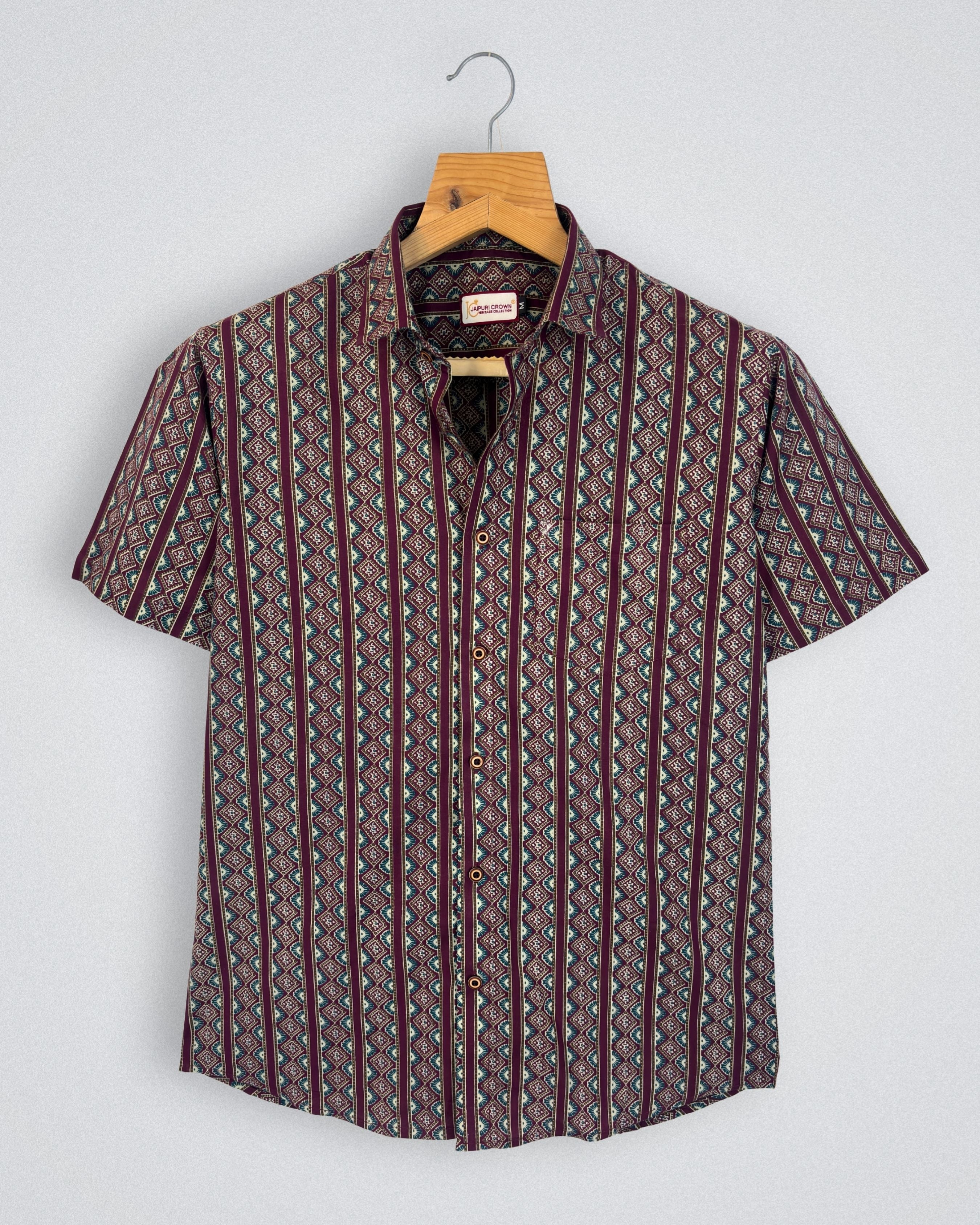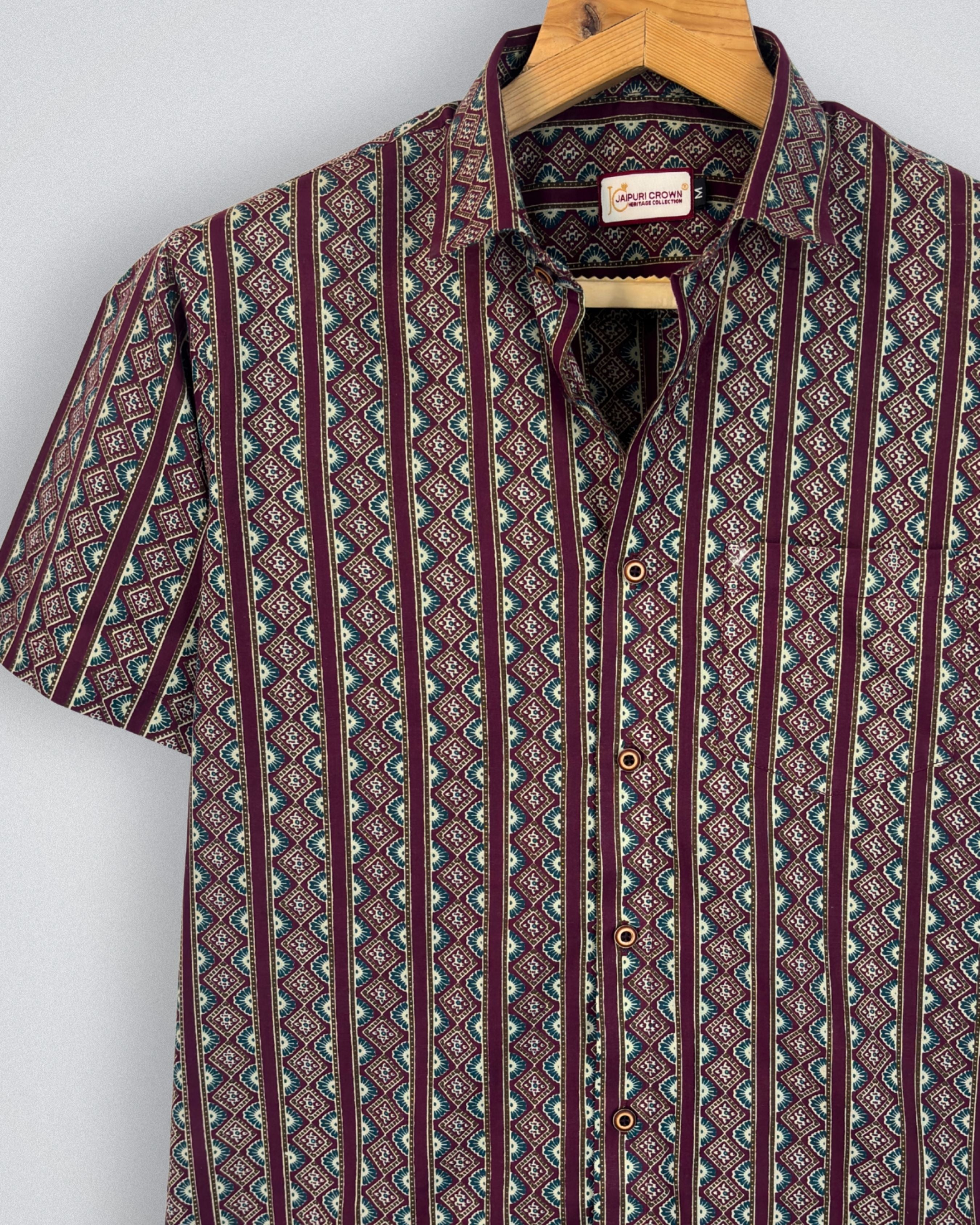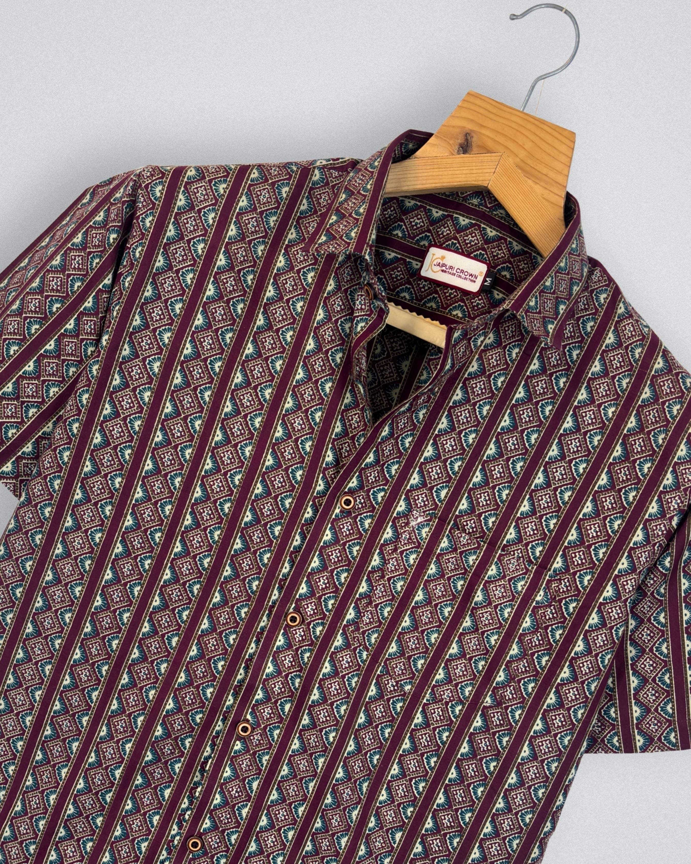 Step into style with Geometric Harmony by Jaipuri Crown – a captivating half sleeve cotton shirt adorned with intricate geometric patterns in rich maroon, teal green, and cream. Crafted from 100% breathable cotton, this shirt ensures comfort during summer outings while adding a touch of sophistication to your wardrobe.
