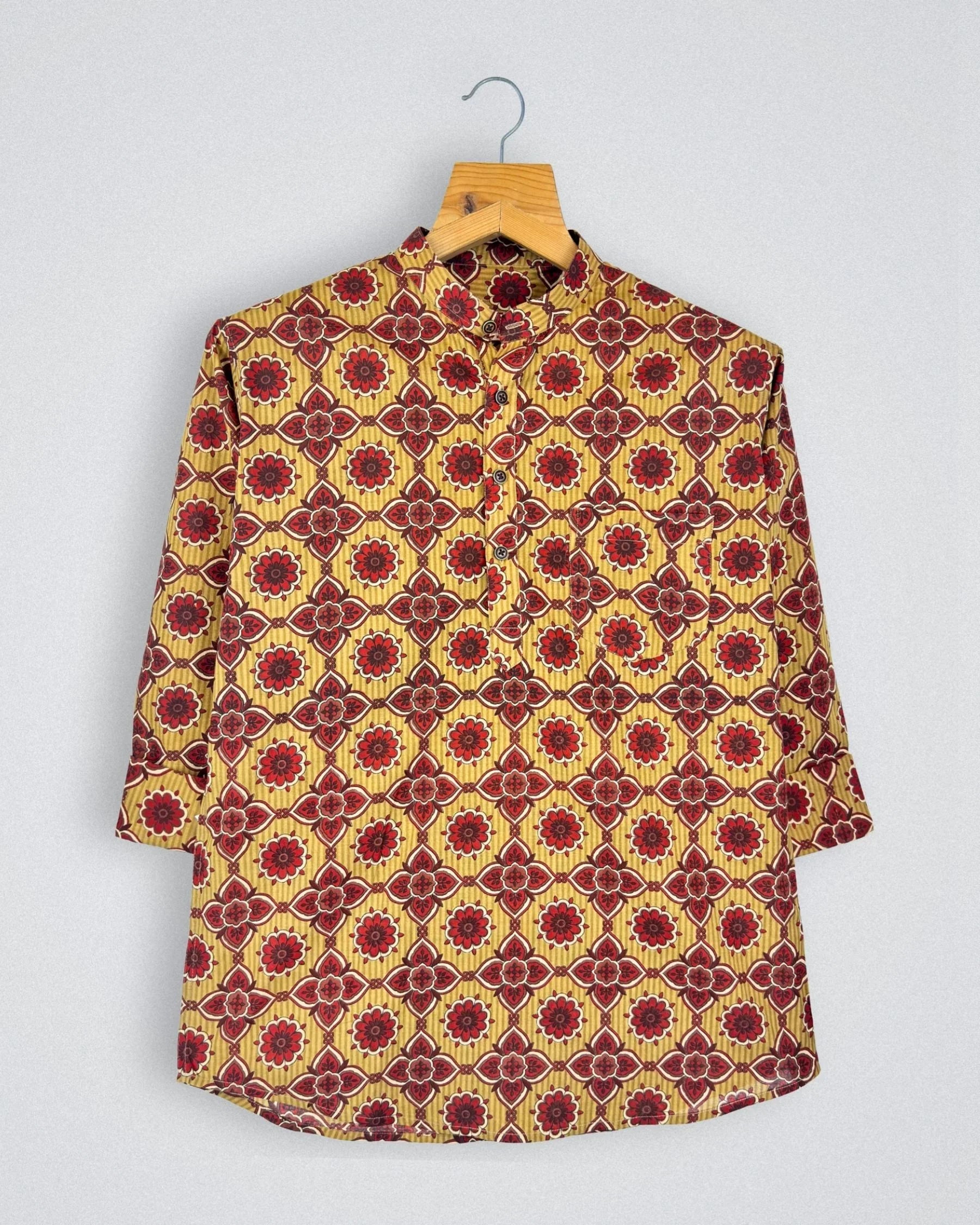Step into tradition with Floral Elegance by Jaipuri Crown – a stunning Short Kurta featuring an intricate floral print in deep red and gold tones against a warm beige background. Made from 100% Sanganeri cotton, this Kurta is not only soft and breathable but also perfect for festive occasions, family gatherings, or casual outings.