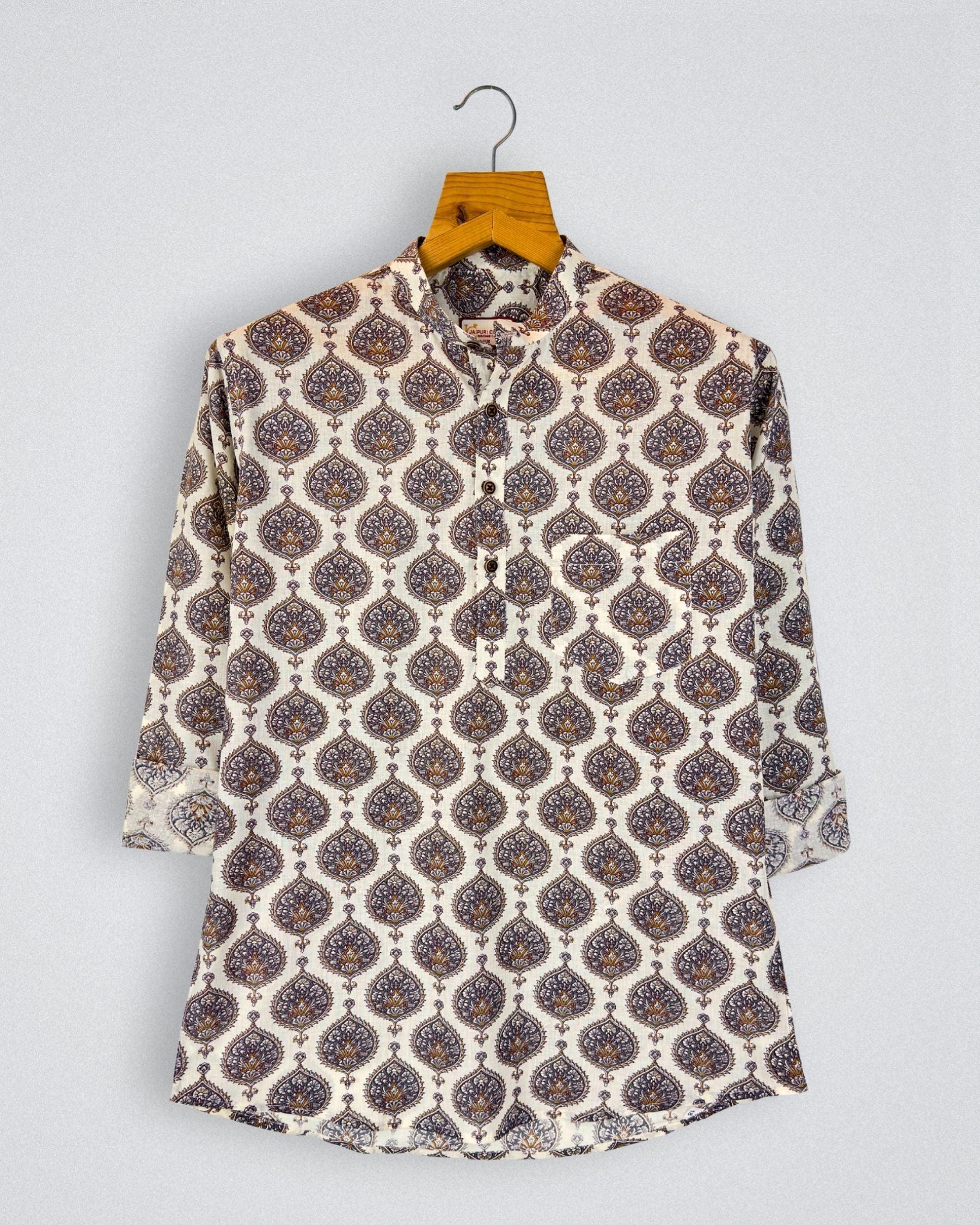 Step into a world of traditional elegance with the Floral Elegance by Jaipuri Crown. This stunning Short Kurta features an intricate floral print in shades of brown set against a soft cream backdrop. Made from 100% Sanganeri cotton, it ensures breathability and comfort, making it the perfect choice for festive occasions, family gatherings, or casual outings.