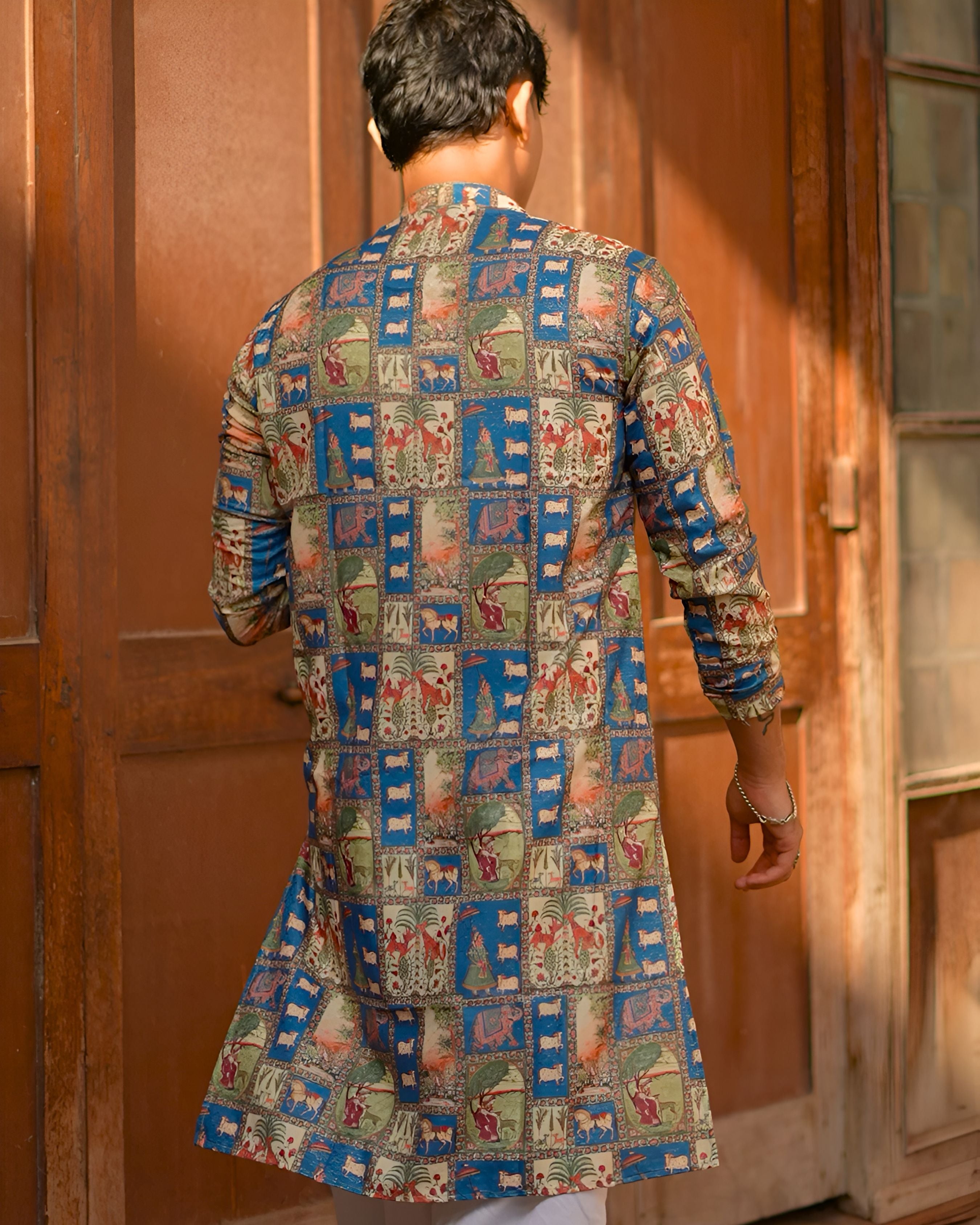 Step into regal tradition with this heritage miniature art print long kurta, inspired by classic Rajasthani paintings. 🎨 The print showcases royal figures, cows, and nature motifs in earthy tones against a navy and cream base, creating a kurta that feels both artistic and festive. ✨ With a mandarin collar and full sleeves, it brings together elegance, comfort, and cultural pride. ✅ Perfect for weddings, cultural events, and festive occasions, this kurta is a true celebration of heritage fashion.