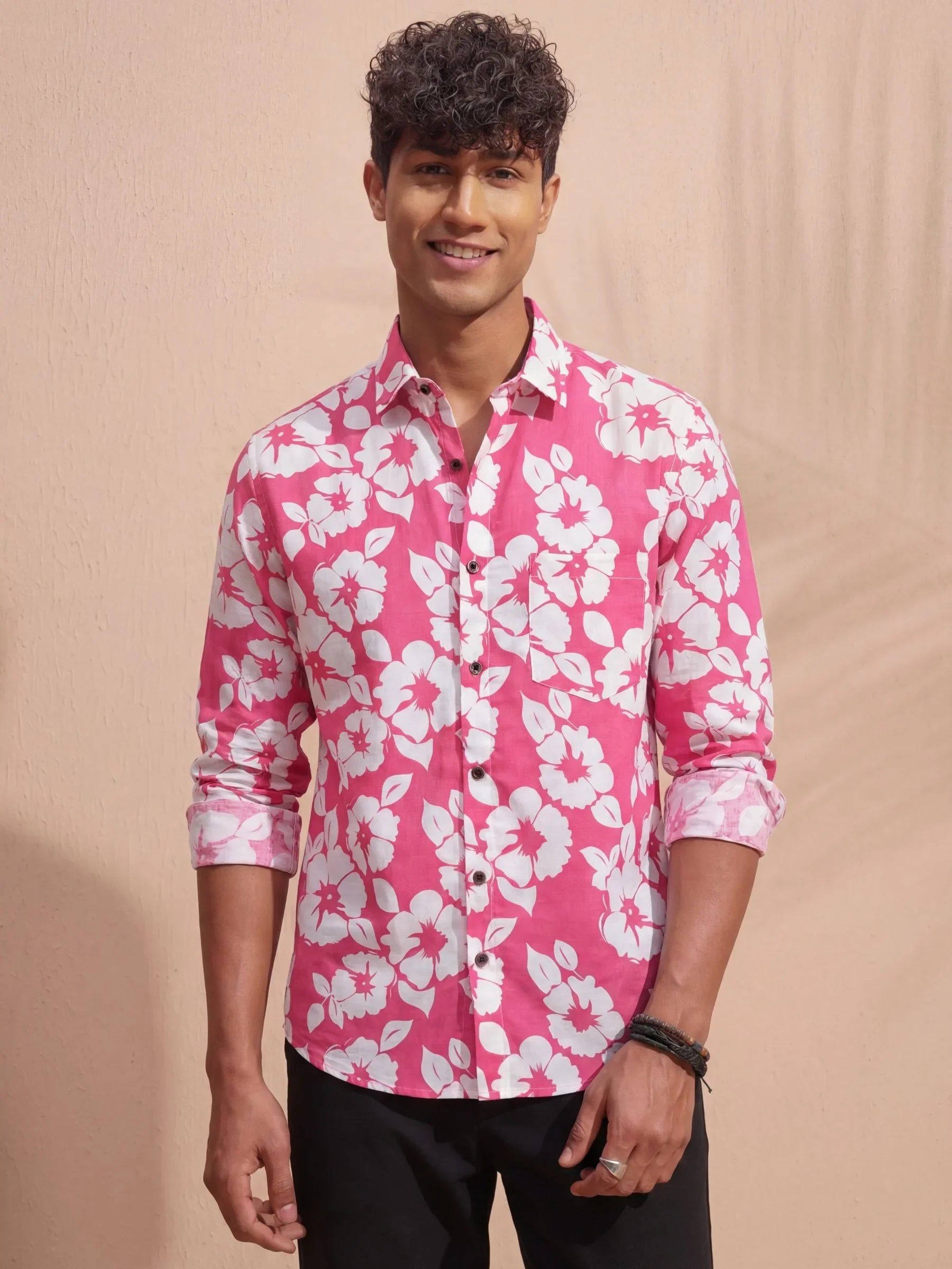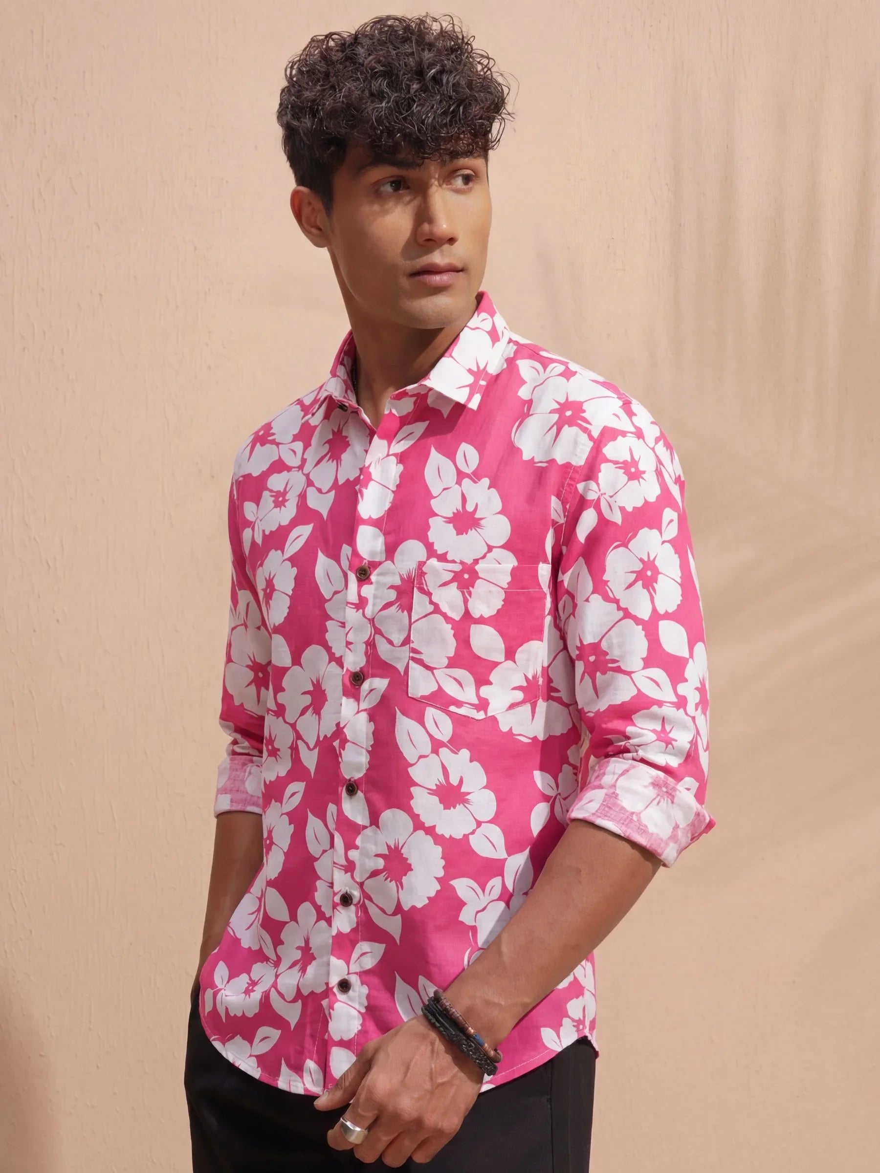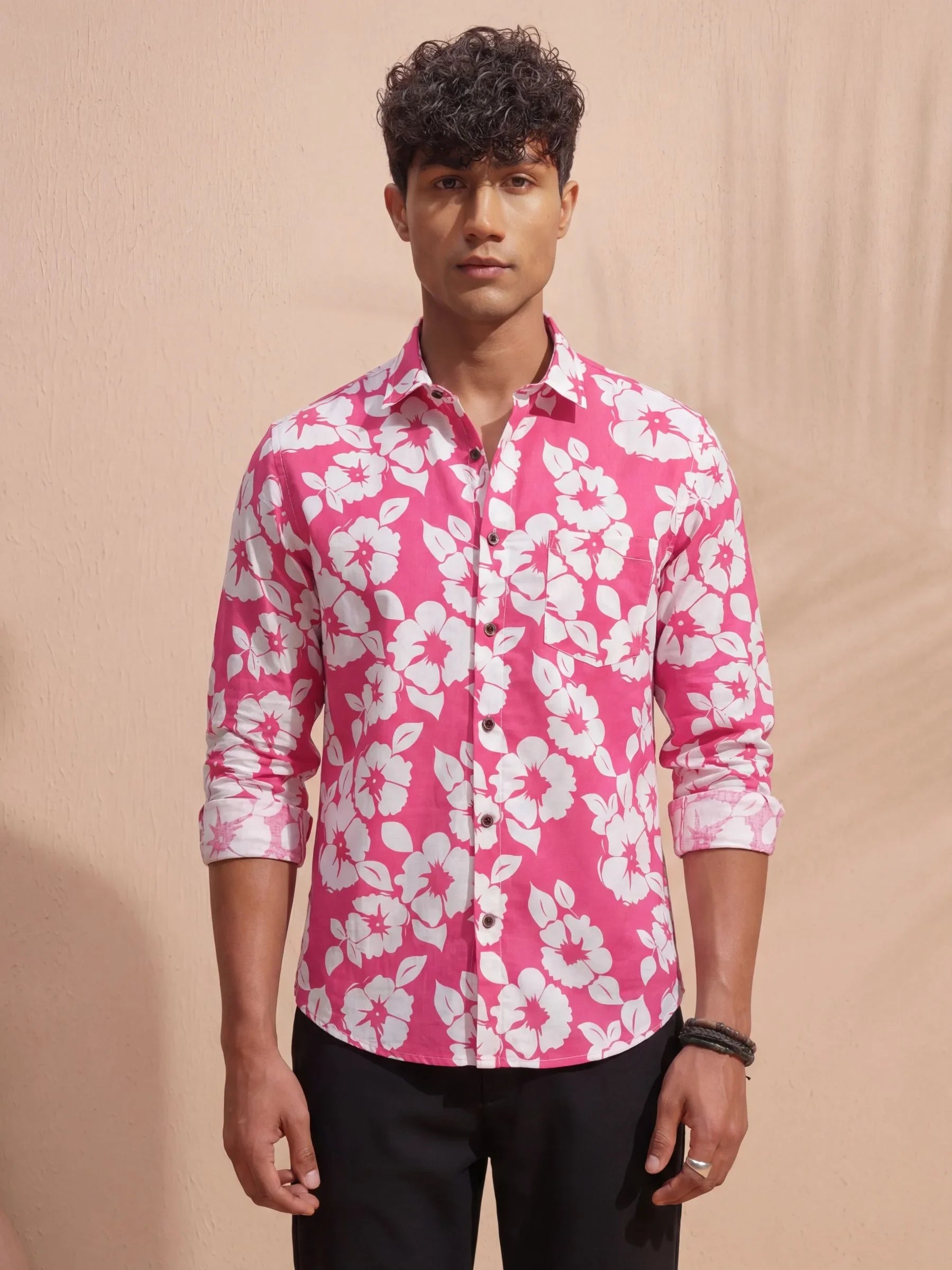 Bring tropical drama to your style with the Hibiscus Heat shirt by Jaipuri Crown. Featuring oversized ivory hibiscus and leaf silhouettes over a rich rose pink base, this full sleeve shirt blends island boldness with refined tailoring. Crafted in our premium satin blend fabric, it’s lightweight, soft, and adds just the right amount of shine for any occasion.