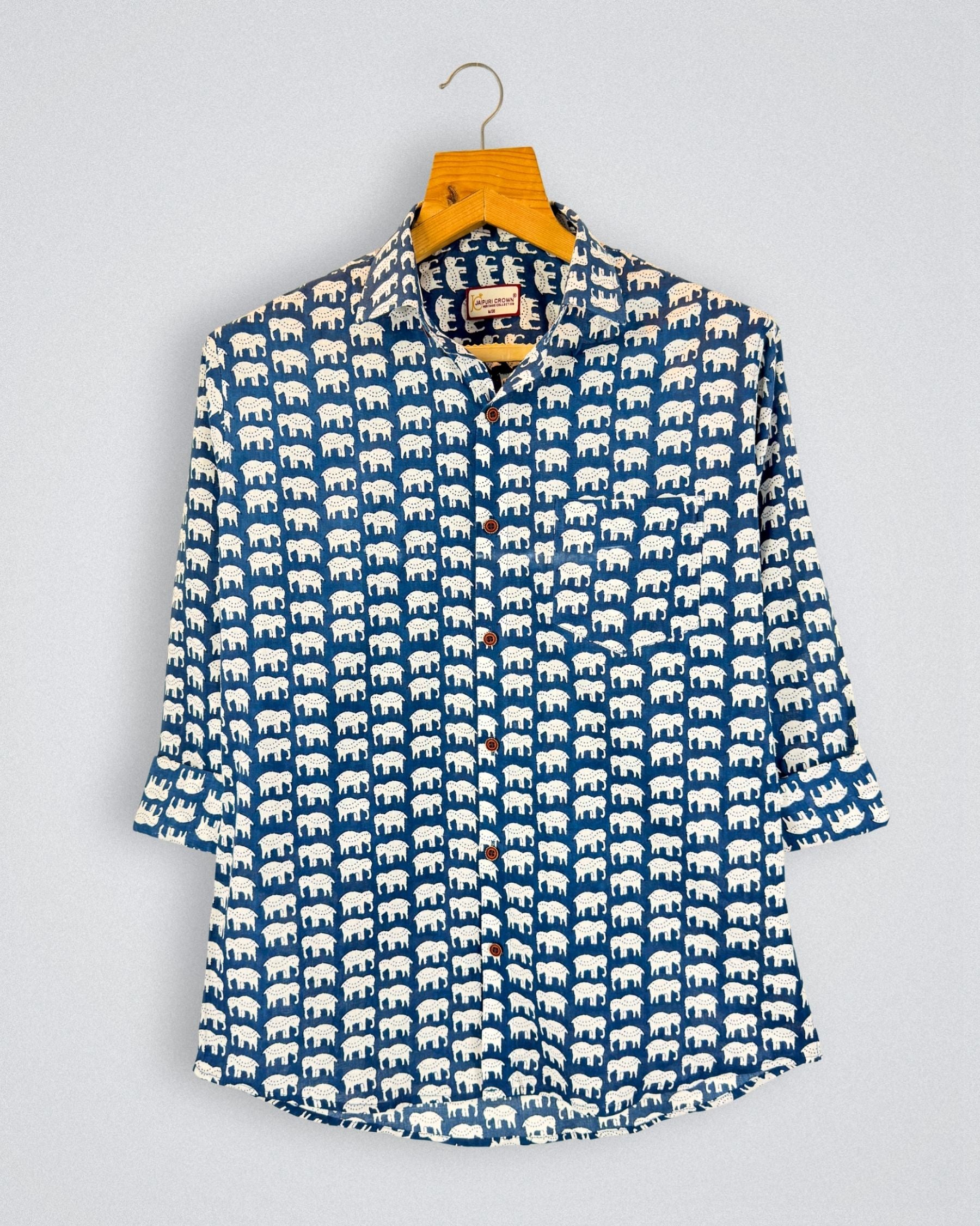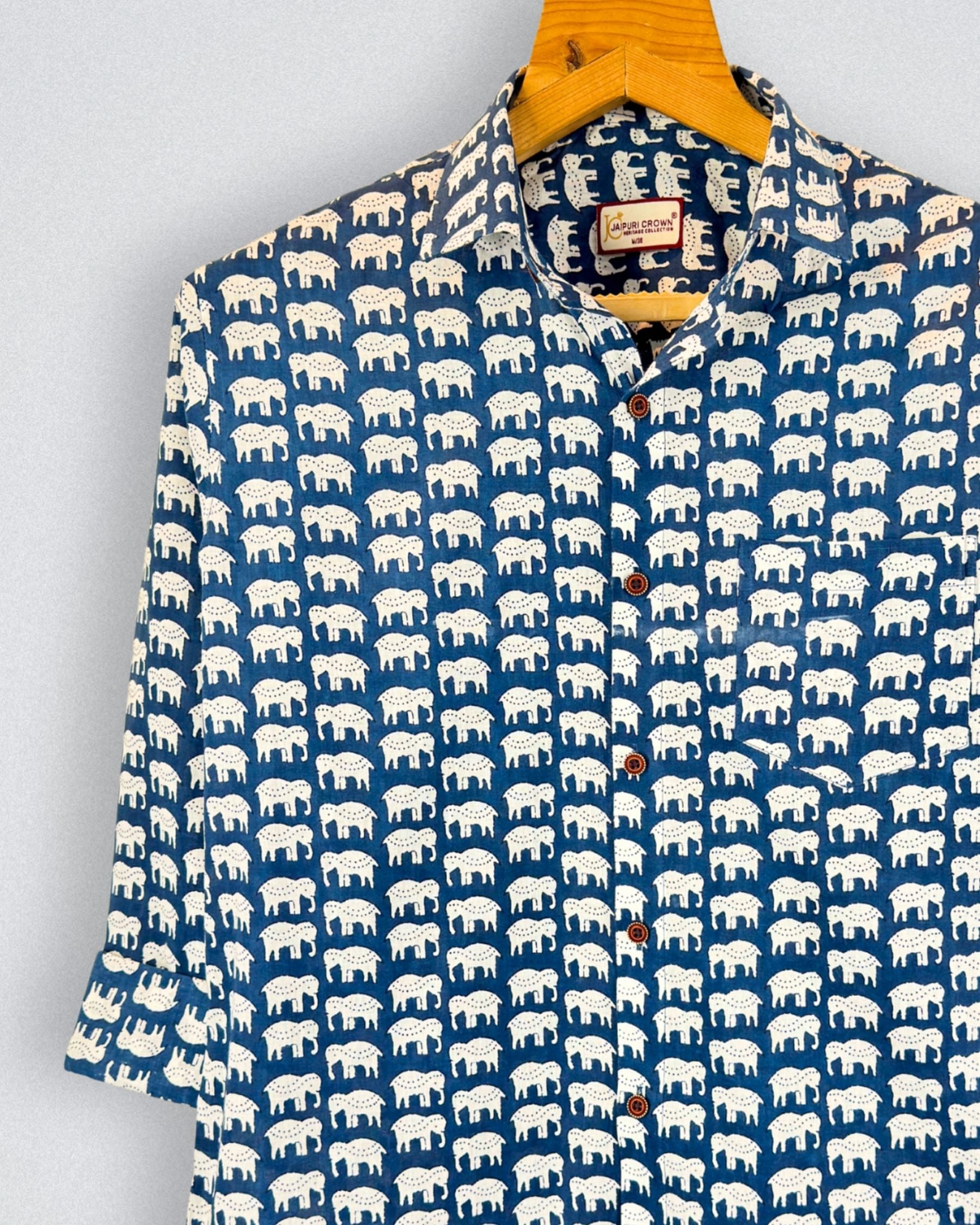 Add a unique flair to your wardrobe with the Indigo Haathi Caravan by Jaipuri Crown – a striking Full Sleeve cotton shirt featuring an eye-catching elephant print in white on a rich navy background. Made from 100% breathable cotton, this shirt ensures comfort for all-day wear, making it a perfect choice for casual outings, gatherings, or relaxed weekends.
