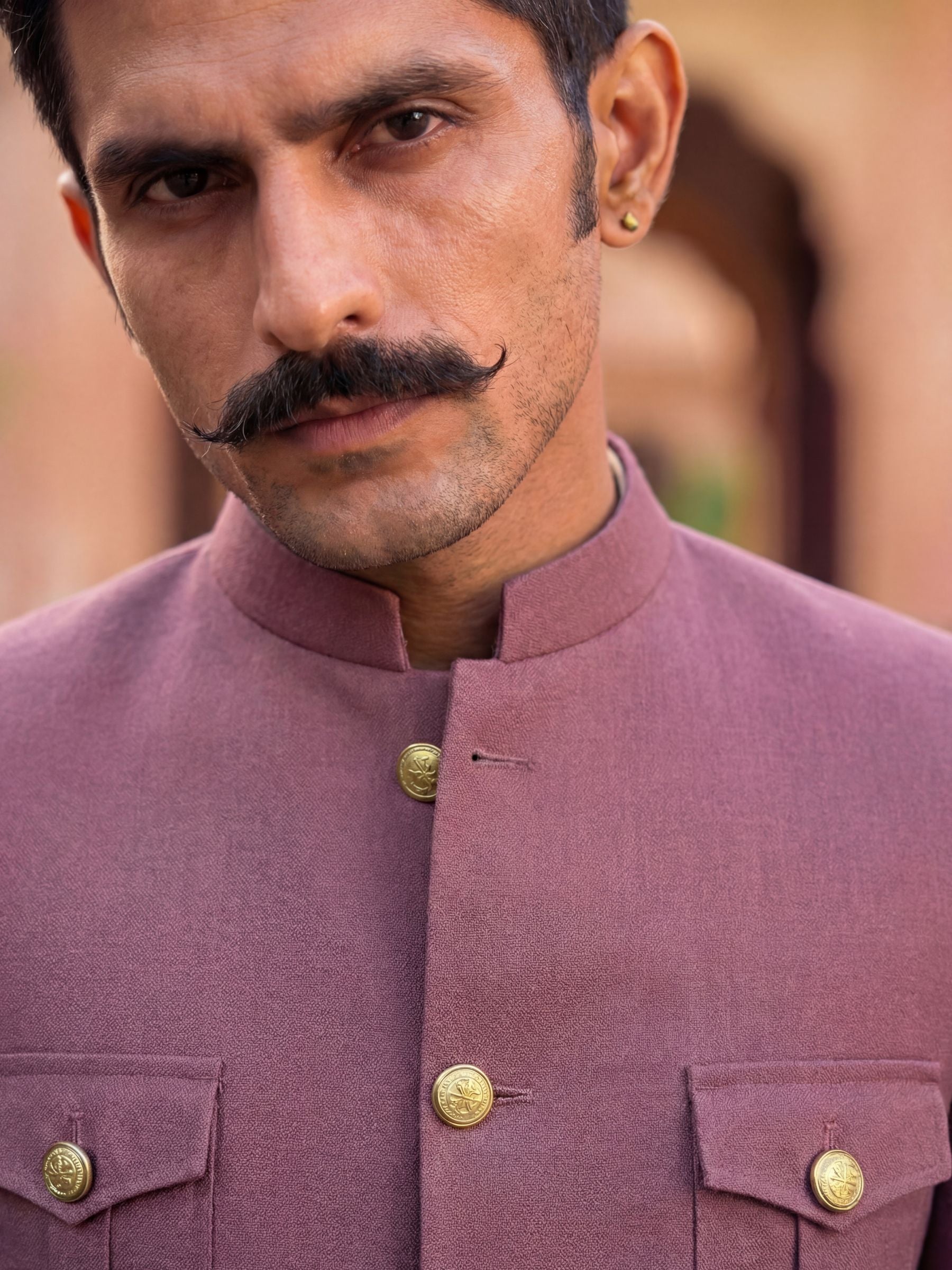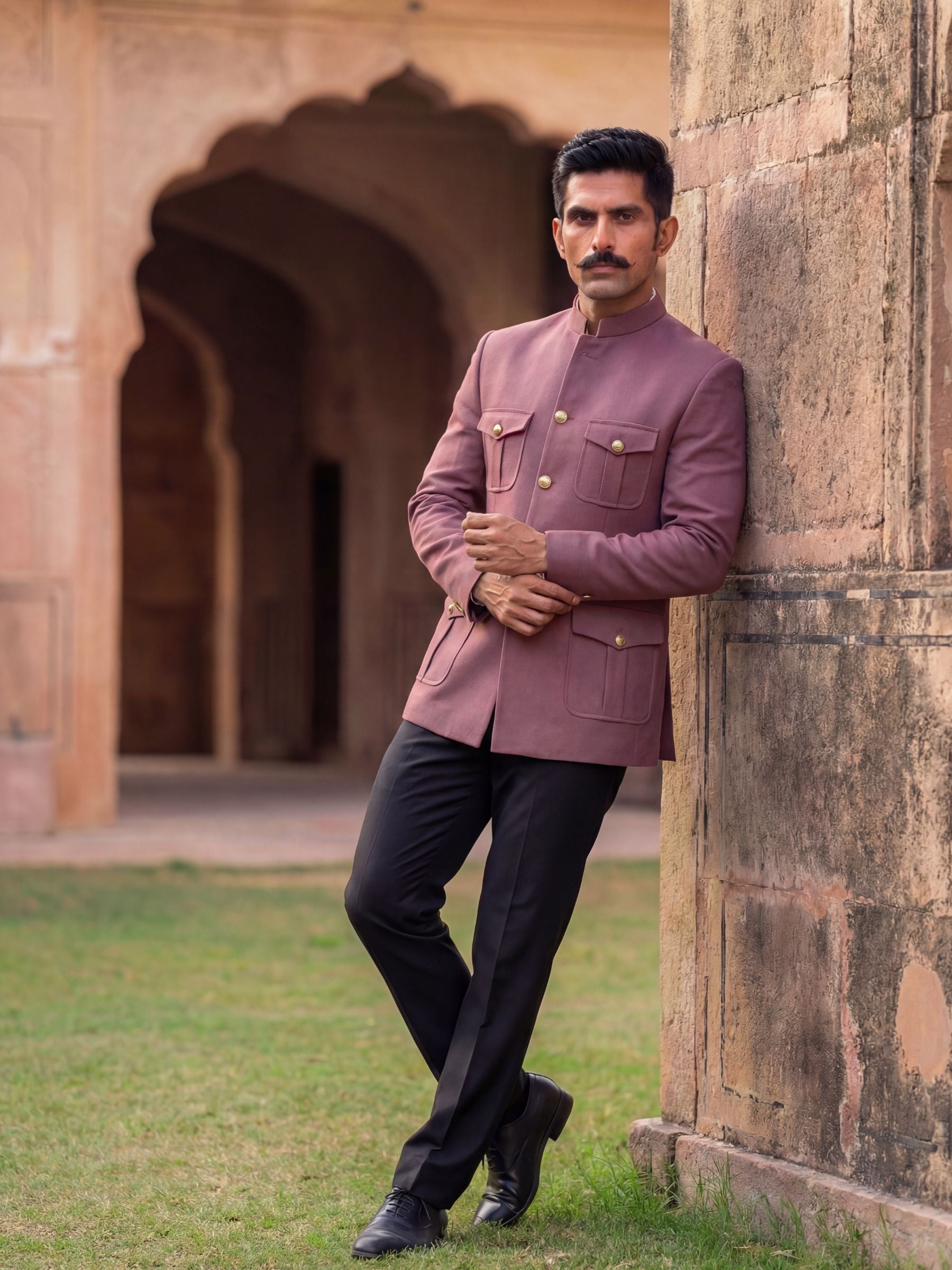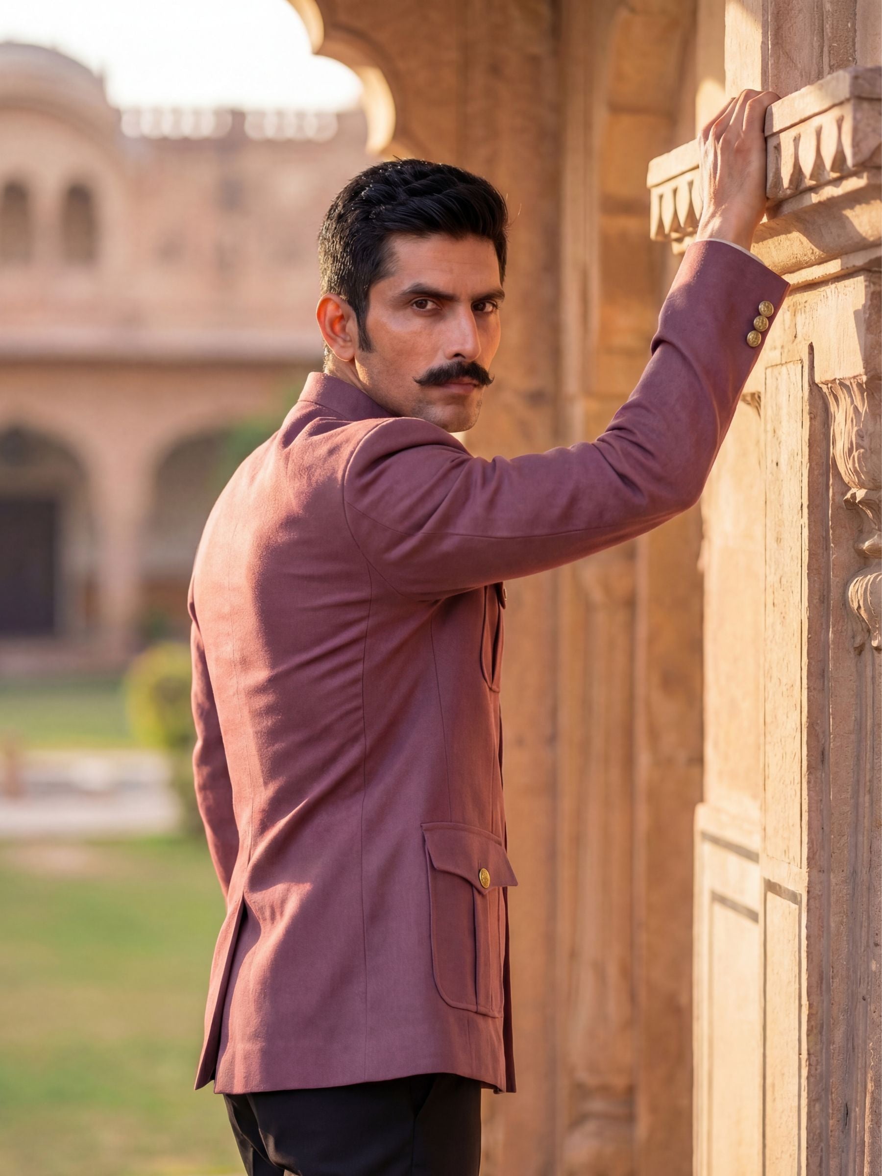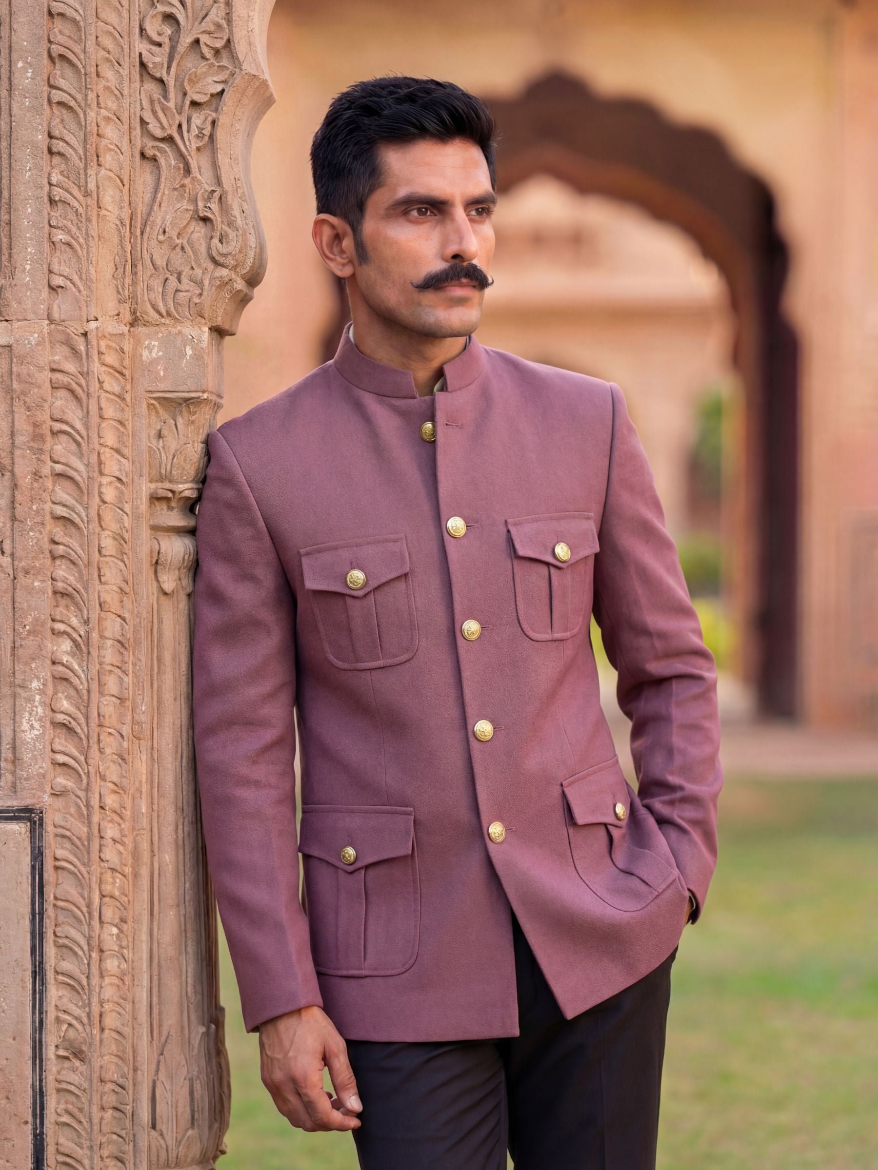 This Dusty Pink Crepe Jodhpuri Bandhgala by Jaipuri Crown is the ultimate expression of style, elegance, and sophistication. Crafted in a rich wine hue, inspired by deep purple shades, this Bandhgala is perfect for formal occasions and celebrations where you want to make a bold yet refined statement.