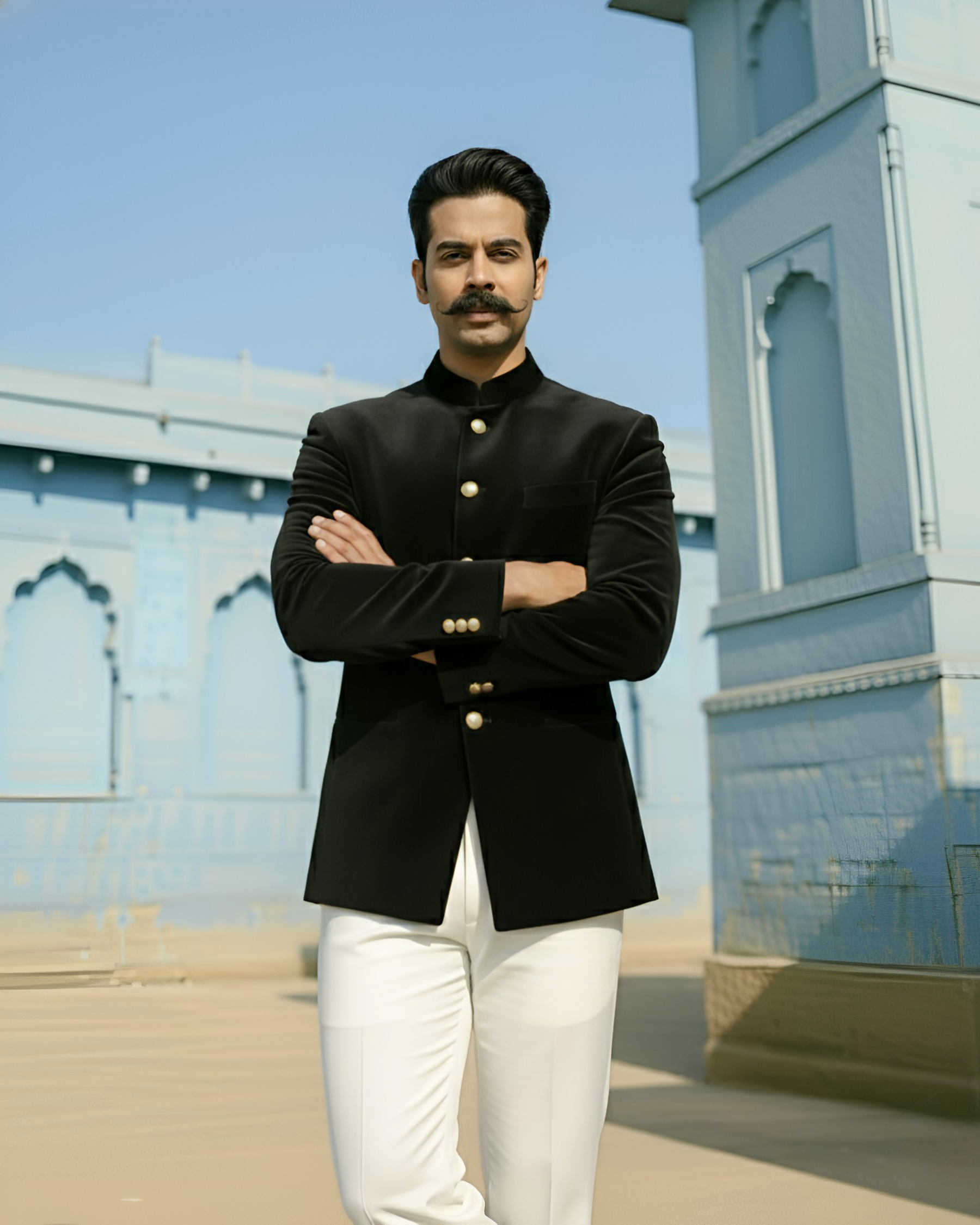 This Black Velvet Jodhpuri Bandhgala by Jaipuri Crown is the ultimate expression of style, elegance, and sophistication. Crafted in a rich wine hue, inspired by deep purple shades, this Bandhgala is perfect for formal occasions and celebrations where you want to make a bold yet refined statement.
