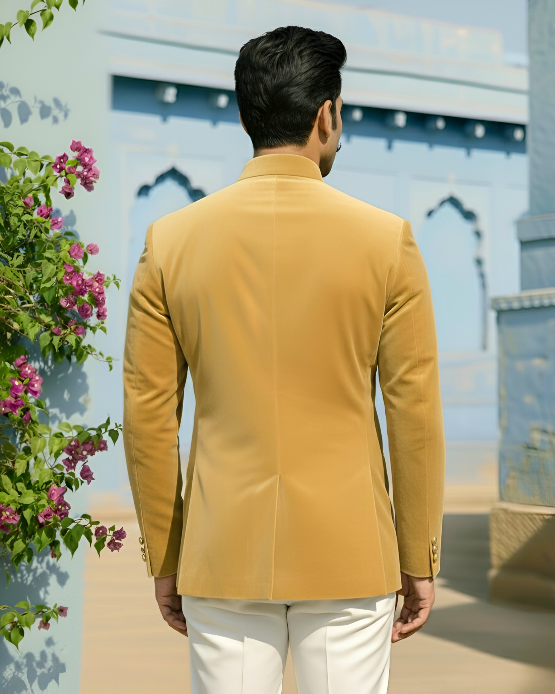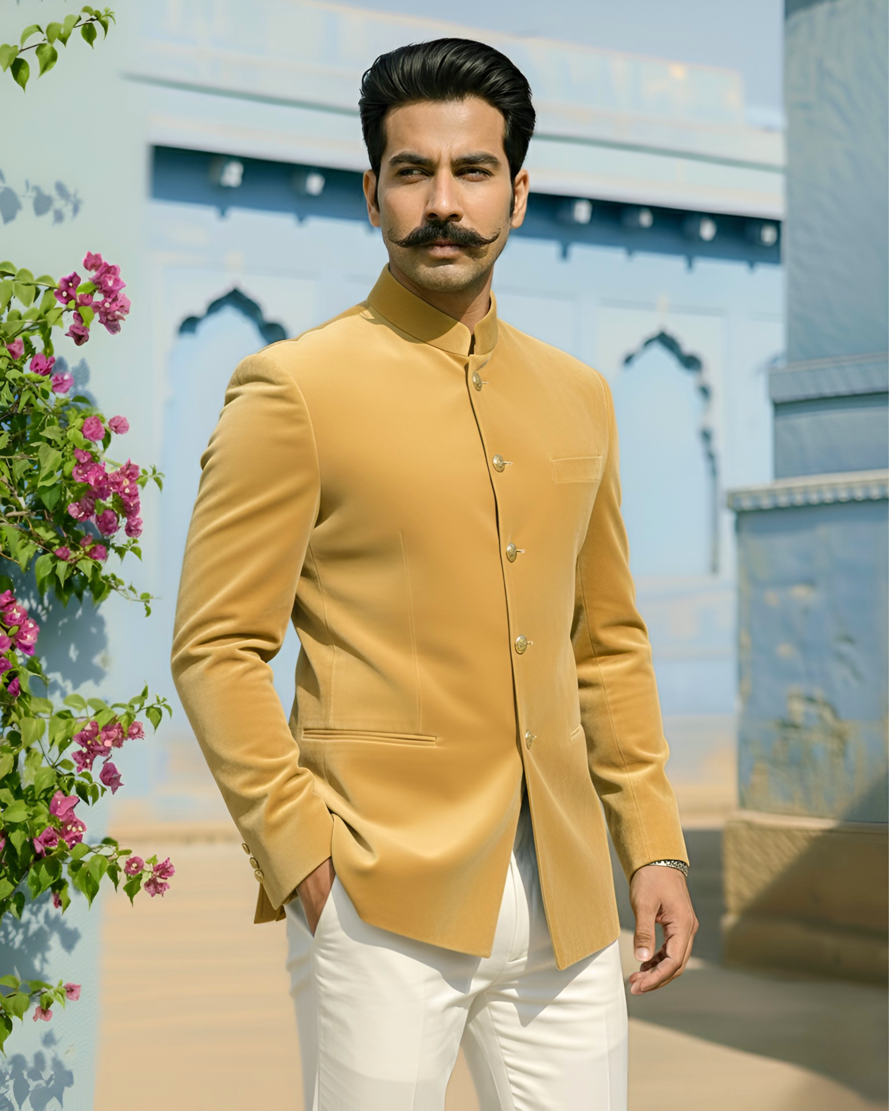 This Camel Velvet Jodhpuri Bandhgala by Jaipuri Crown is the ultimate expression of style, elegance, and sophistication. Crafted in a rich wine hue, inspired by deep purple shades, this Bandhgala is perfect for formal occasions and celebrations where you want to make a bold yet refined statement.