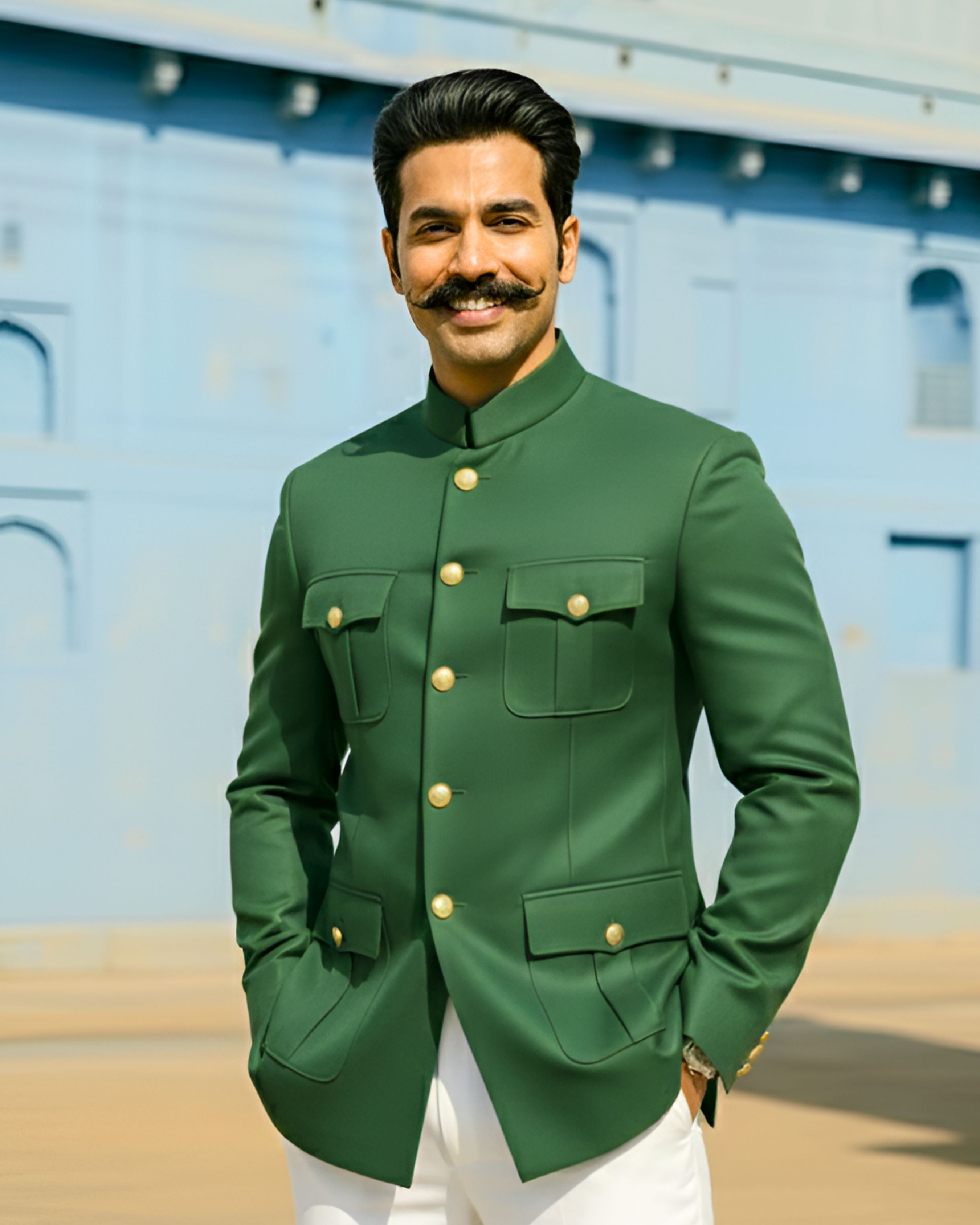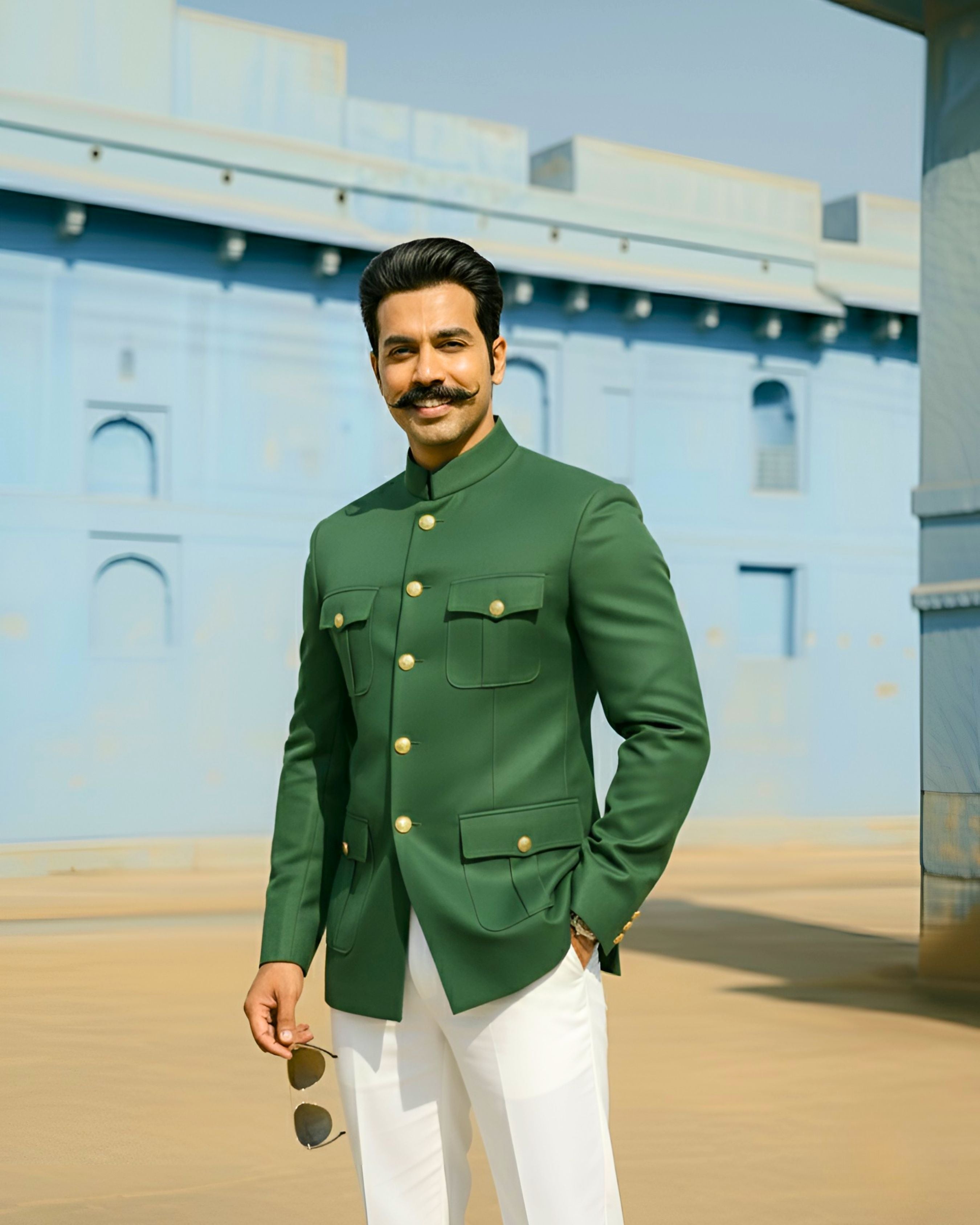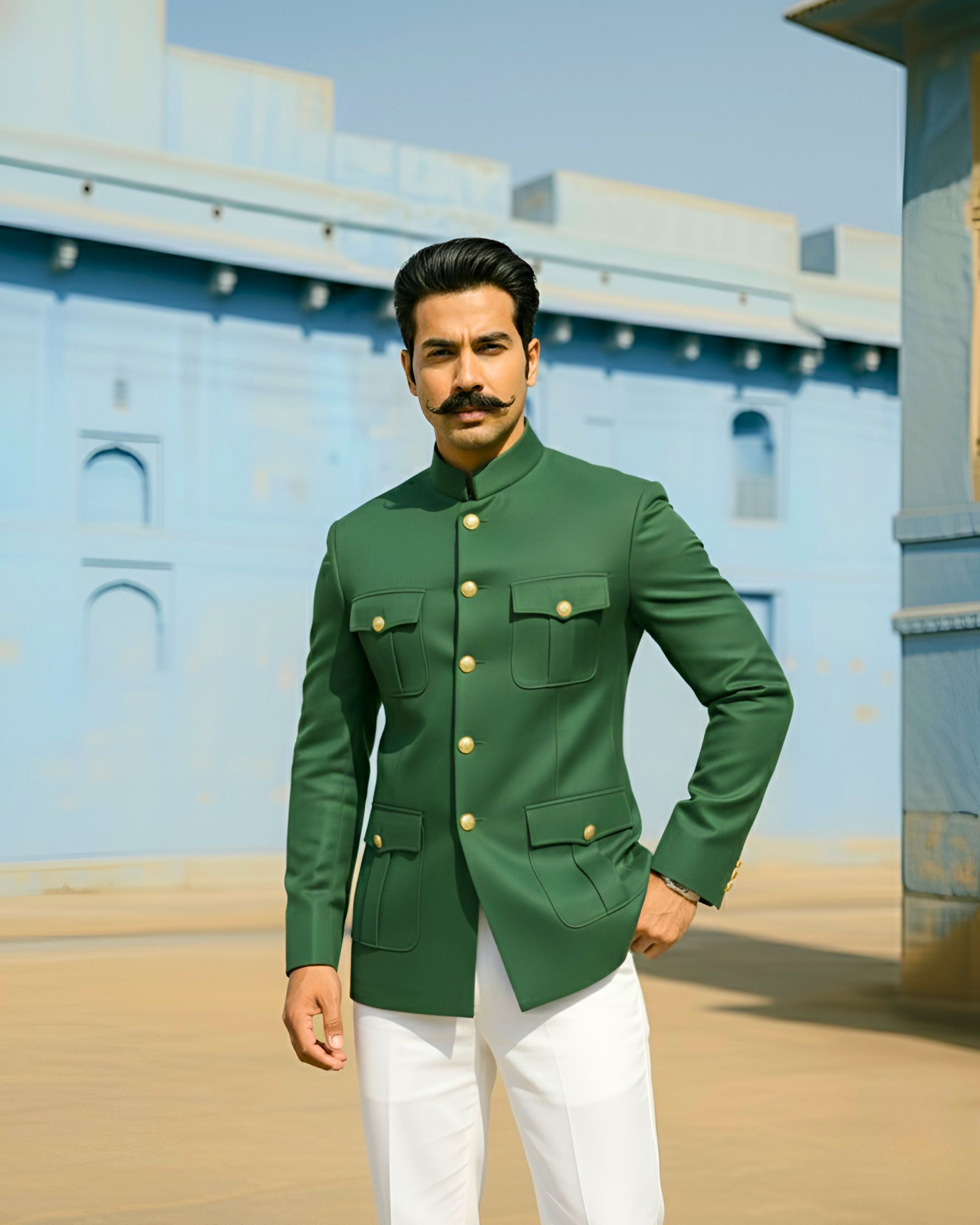 This Dark Green Crepe Jodhpuri Bandhgala by Jaipuri Crown is the ultimate expression of style, elegance, and sophistication. Crafted in a rich wine hue, inspired by deep purple shades, this Bandhgala is perfect for formal occasions and celebrations where you want to make a bold yet refined statement.