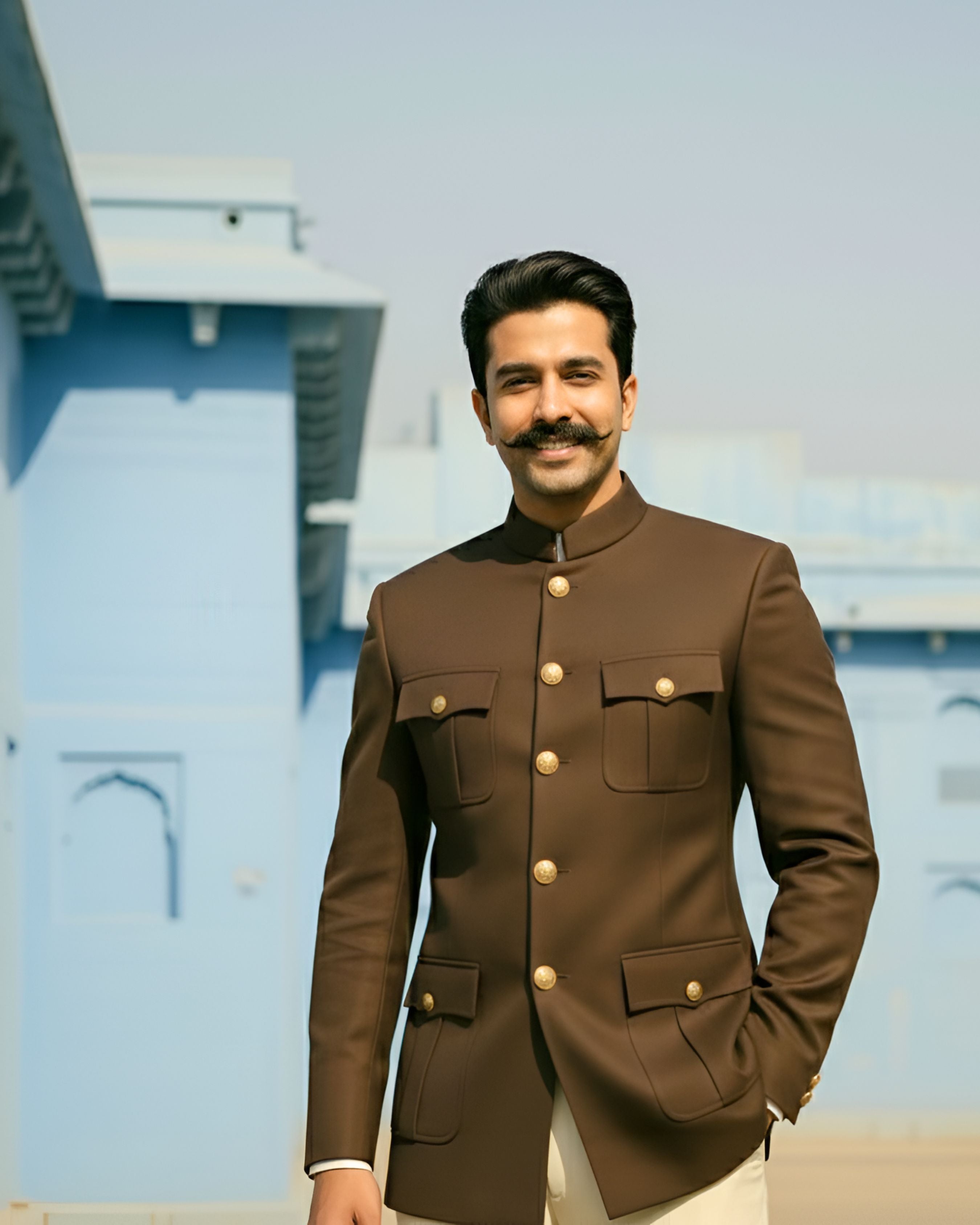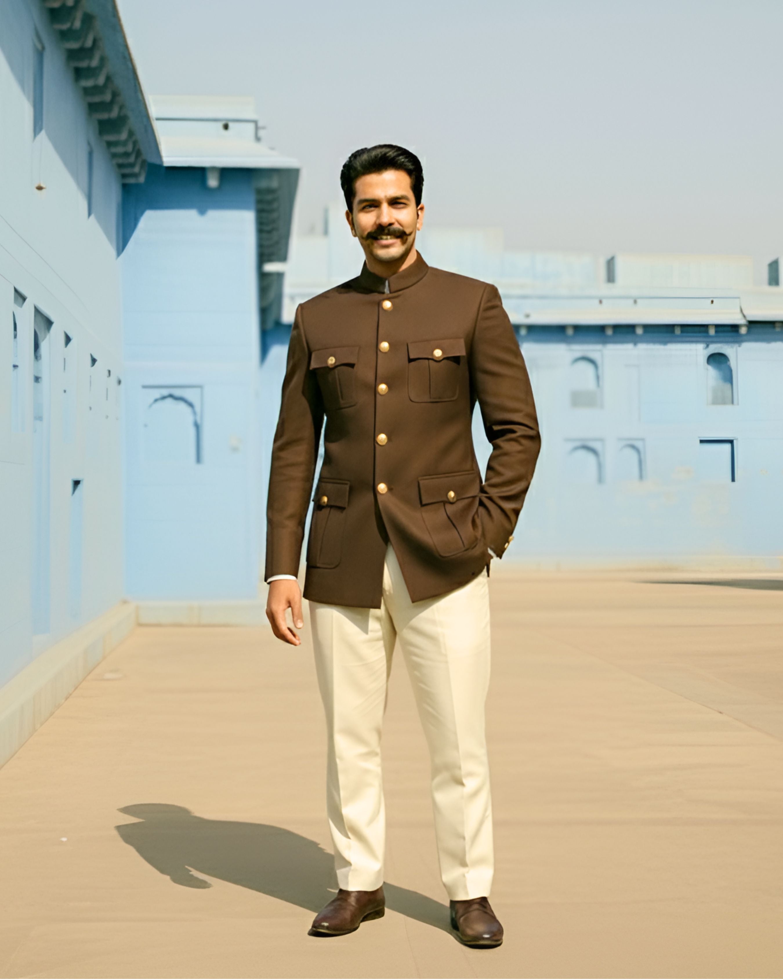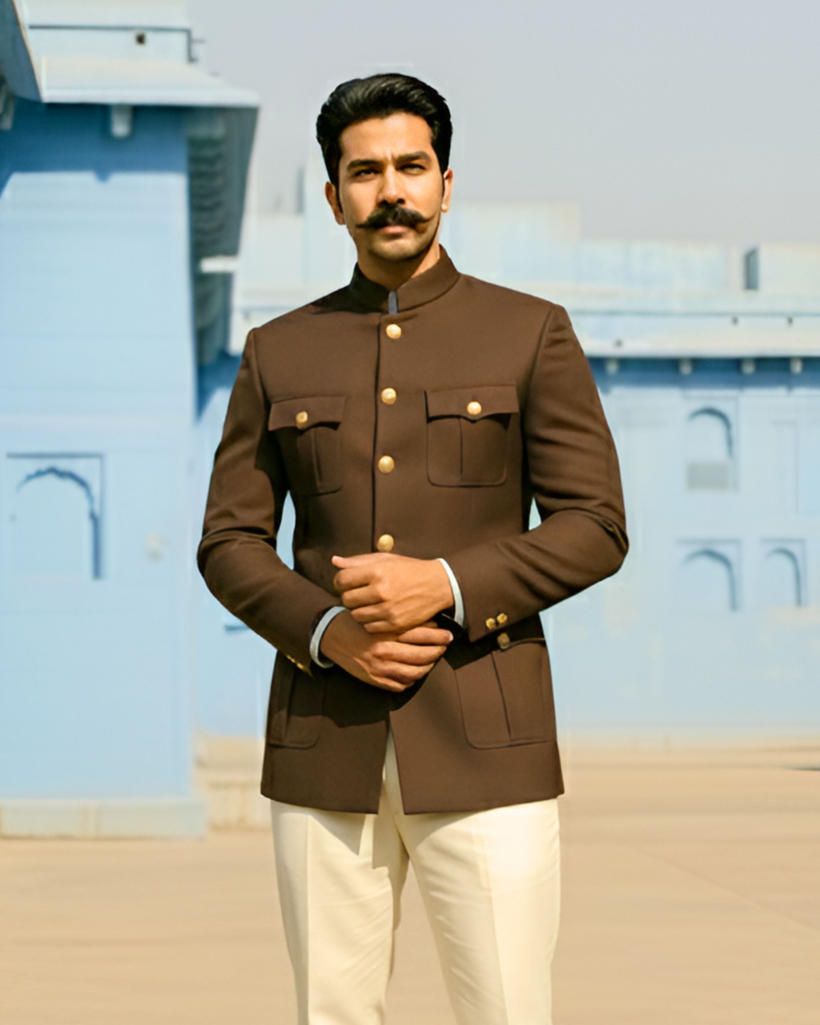 This Dark Coffee Crepe Jodhpuri Bandhgala by Jaipuri Crown is the ultimate expression of style, elegance, and sophistication. Crafted in a rich wine hue, inspired by deep purple shades, this Bandhgala is perfect for formal occasions and celebrations where you want to make a bold yet refined statement.