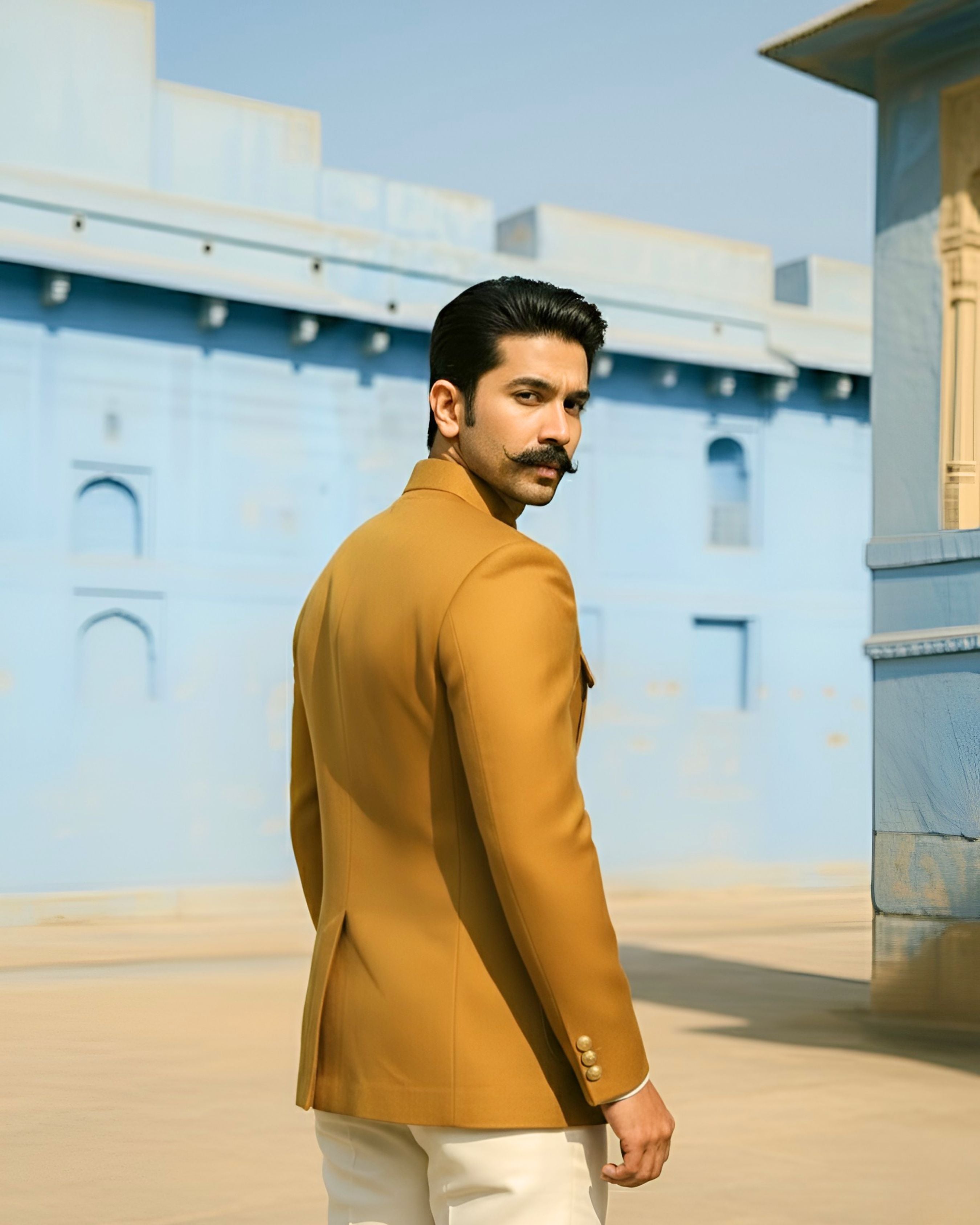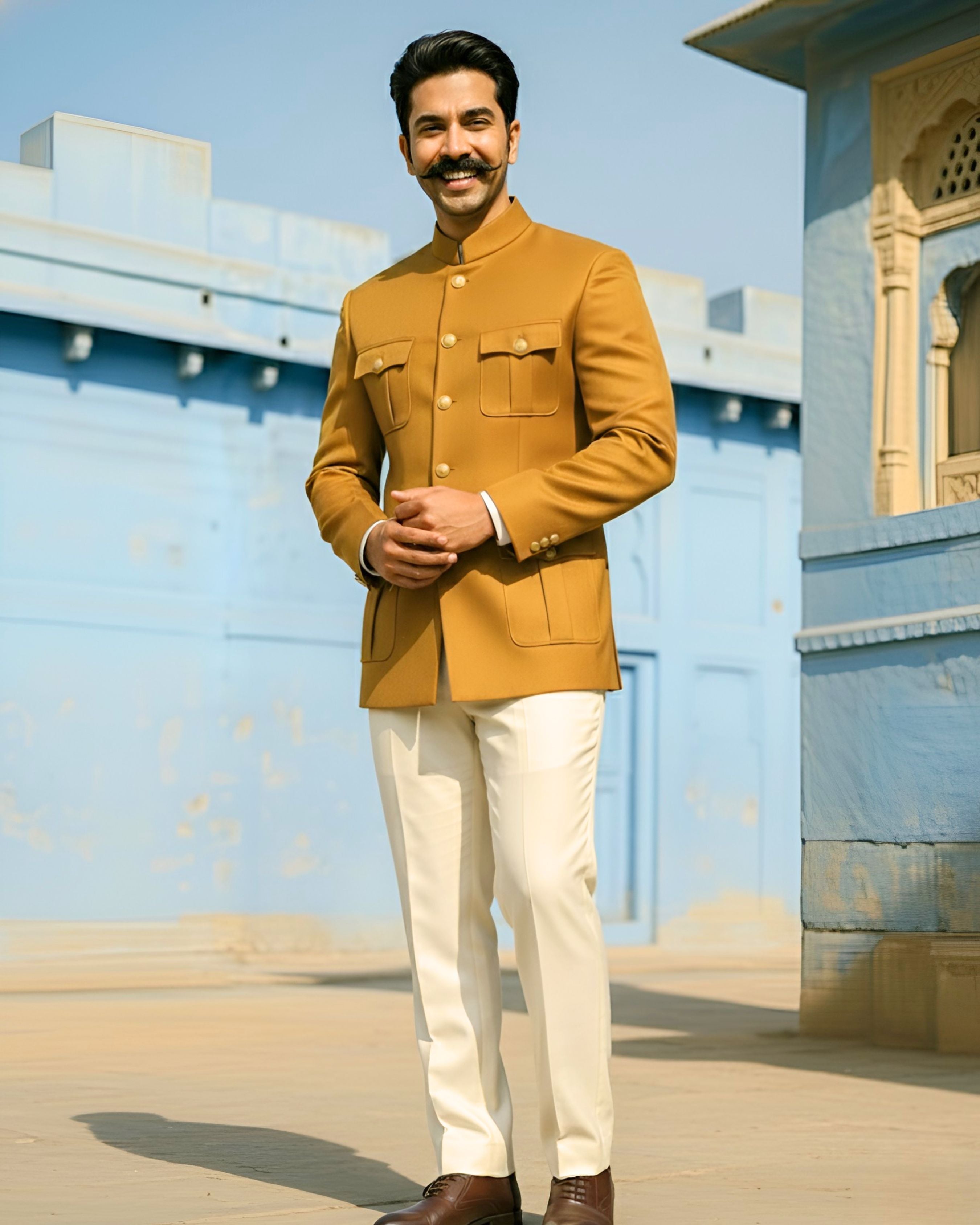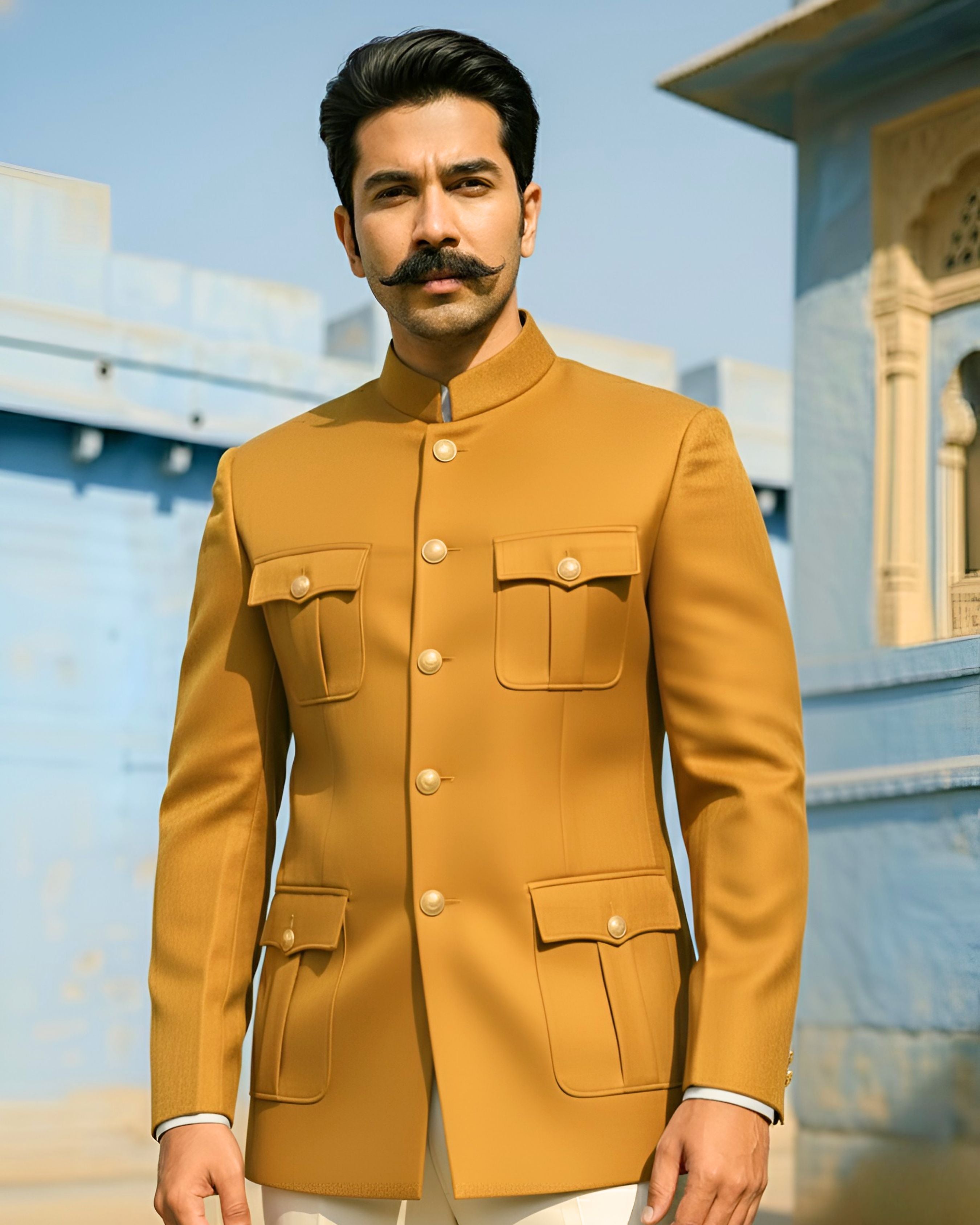 This Dark Mustred Yellow Crepe Jodhpuri Bandhgala by Jaipuri Crown is the ultimate expression of style, elegance, and sophistication. Crafted in a rich wine hue, inspired by deep purple shades, this Bandhgala is perfect for formal occasions and celebrations where you want to make a bold yet refined statement.