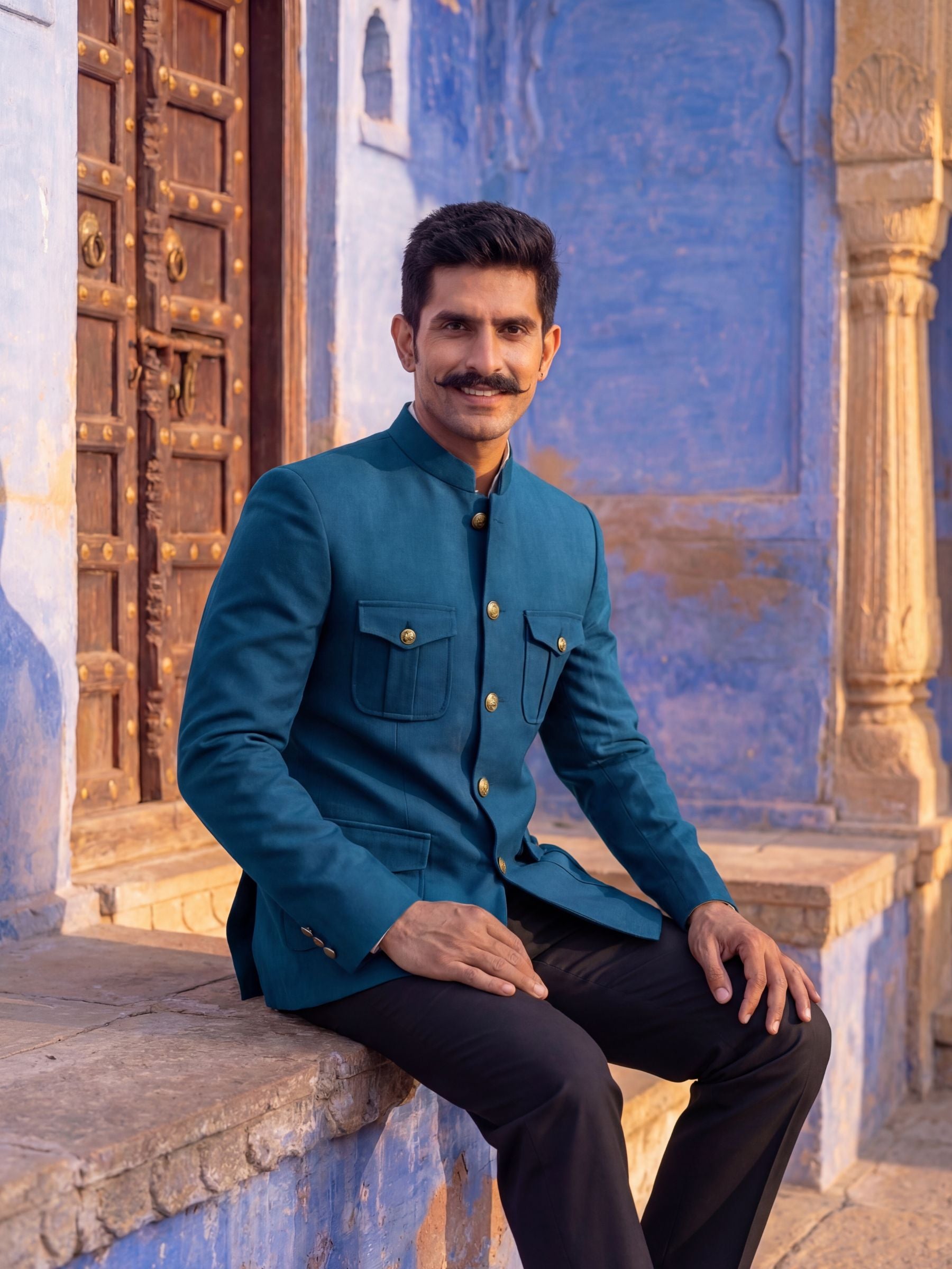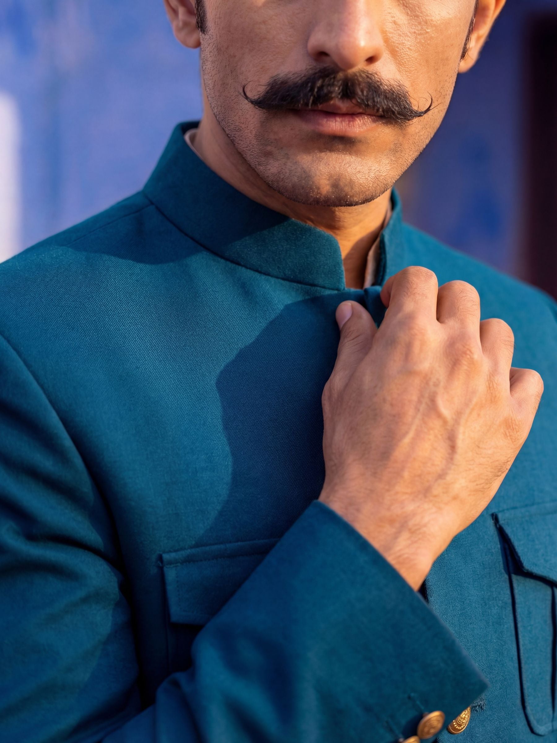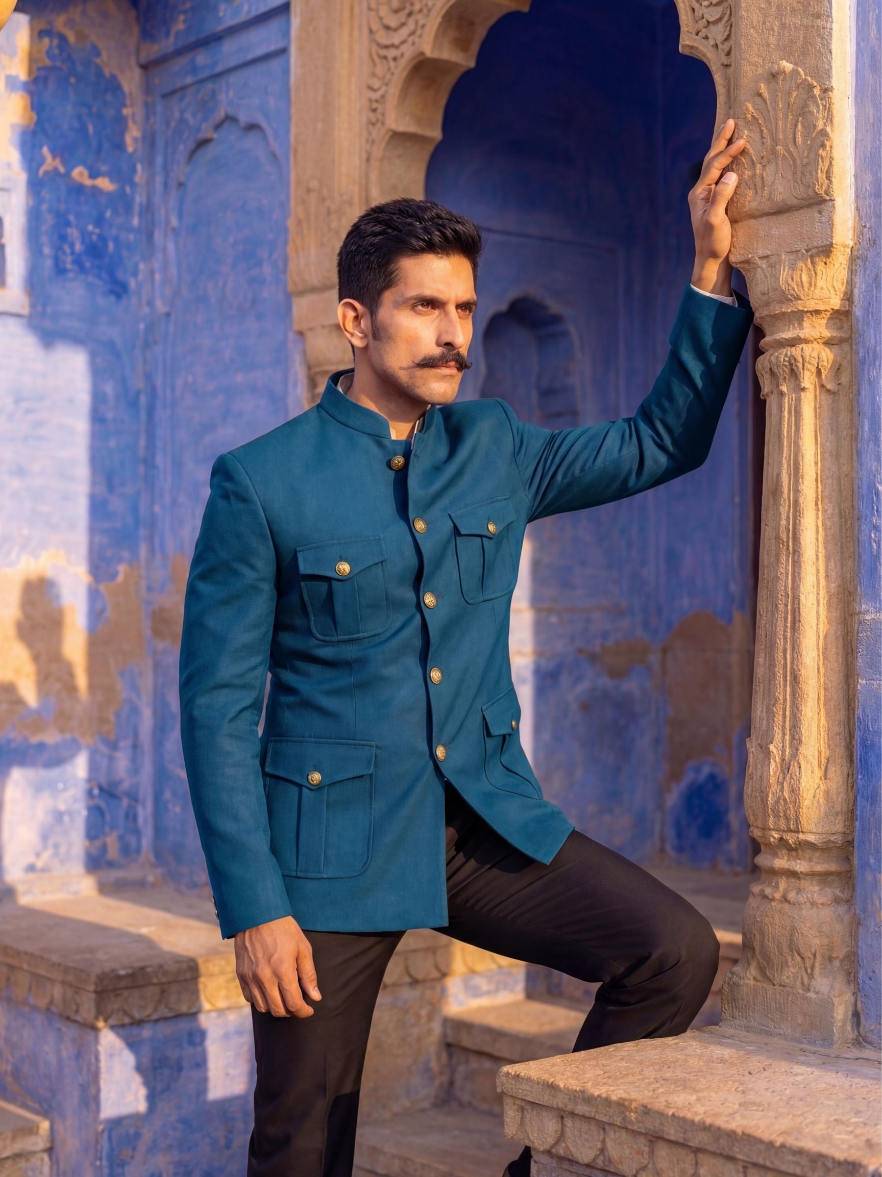 Made from premium Crepe  fabric, this Bandhgala showcases a luxurious texture that enhances its royal appeal. The intricate craftsmanship uses traditional tailoring techniques to ensure durability and strength, while the  adds a touch of comfort with its smooth, lightweight, and breathable quality. A true timeless classic, this piece belongs in every sophisticated wardrobe.