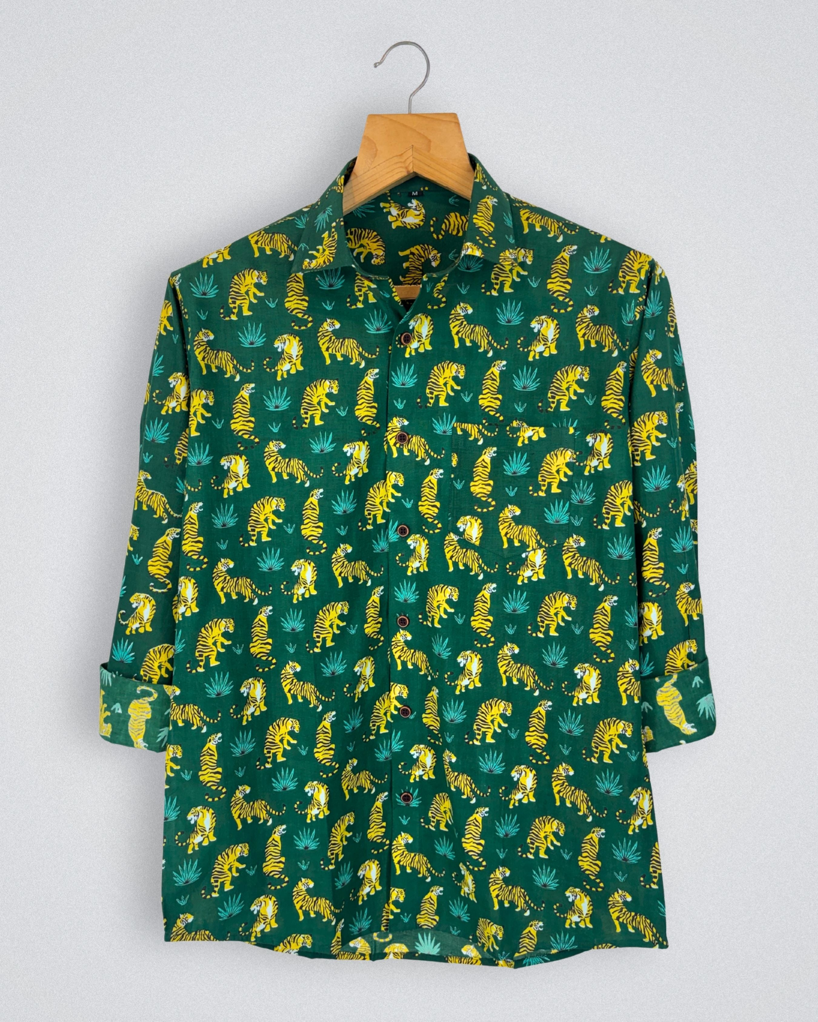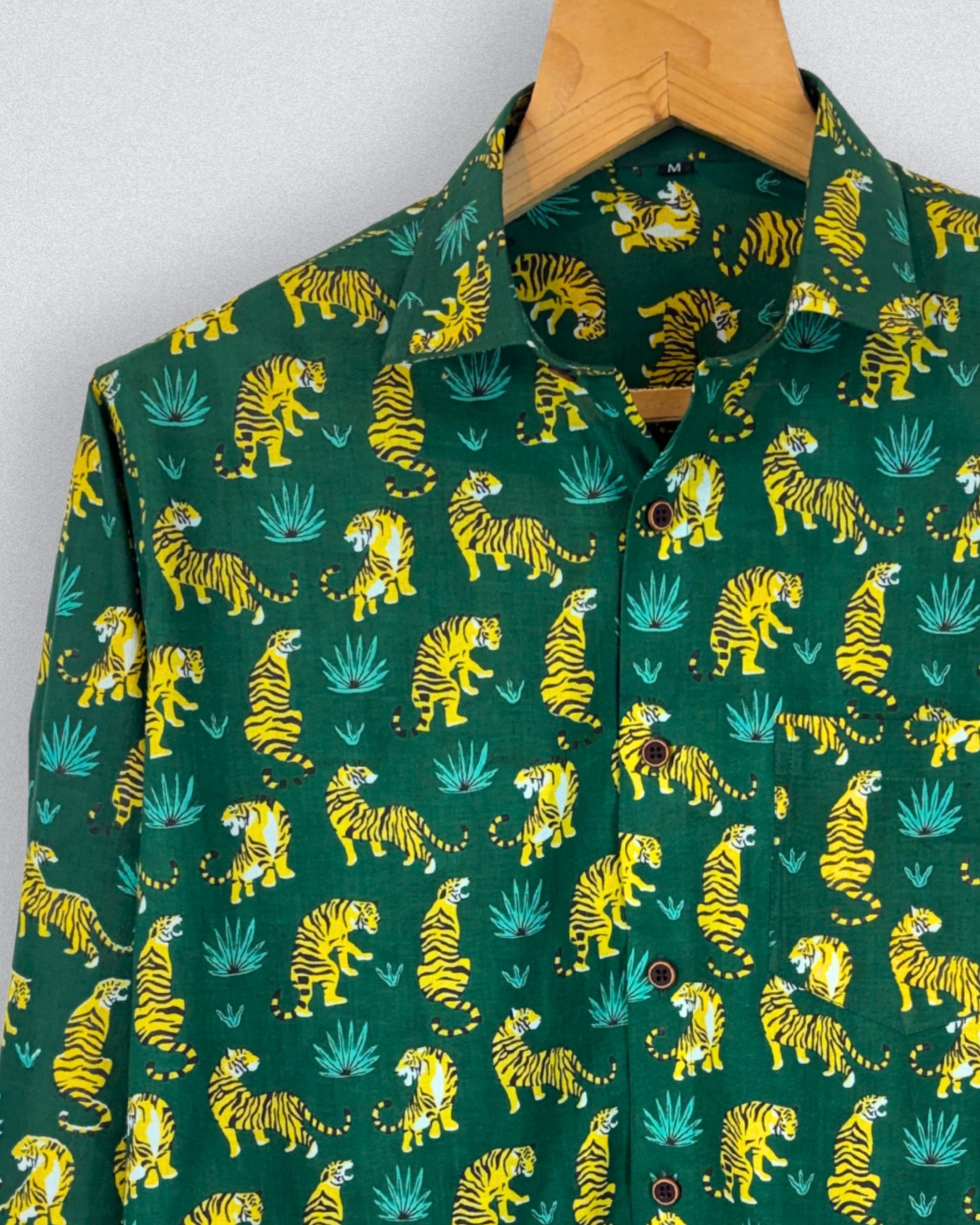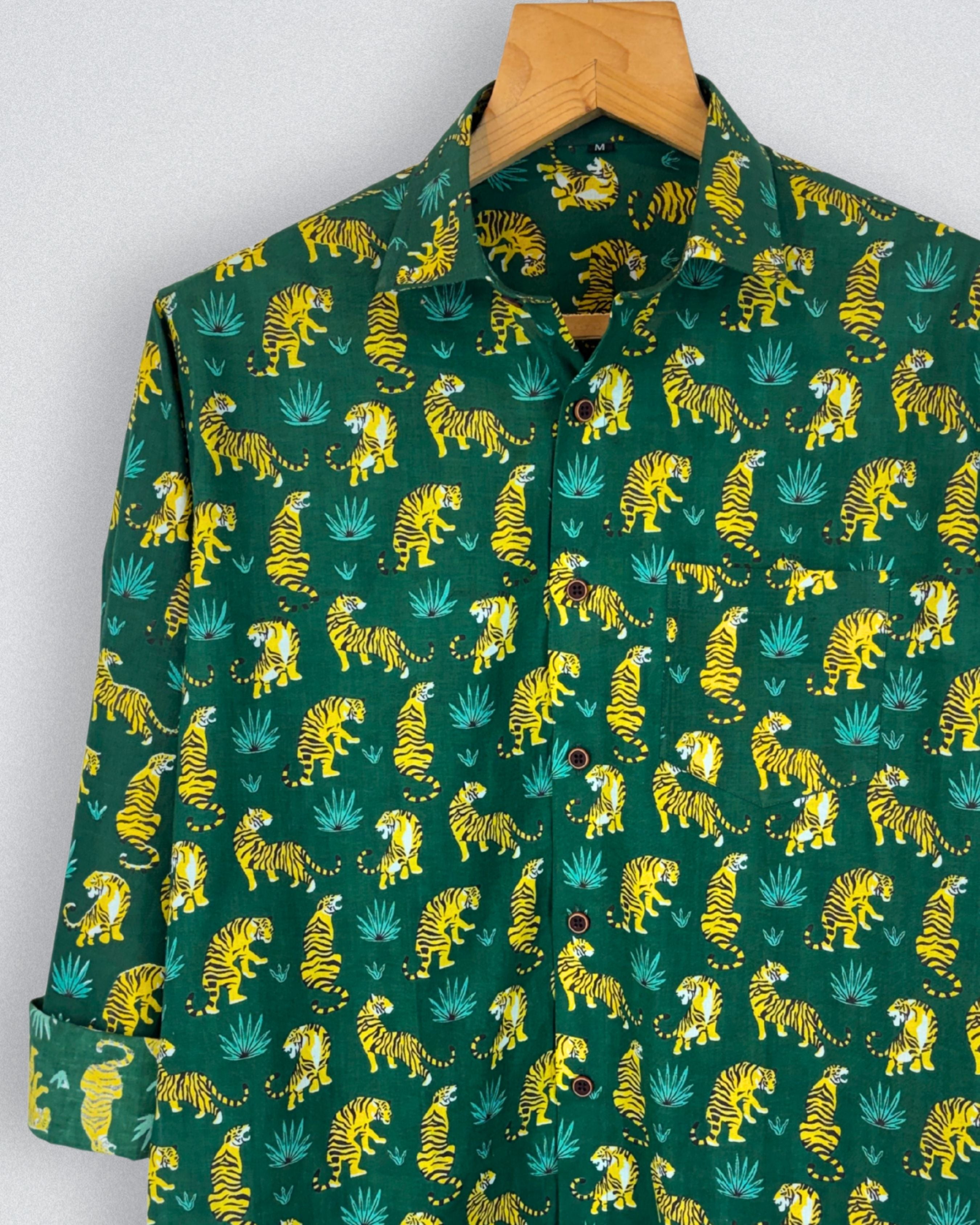 Unleash your wild side with the Tiger Roar by Jaipuri Crown – a captivating Full sleeve cotton shirt featuring a lively tiger print in vibrant yellow against a rich green backdrop. Made from 100% Sanganeri cotton, this shirt ensures a soft, breathable, and comfortable fit, perfect for casual outings, parties, or adventurous weekends.