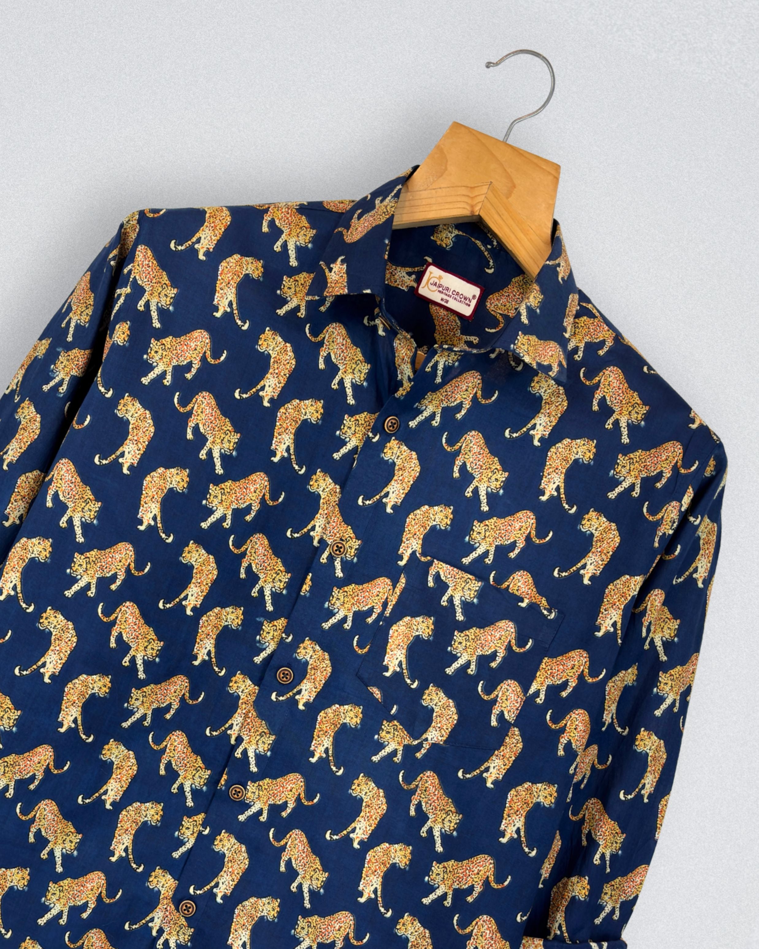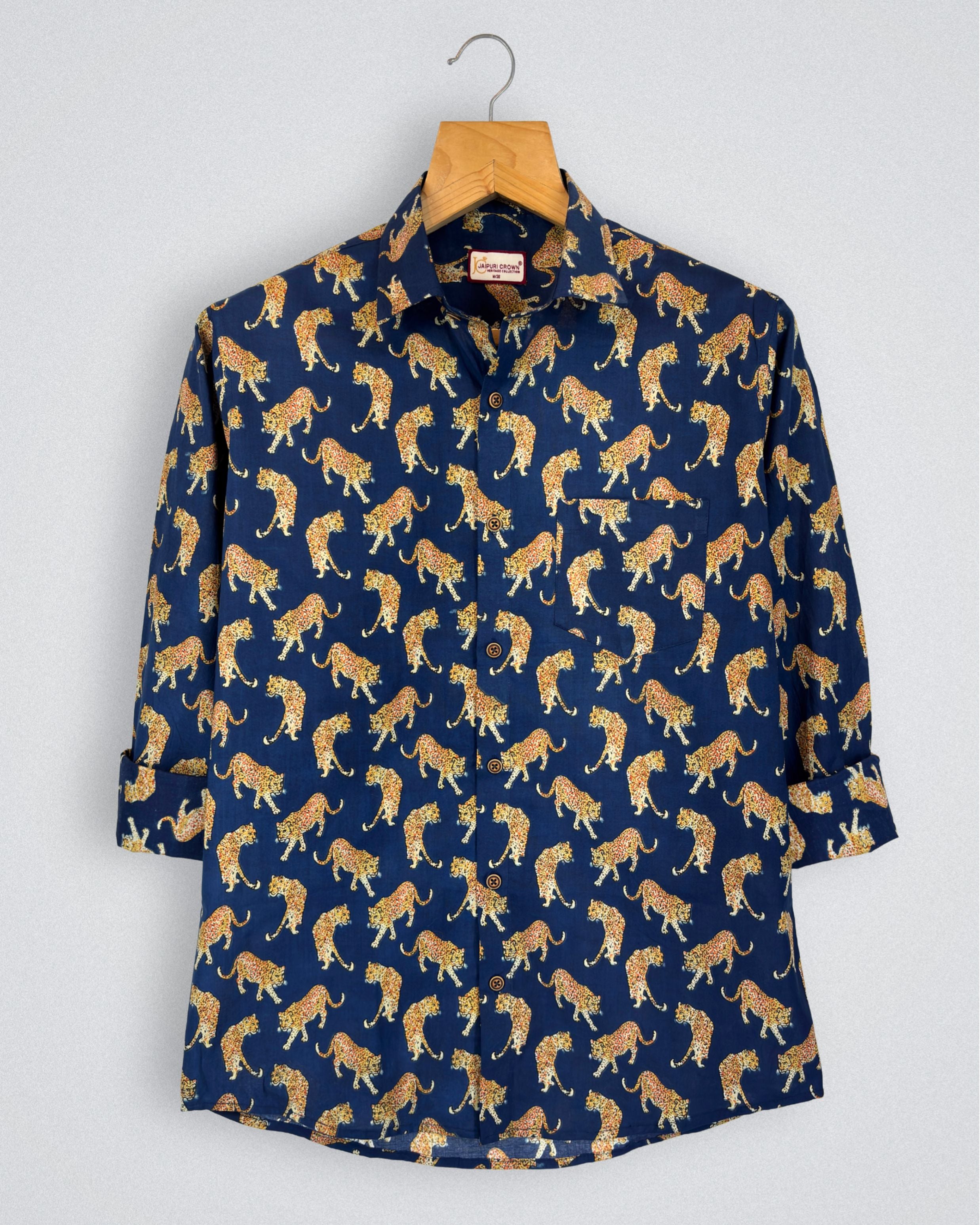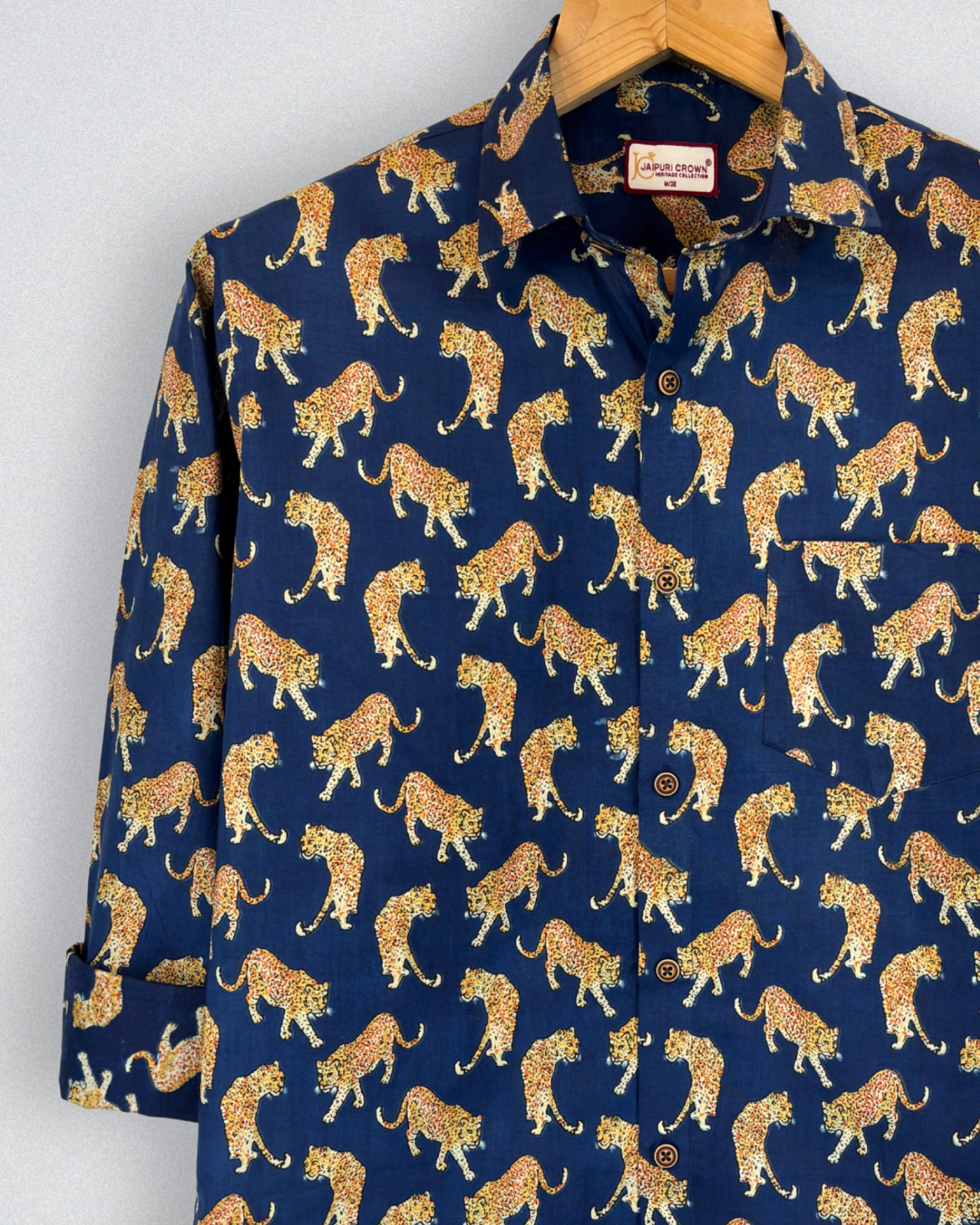 Unleash your wild side with Leopard Roar by Jaipuri Crown – a striking full sleeve cotton shirt featuring an eye-catching leopard print in vibrant hues against a deep navy background. Made from 100% Sanganeri cotton, this shirt provides a soft and breathable feel, making it an ideal choice for casual gatherings, weekend outings, or even dressy events.