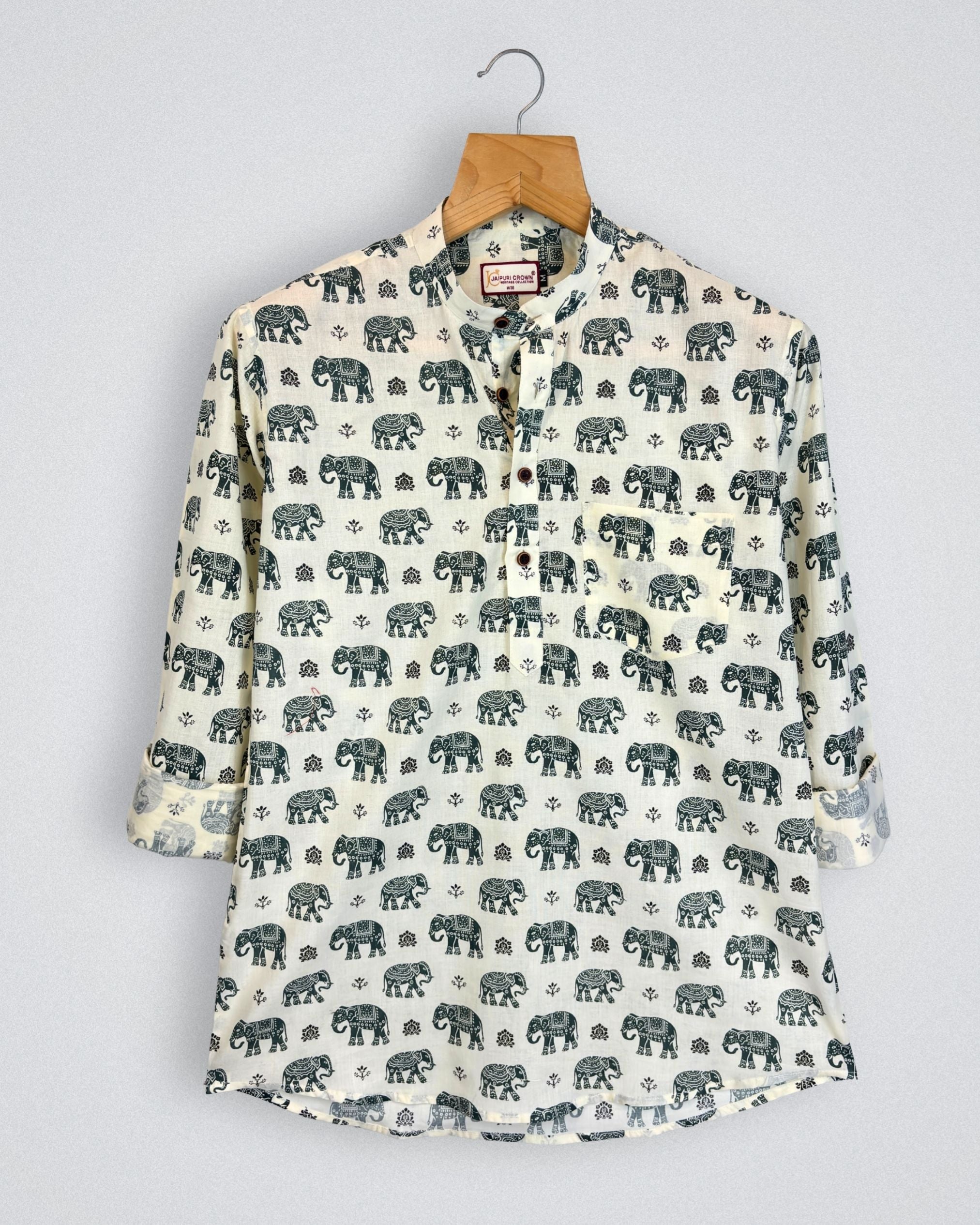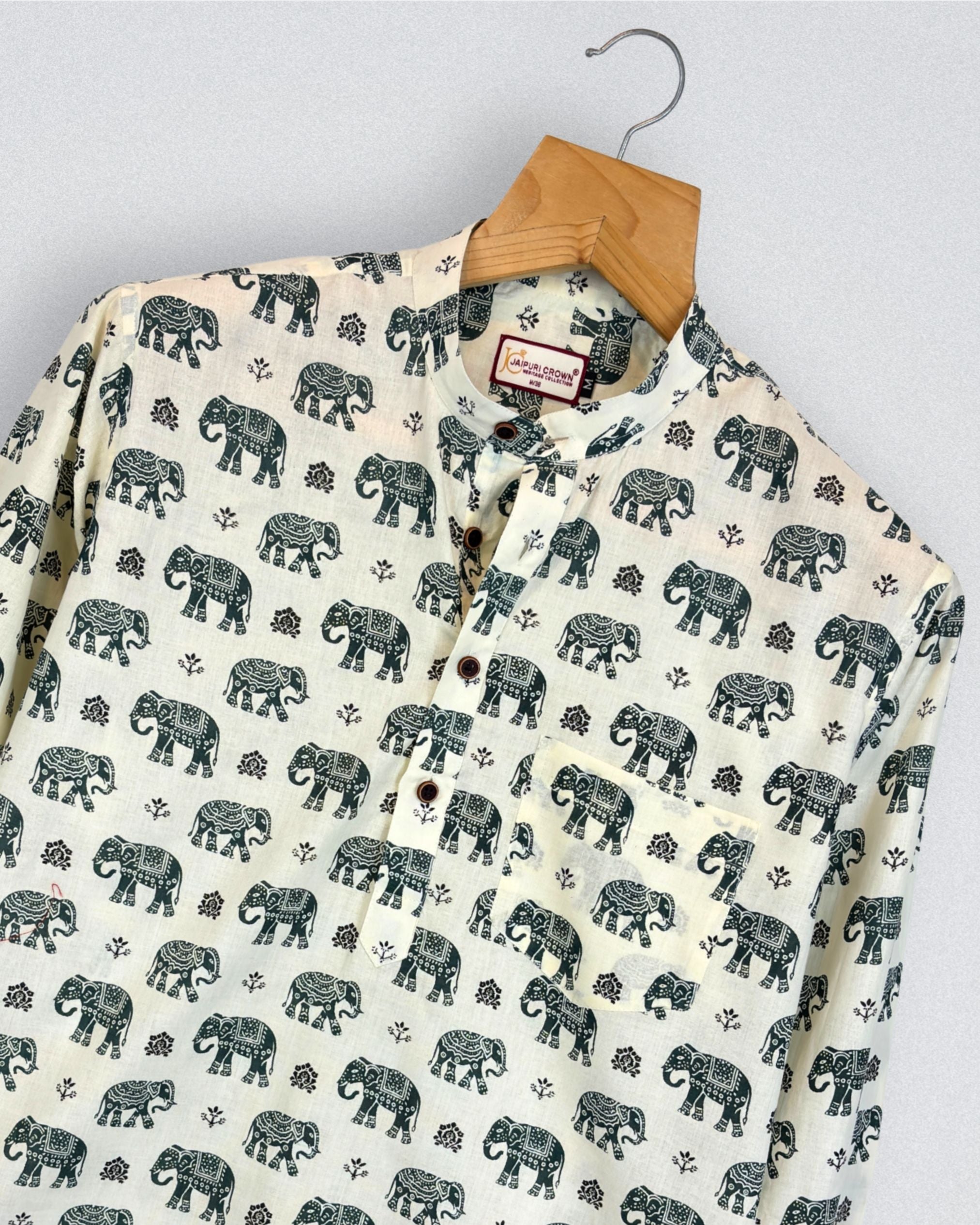 Step into a world of tradition with Majestic Elephants by Jaipuri Crown – a stylish Short Kurta featuring a stunning elephant print in deep green against a soft cream backdrop. Made from 100% Sanganeri cotton, this Kurta ensures comfort and breathability, making it the ideal choice for festive occasions, casual outings, or laid-back weekends.