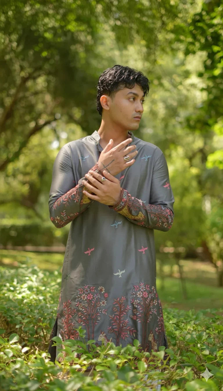 Men’s Heavy Designer Long Kurta – Grey Satin Embroidered