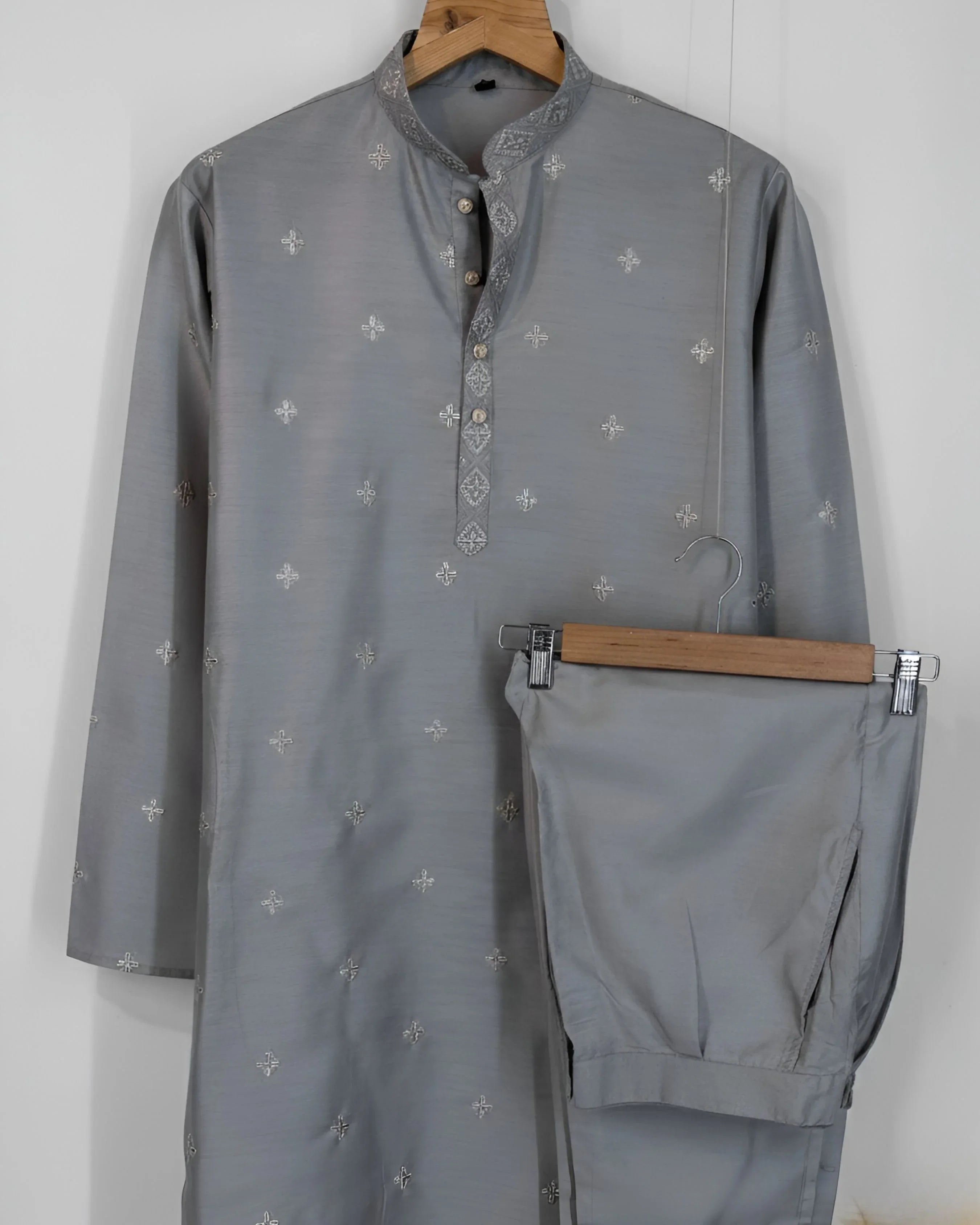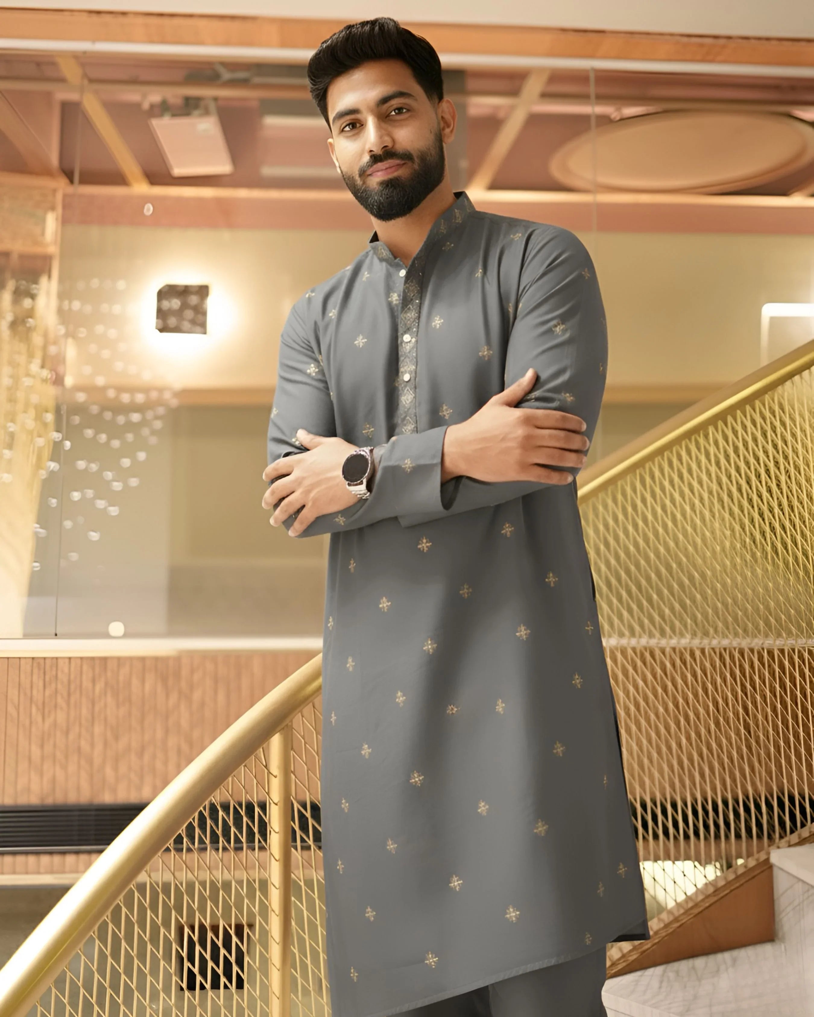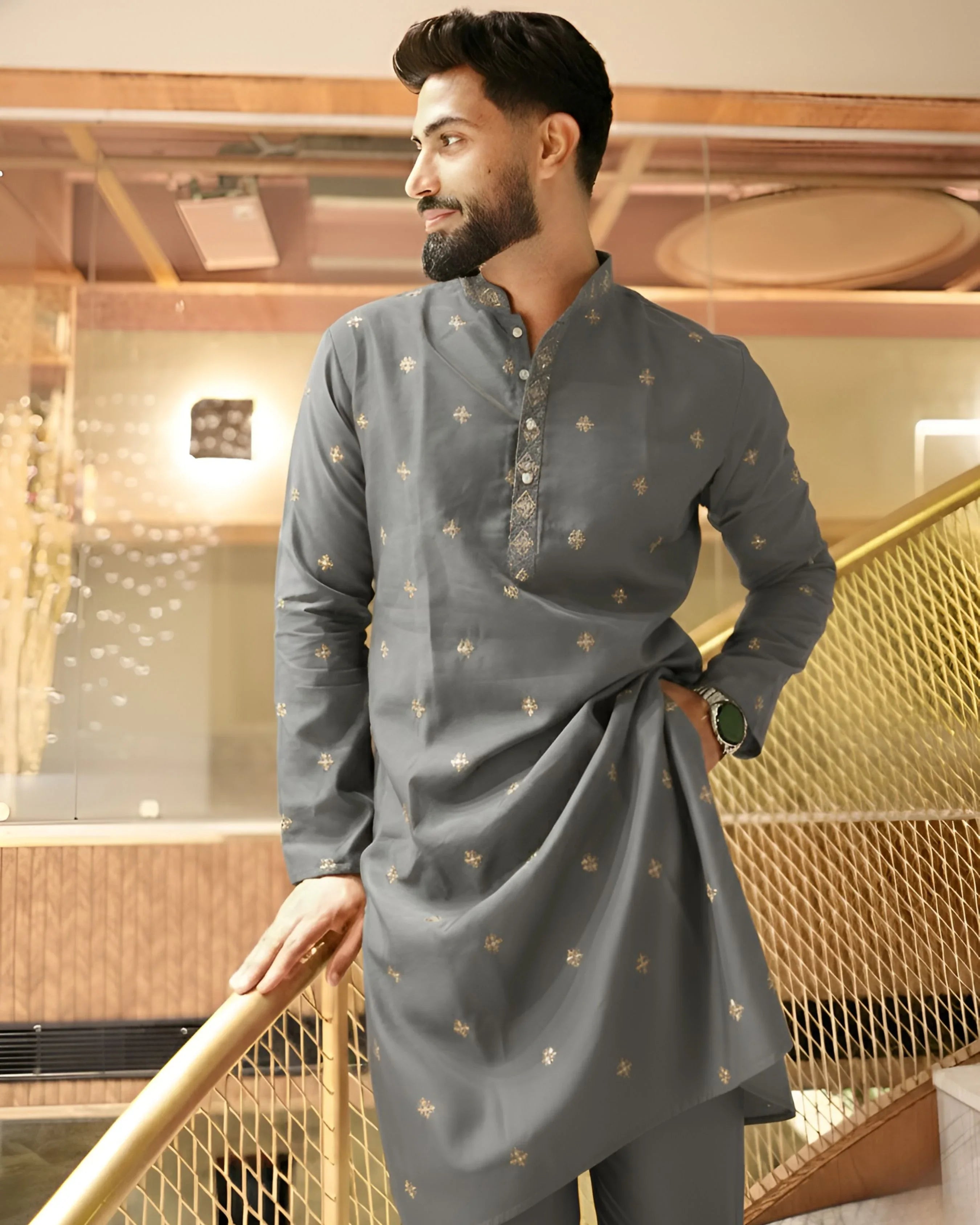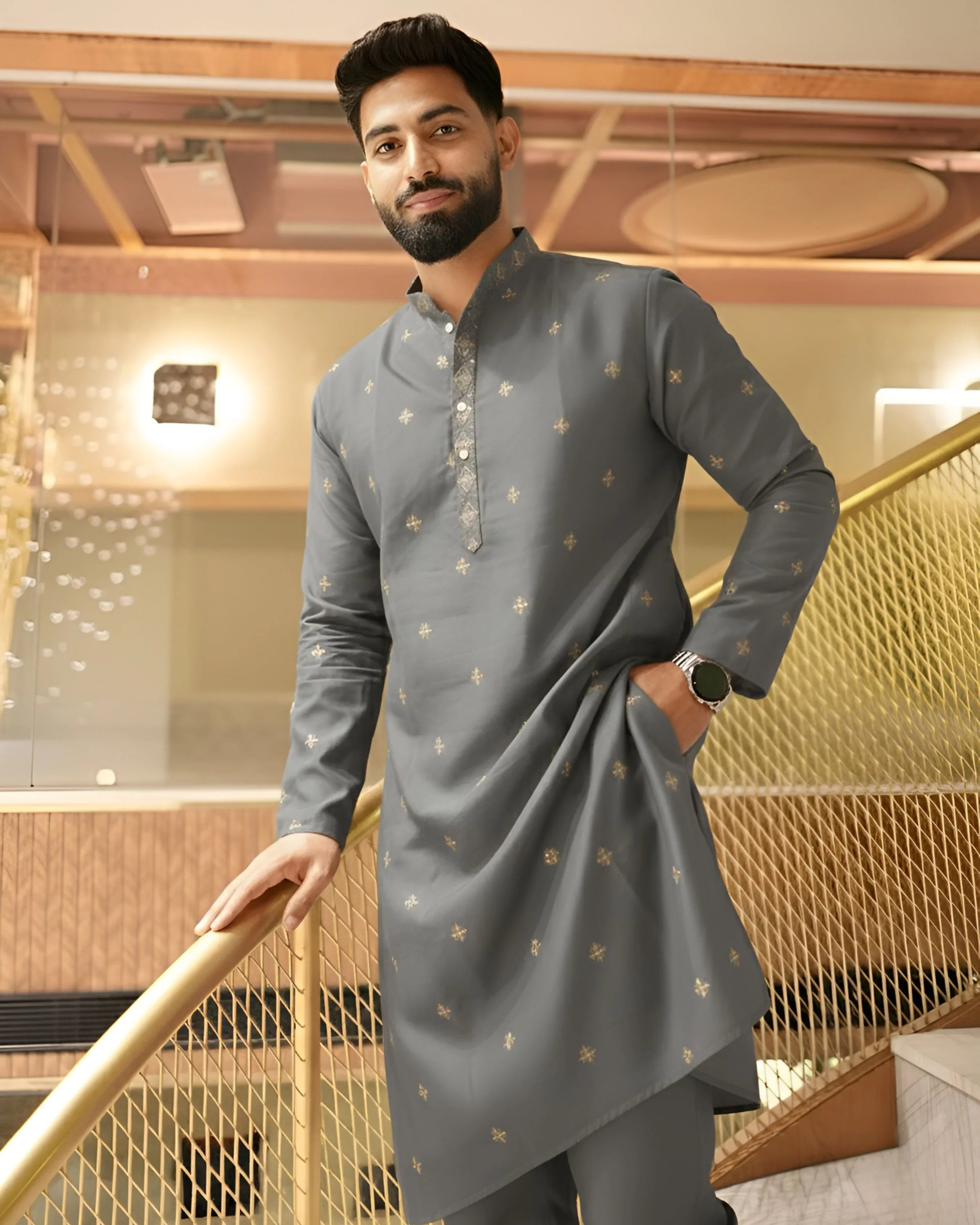 Men’s Heavy Designer Long Kurta Pajama – Grey Embroidered