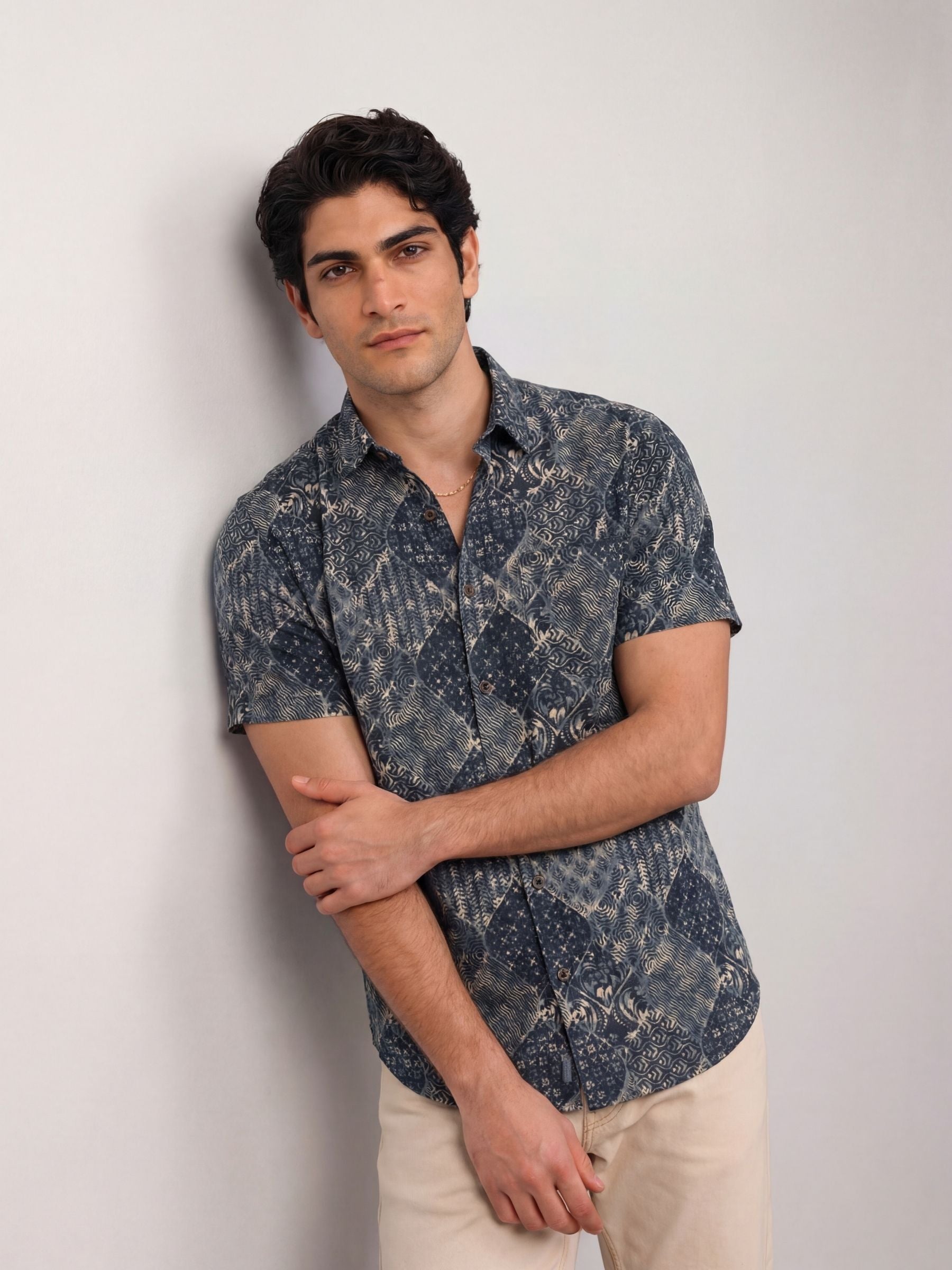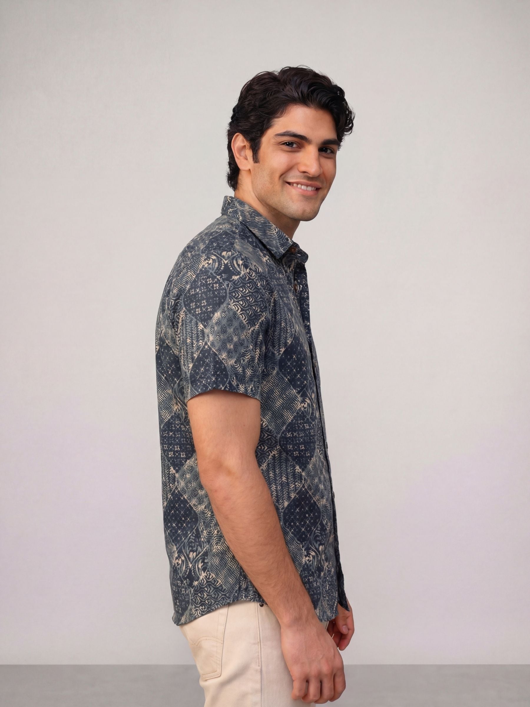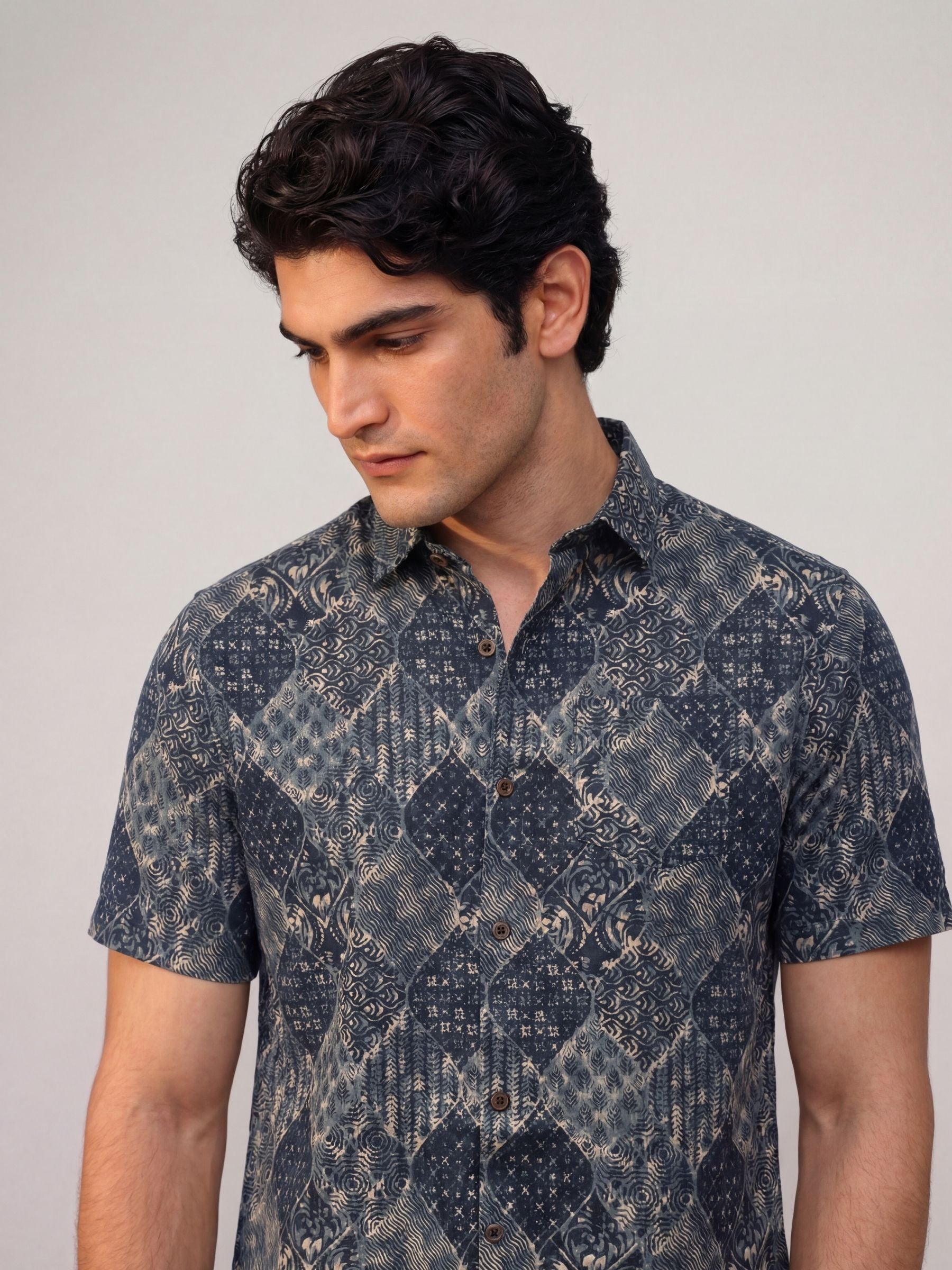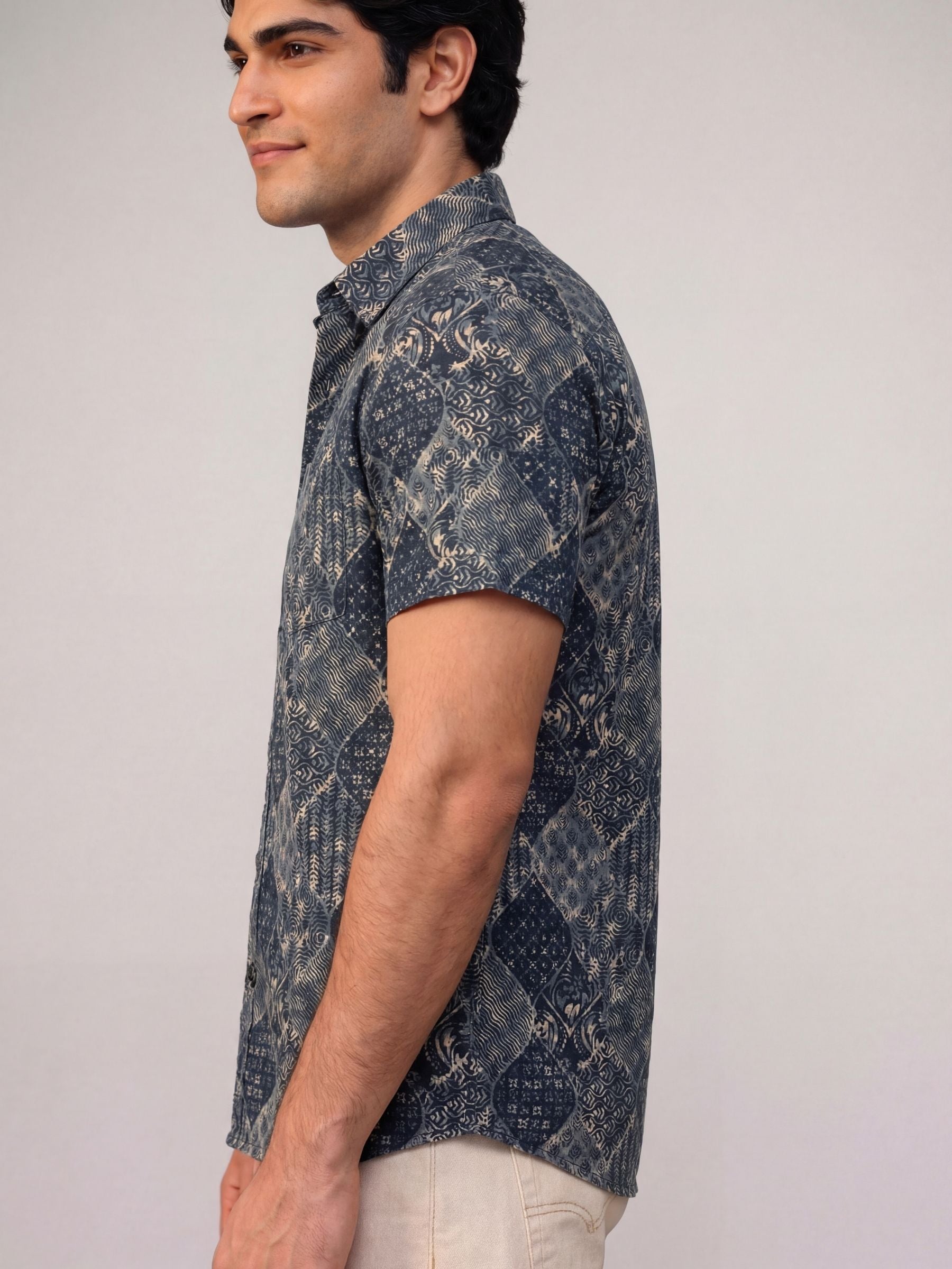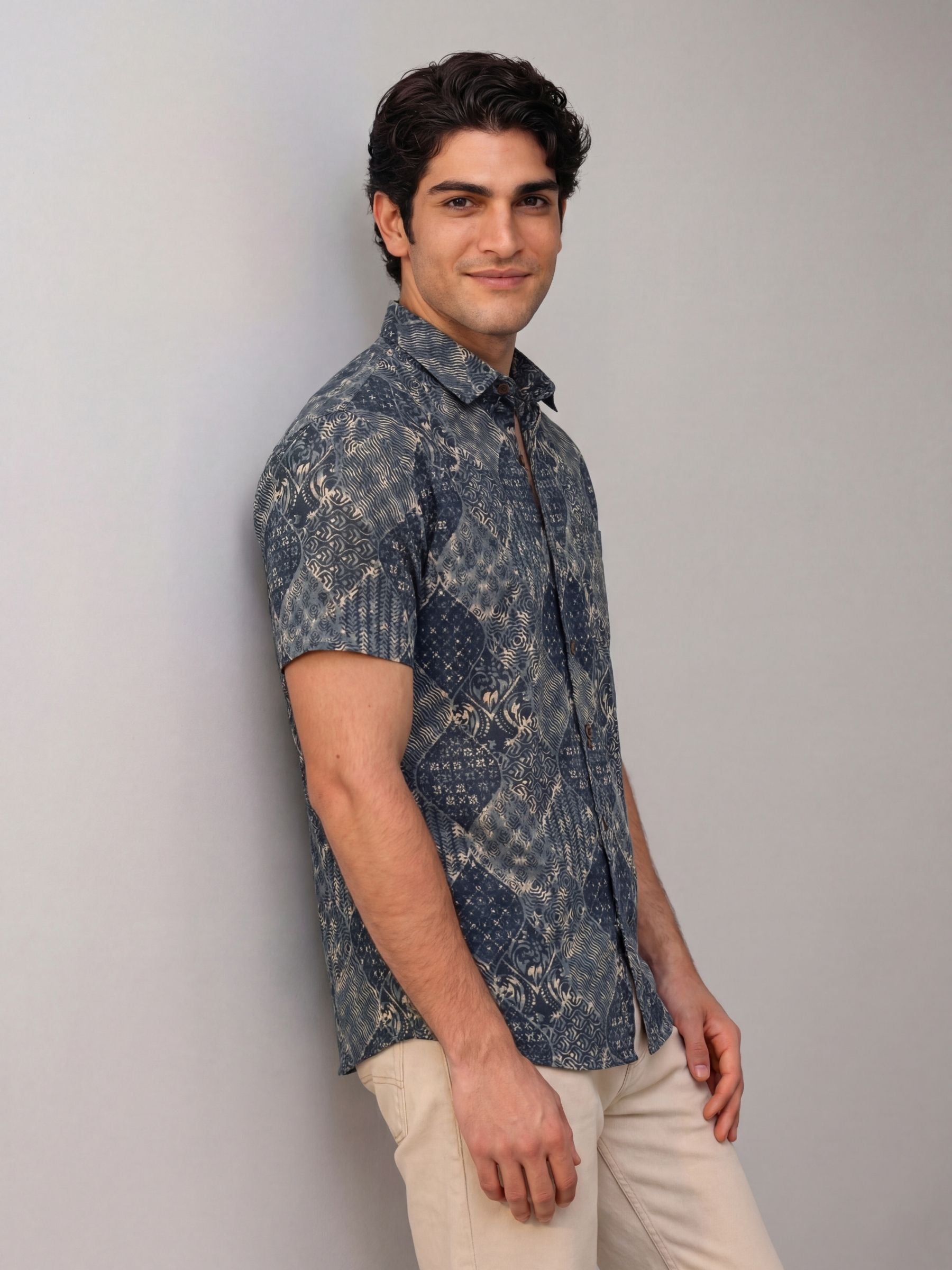 Step into the world of elegance with Ocean Waves by Jaipuri Crown – a captivating half sleeve cotton shirt featuring intricate patterns in shades of navy and beige. Made from 100% premium cotton, this shirt provides a soft, breathable feel, making it an ideal choice for casual gatherings, brunches, or laid-back weekends.