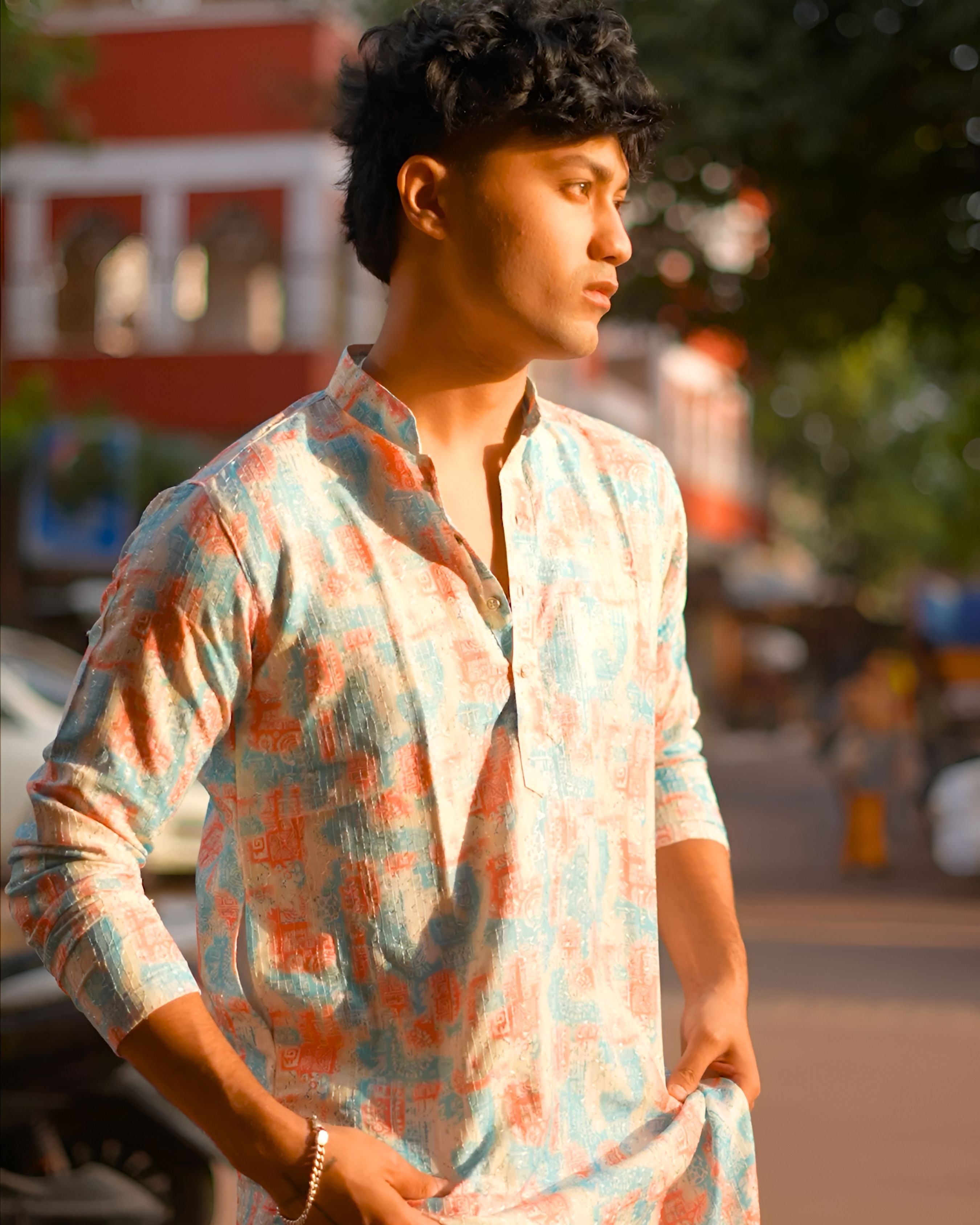 Step into elegance with our "Mystic Mandala Magic Kurta," crafted from imported digital printed silk adorned with intricate golden daliya work. Experience the fusion of tradition and modernity as the rich heritage of Jaipur meets contemporary design in this luxurious ensemble.