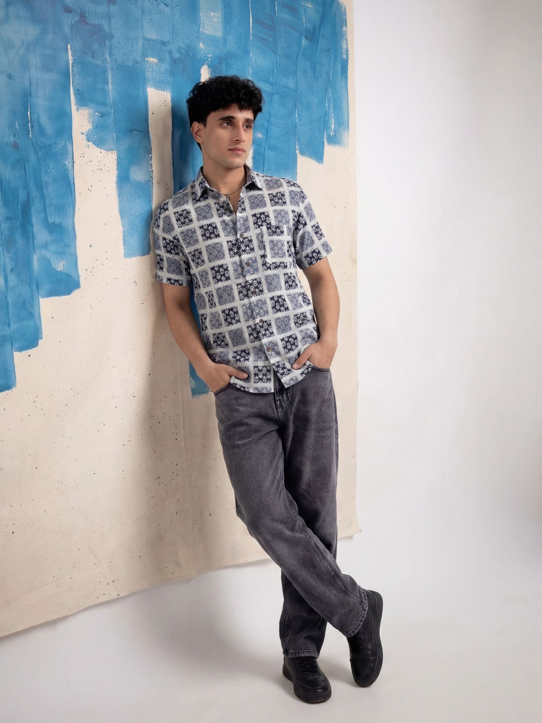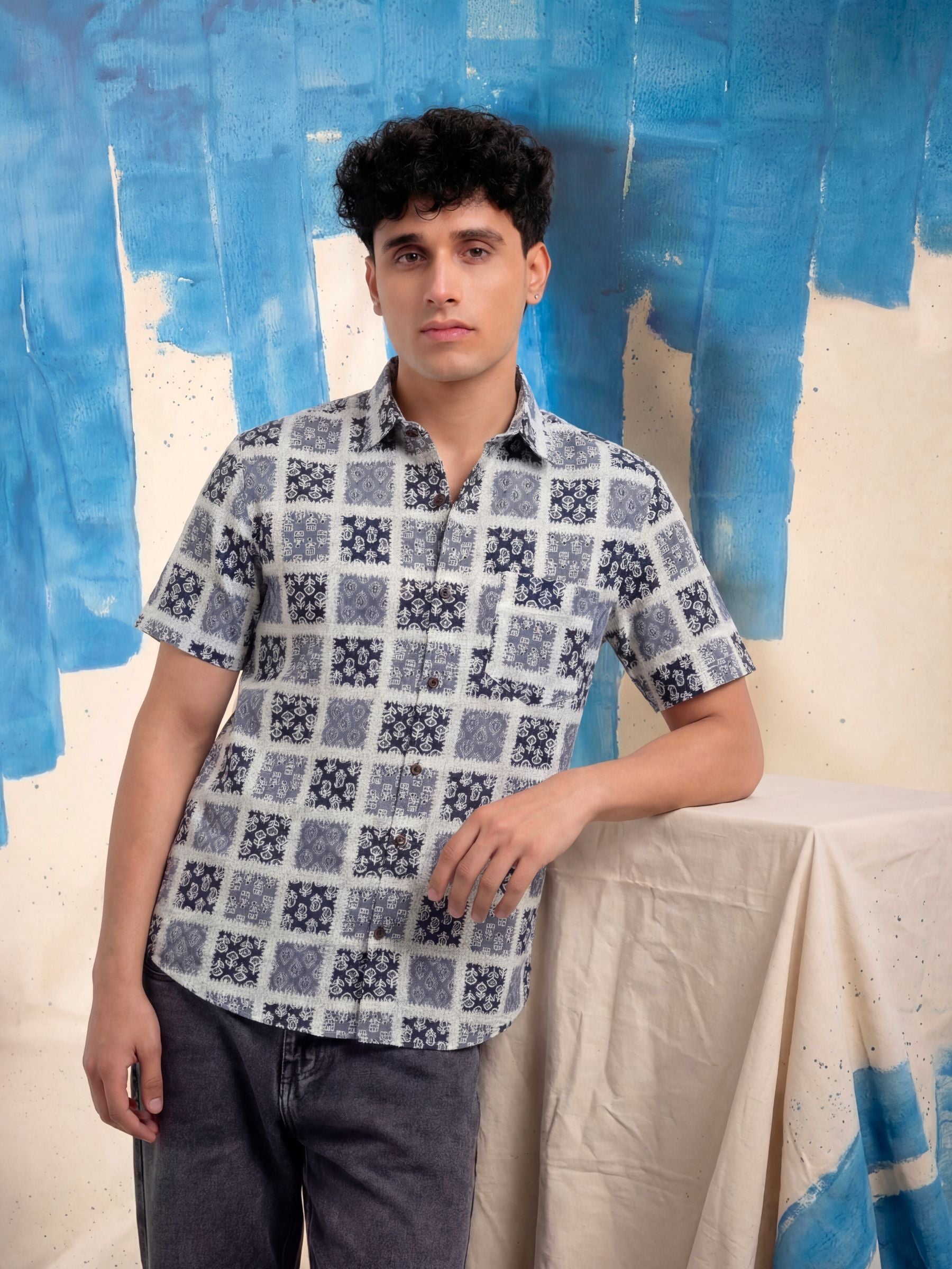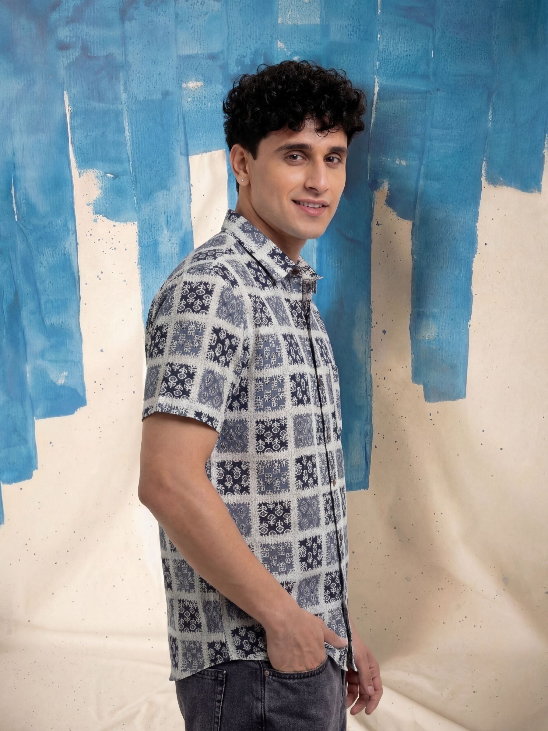 Step into style with Mystic Patterns by Jaipuri Crown – a visually captivating half sleeve cotton shirt featuring an intricate print in shades of blue and white. Made from 100% Sanganeri cotton, this shirt is designed to keep you comfortable and stylish during any casual occasion, whether you're out with friends or enjoying a laid-back weekend.