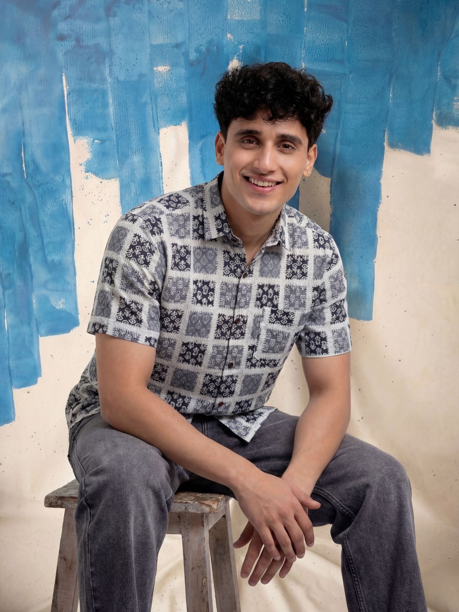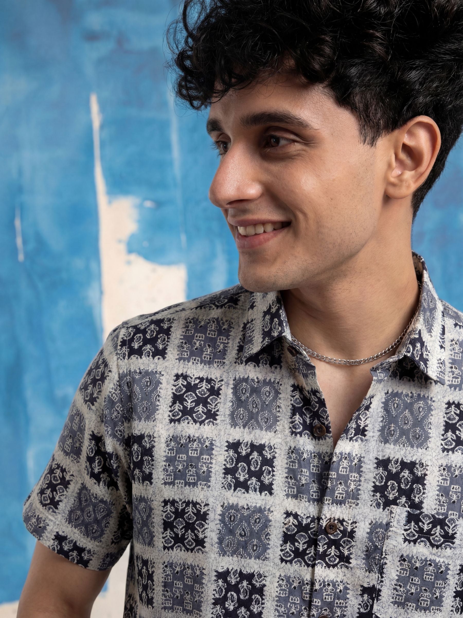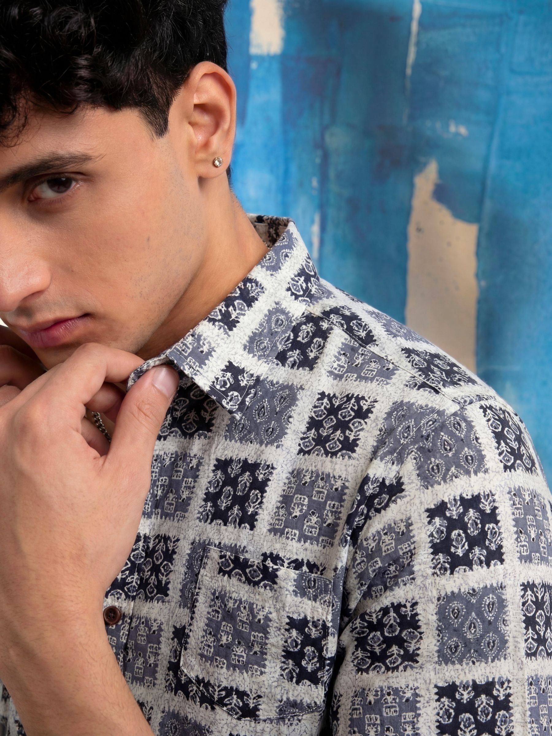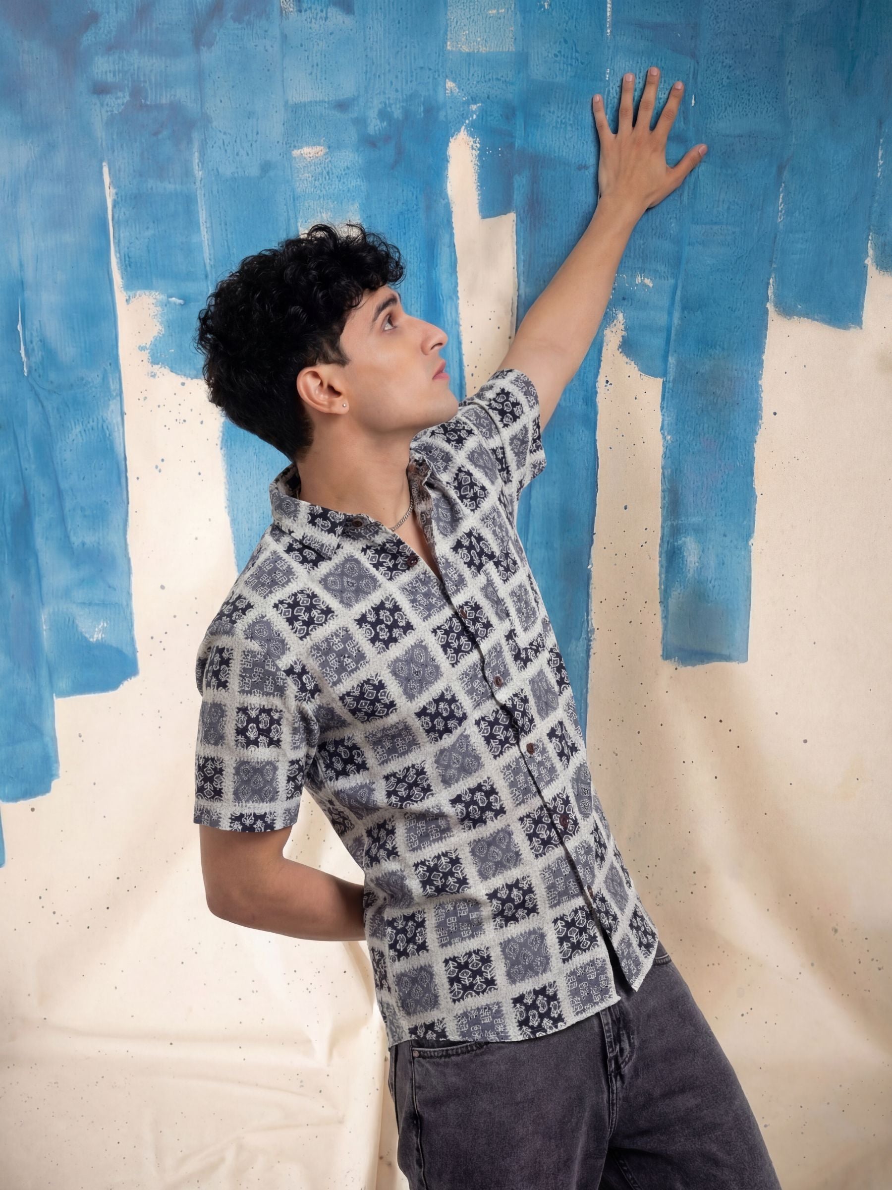Step into style with Mystic Patterns by Jaipuri Crown – a visually captivating half sleeve cotton shirt featuring an intricate print in shades of blue and white. Made from 100% Sanganeri cotton, this shirt is designed to keep you comfortable and stylish during any casual occasion, whether you're out with friends or enjoying a laid-back weekend.