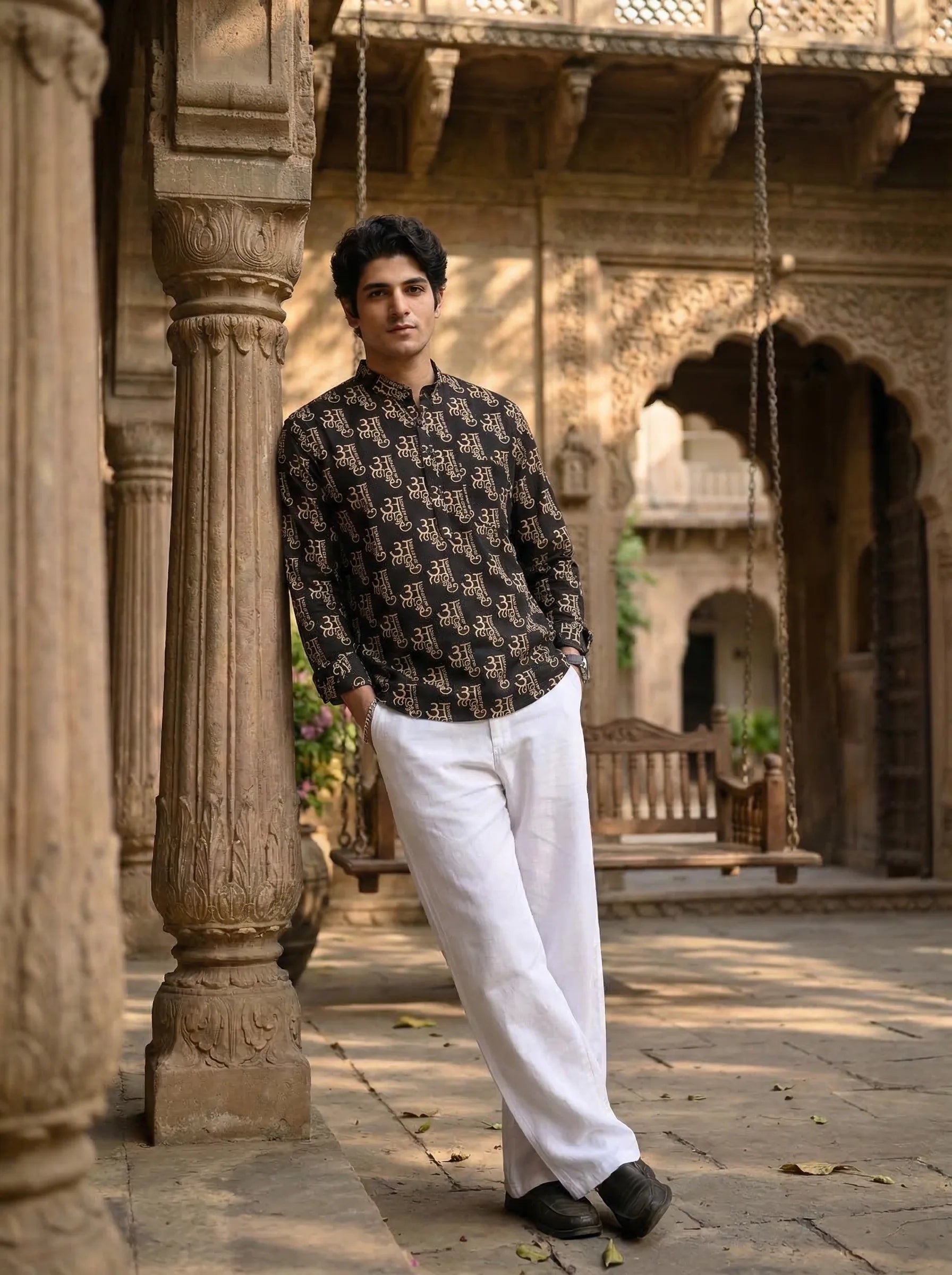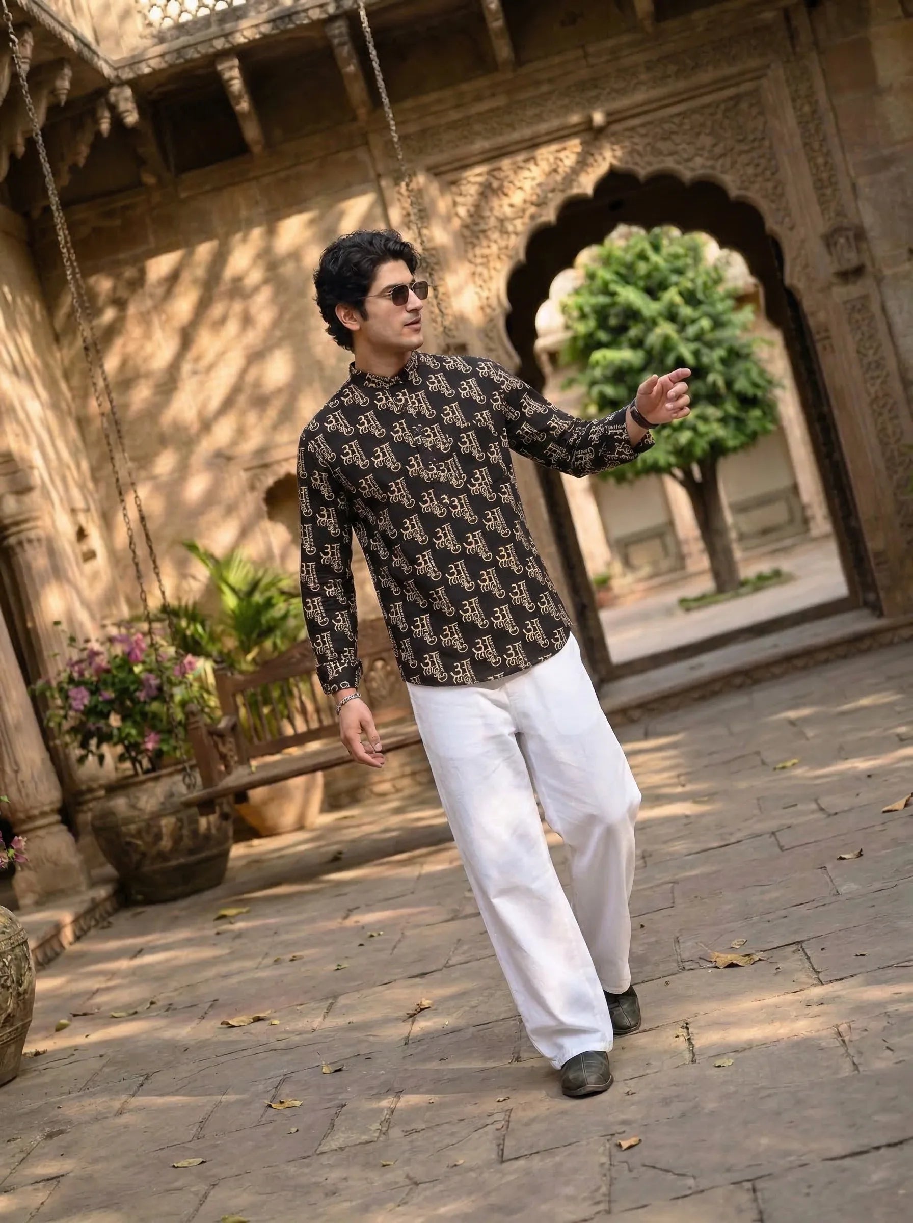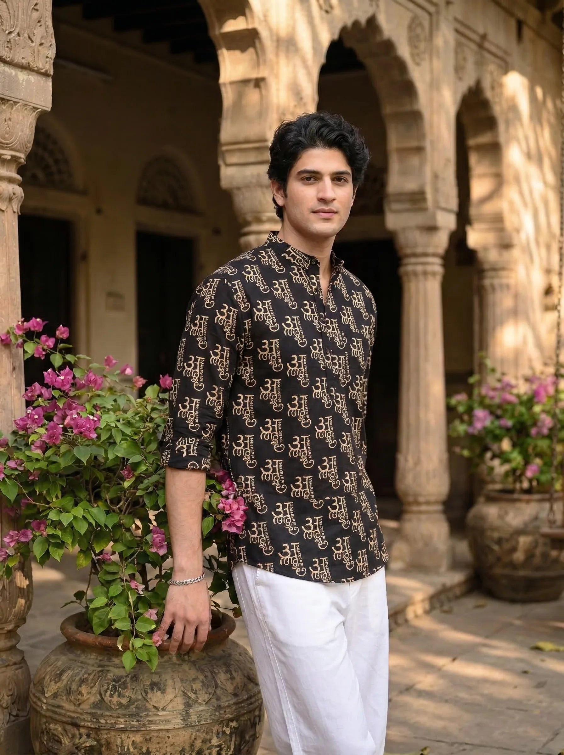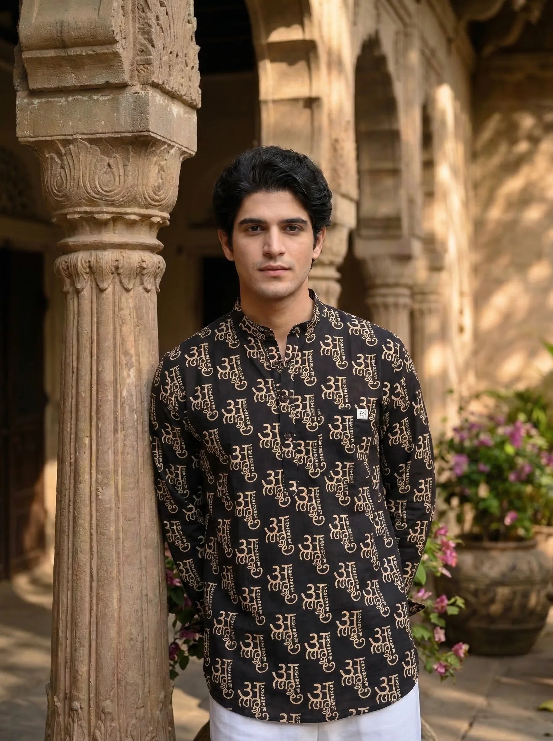 Step into elegance with the Mystic Symbols by Jaipuri Crown – a striking Short Kurta featuring intricate prints in bold black and gold. Crafted from 100% Sanganeri cotton, this Kurta is designed for comfort and style, making it an ideal choice for festive occasions, casual gatherings, or relaxed days at home.