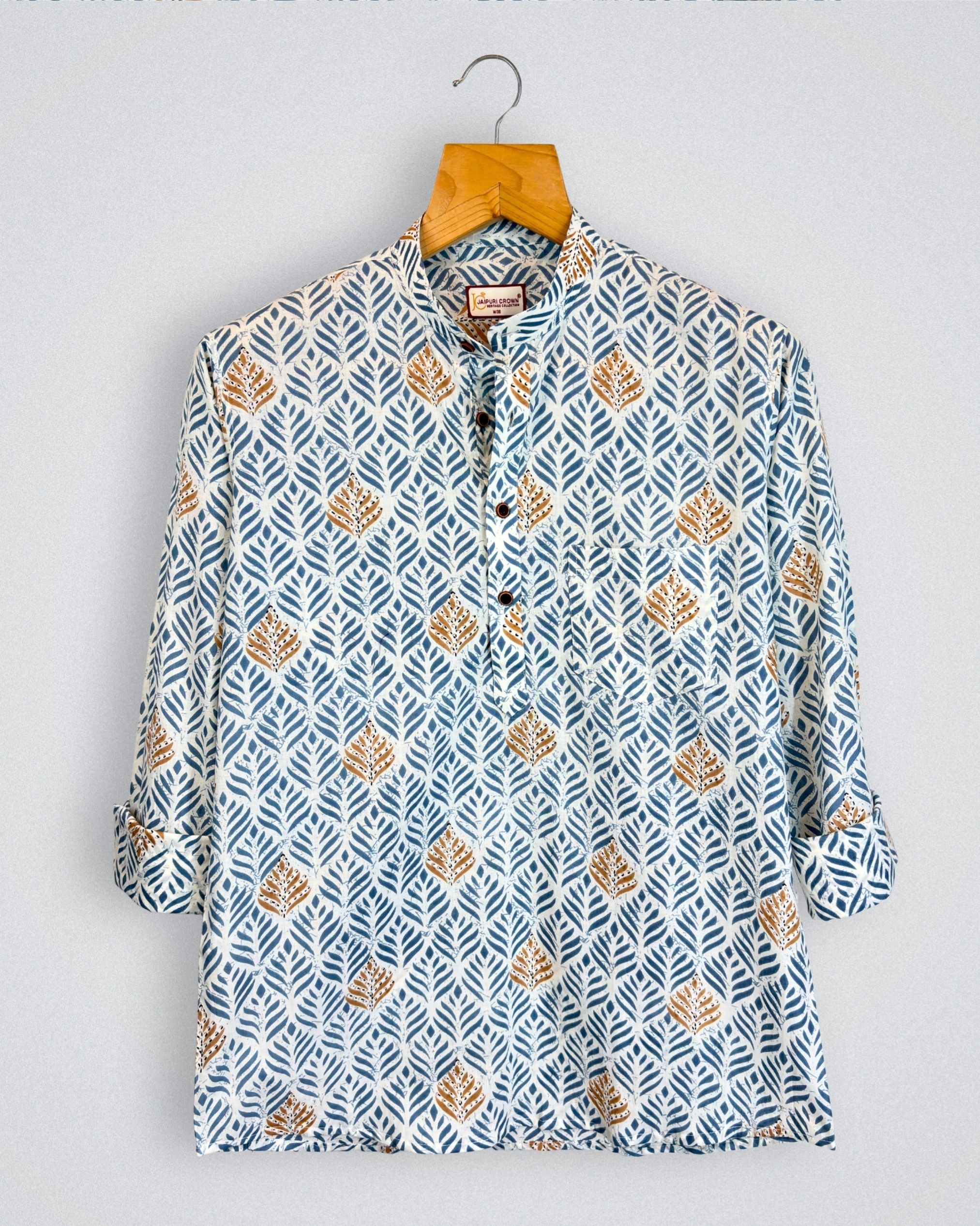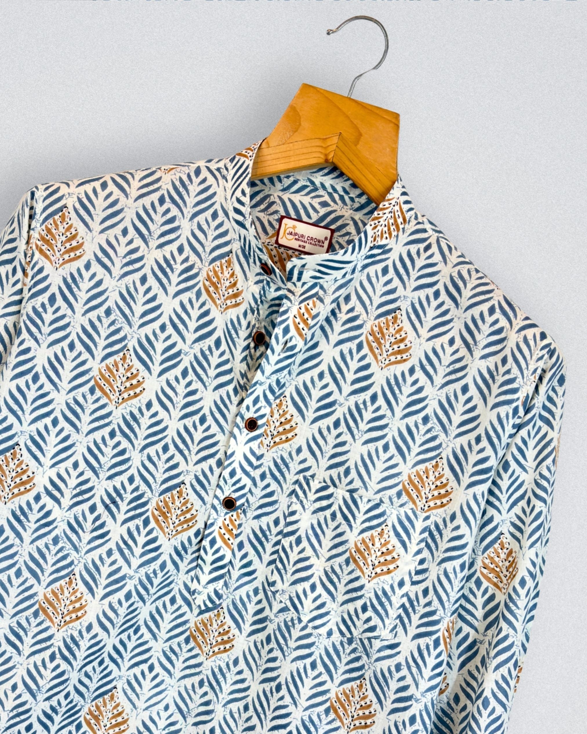 Step into a world of elegance with Leafy Charm by Jaipuri Crown – a stunning Short Kurta featuring a refreshing leaf print in shades of blue and gold on a crisp white base. Made from 100% Sanganeri cotton, this Kurta promises unparalleled comfort and breathability, ideal for casual gatherings, festive occasions, or leisurely weekends.