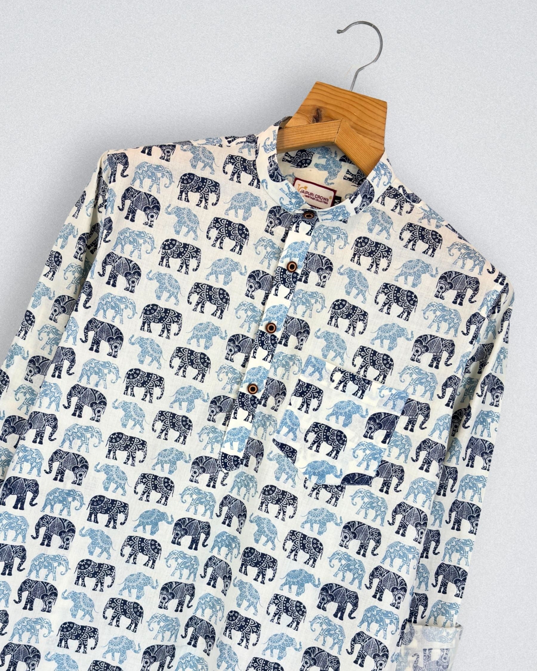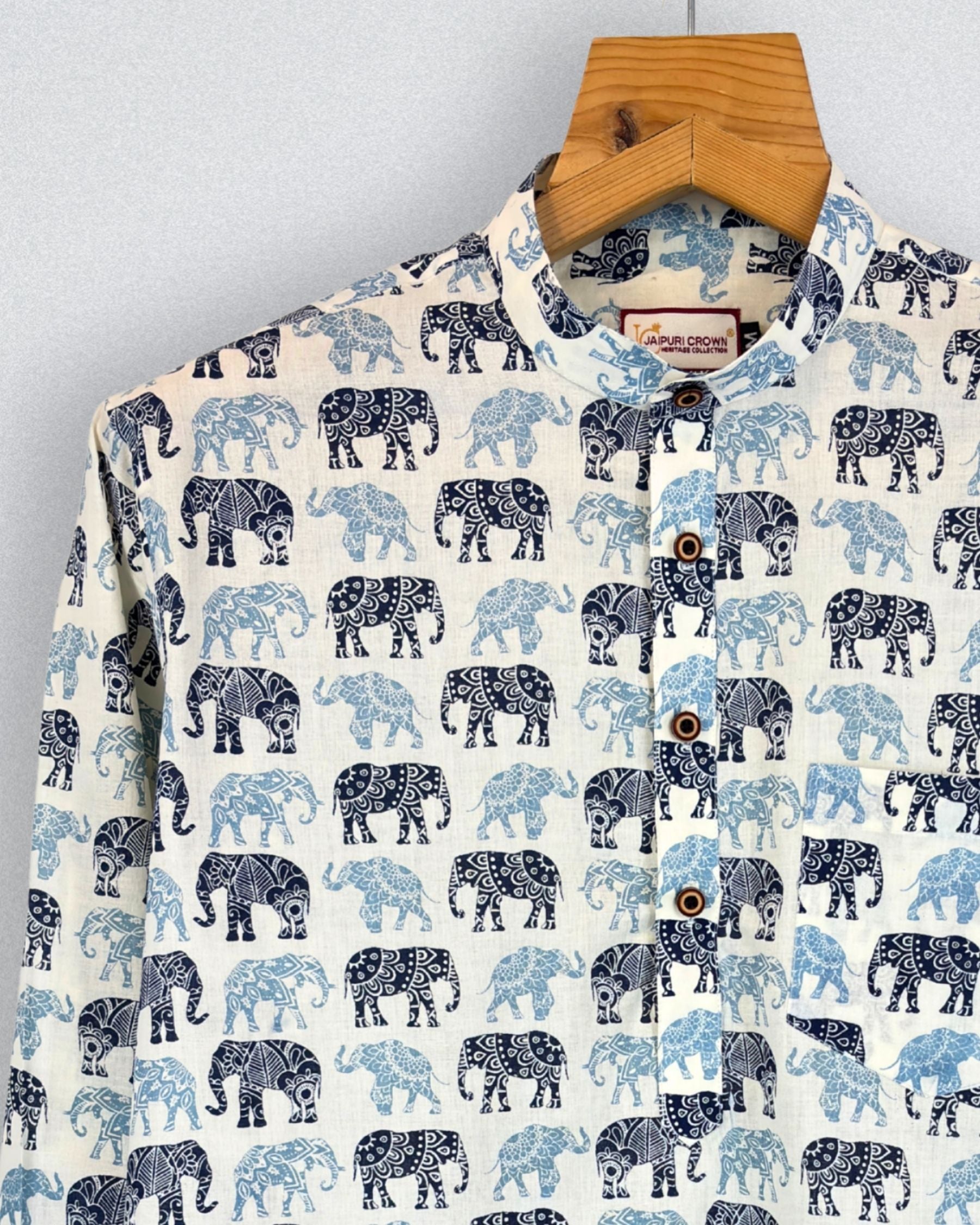 Step into style with Elephant Parade by Jaipuri Crown – a chic Short Kurta featuring a captivating elephant print in navy and light blue against a soft cream background. Made from 100% Sanganeri cotton, this Kurta is soft, breathable, and ideal for casual outings, family gatherings, or festive occasions.