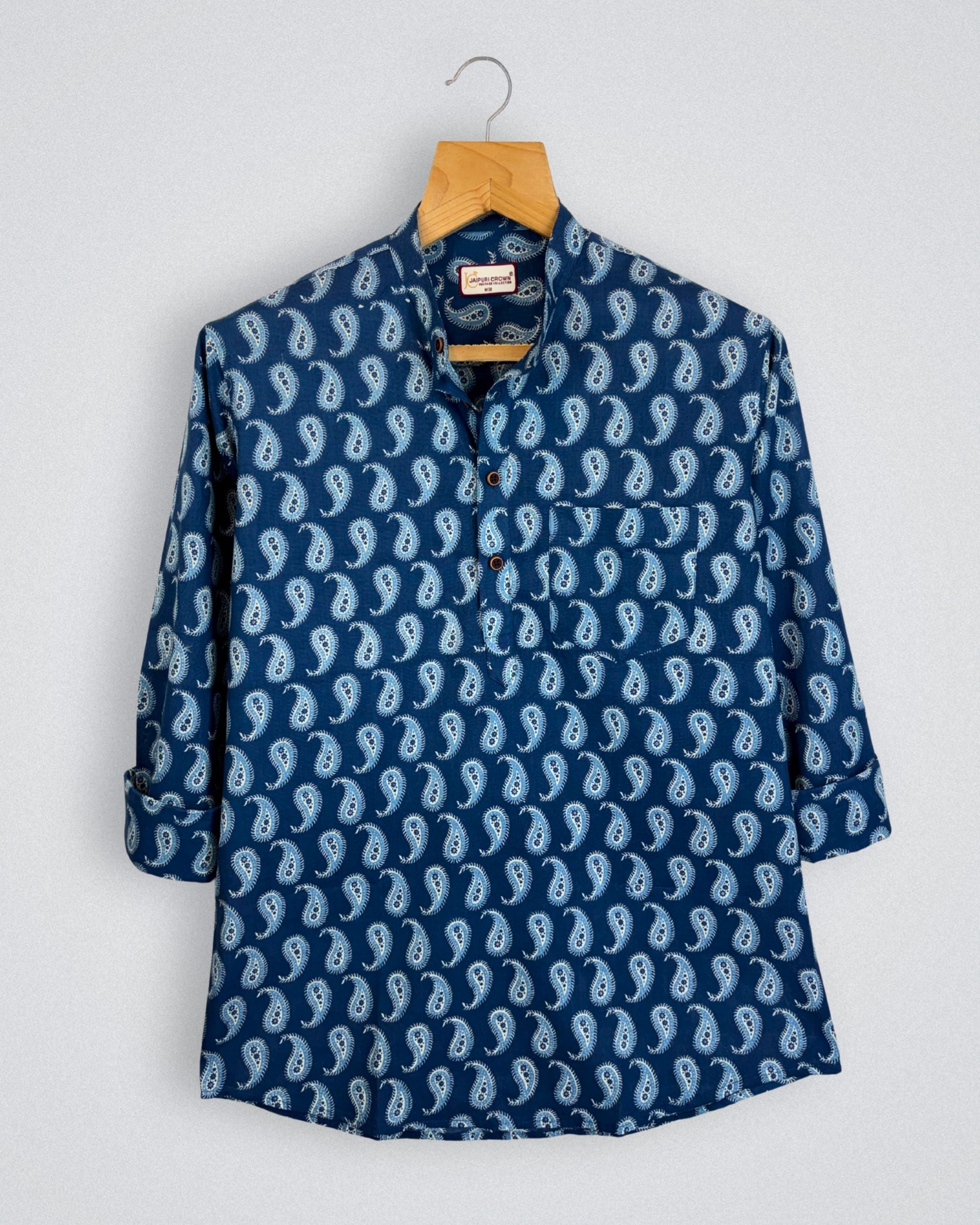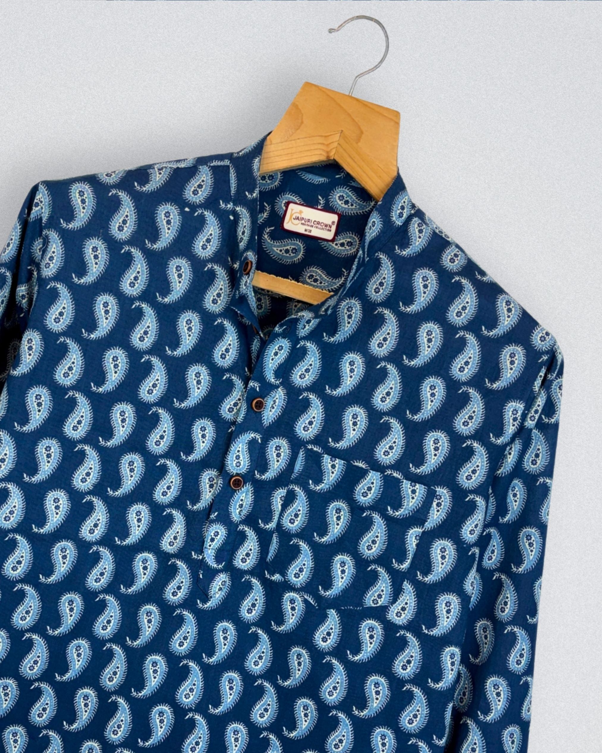Step into elegance with Paisley Charm by Jaipuri Crown – a stunning Short Kurta featuring an intricate paisley print in navy blue and white. Made from 100% Sanganeri cotton, this Kurta ensures a soft, breathable feel, making it the ideal choice for casual gatherings, festive occasions, or leisurely weekends.