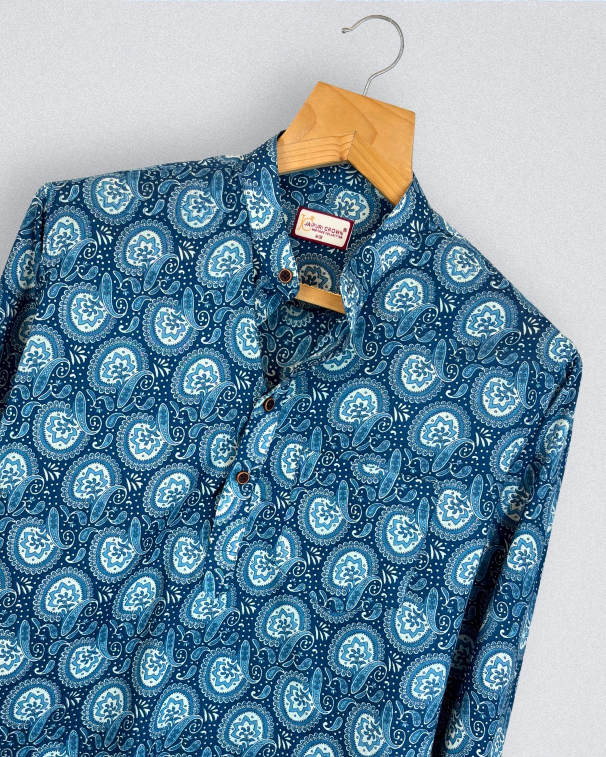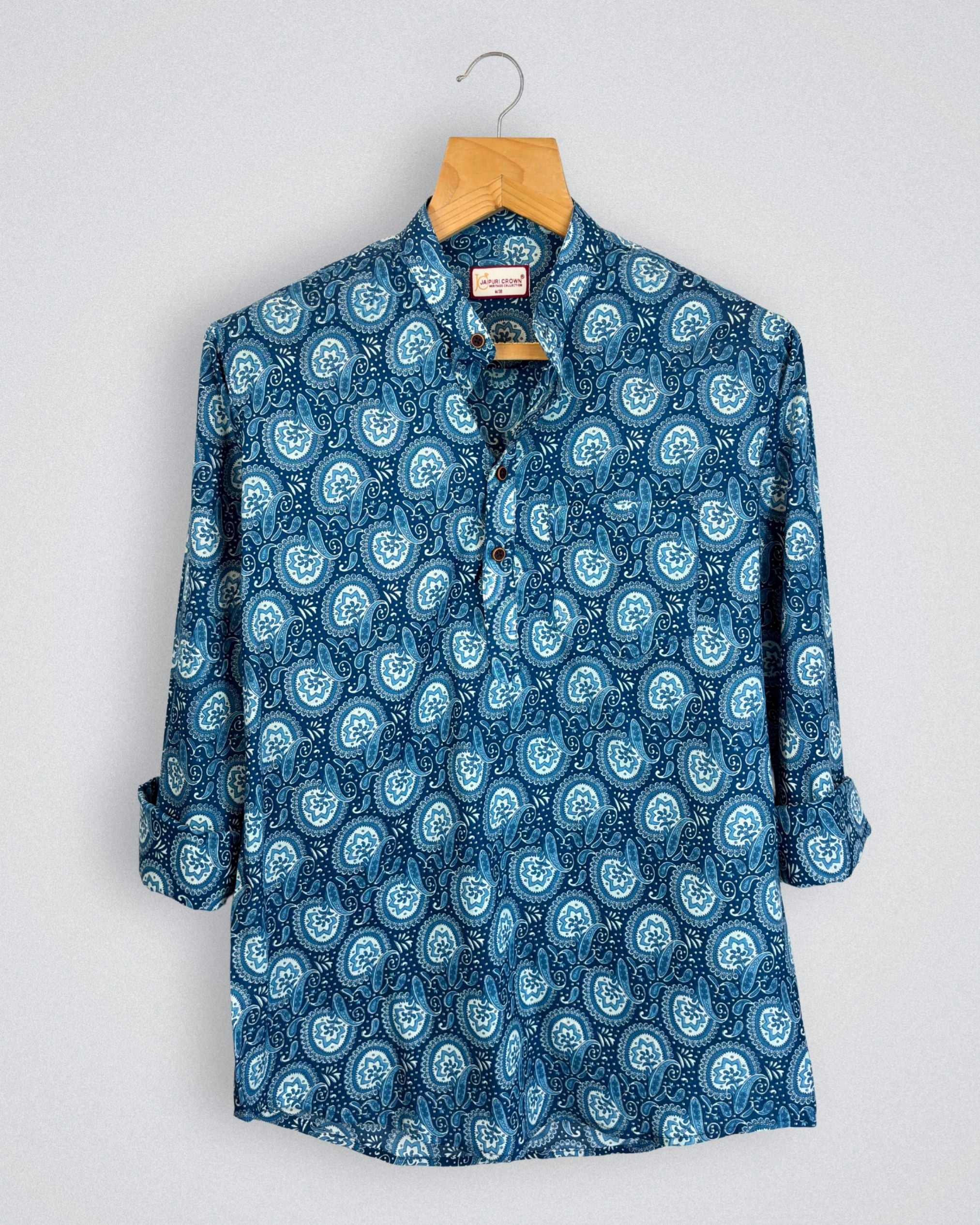 Elevate your casual style with Paisley Charm by Jaipuri Crown – a chic Short Kurta featuring a stunning paisley print in shades of blue and white. Made from 100% Sanganeri cotton, this Kurta is designed for maximum comfort and breathability, making it the ideal choice for relaxed weekends, family gatherings, or casual outings.