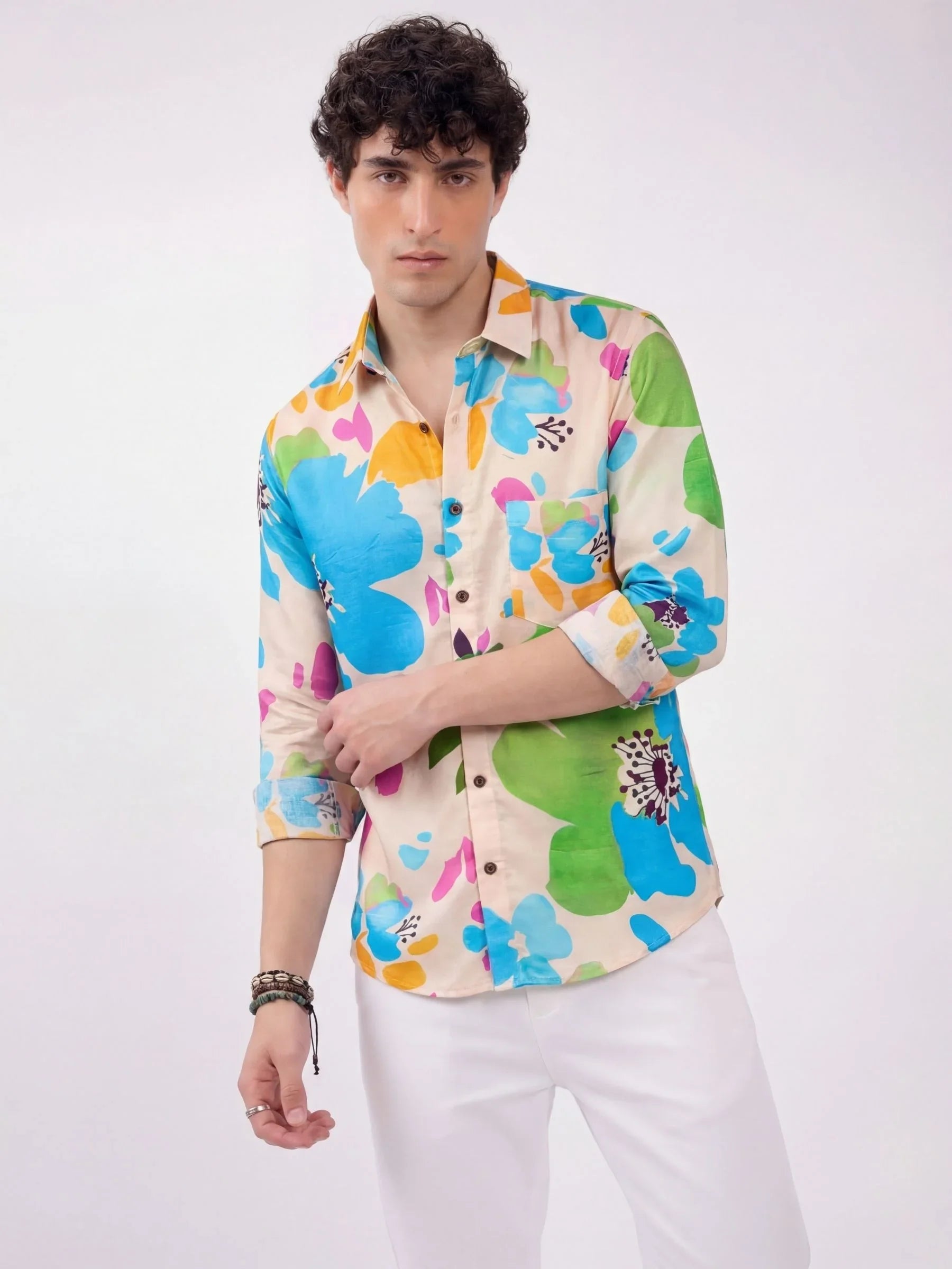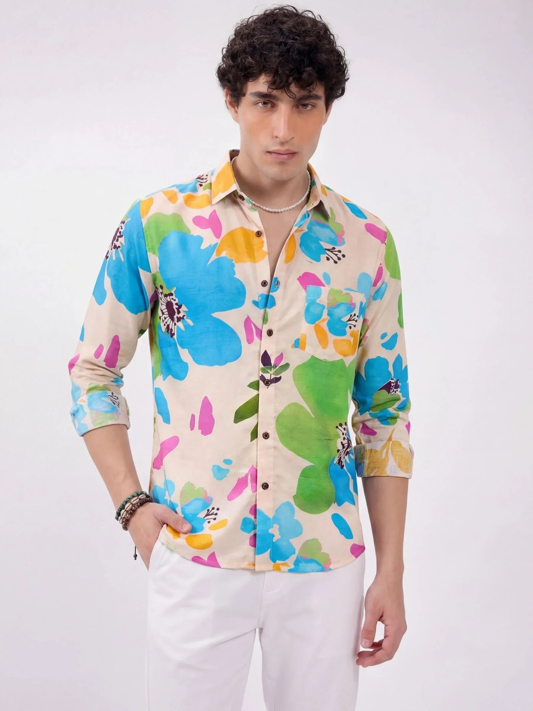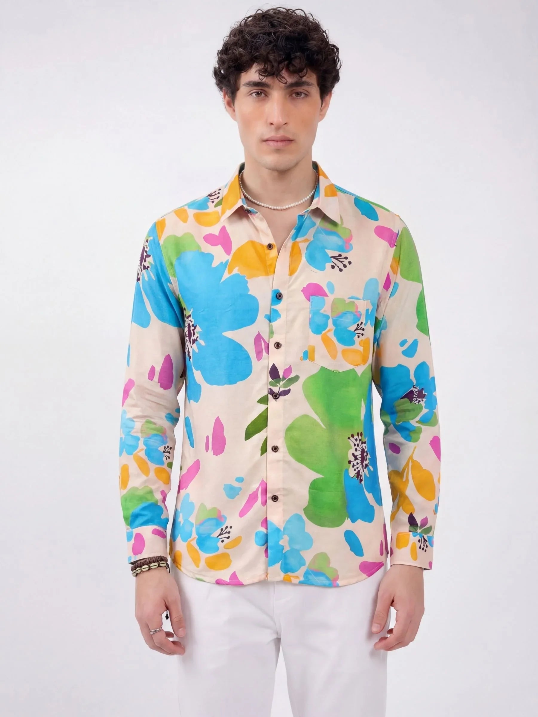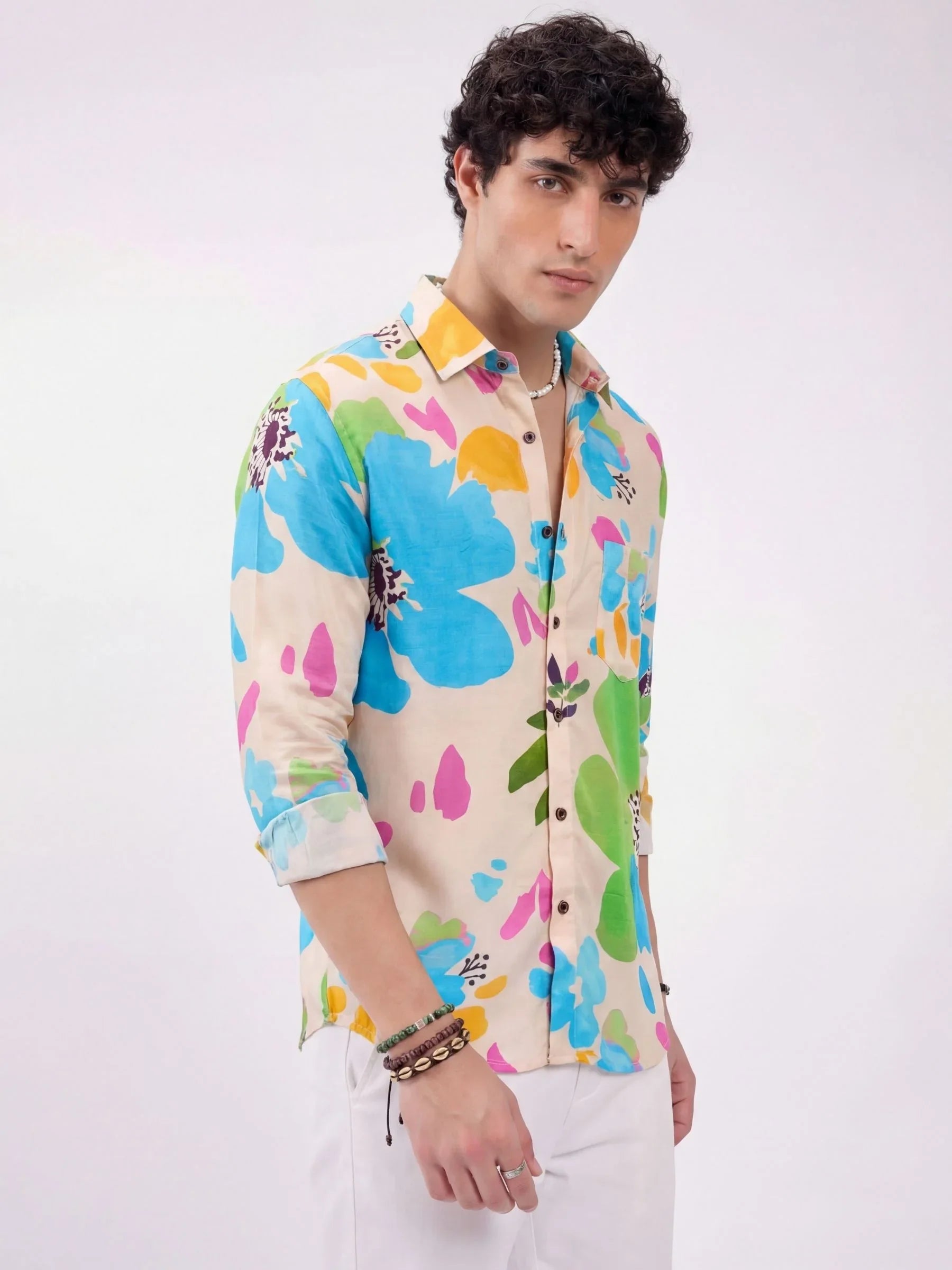 Add a gentle splash of color to your wardrobe with the Pastel Garden shirt by Jaipuri Crown. Featuring artistic floral shapes in aqua blue, mauve pink, mustard yellow, and mint green over a light beige base, this full sleeve shirt captures effortless charm. Made from our premium satin blend fabric, it’s soft, breathable, and ideal for subtle standout style.