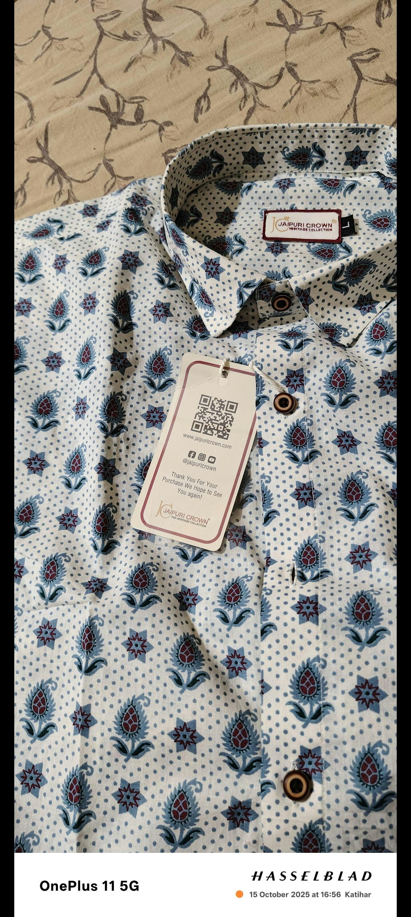 Step into style with Peacock Dreams by Jaipuri Crown – a charming half sleeve cotton shirt adorned with intricate peacock motifs on a pristine white base. Crafted from 100% Sanganeri cotton, this shirt offers breathability and comfort for every occasion, be it casual outings or festive gatherings.