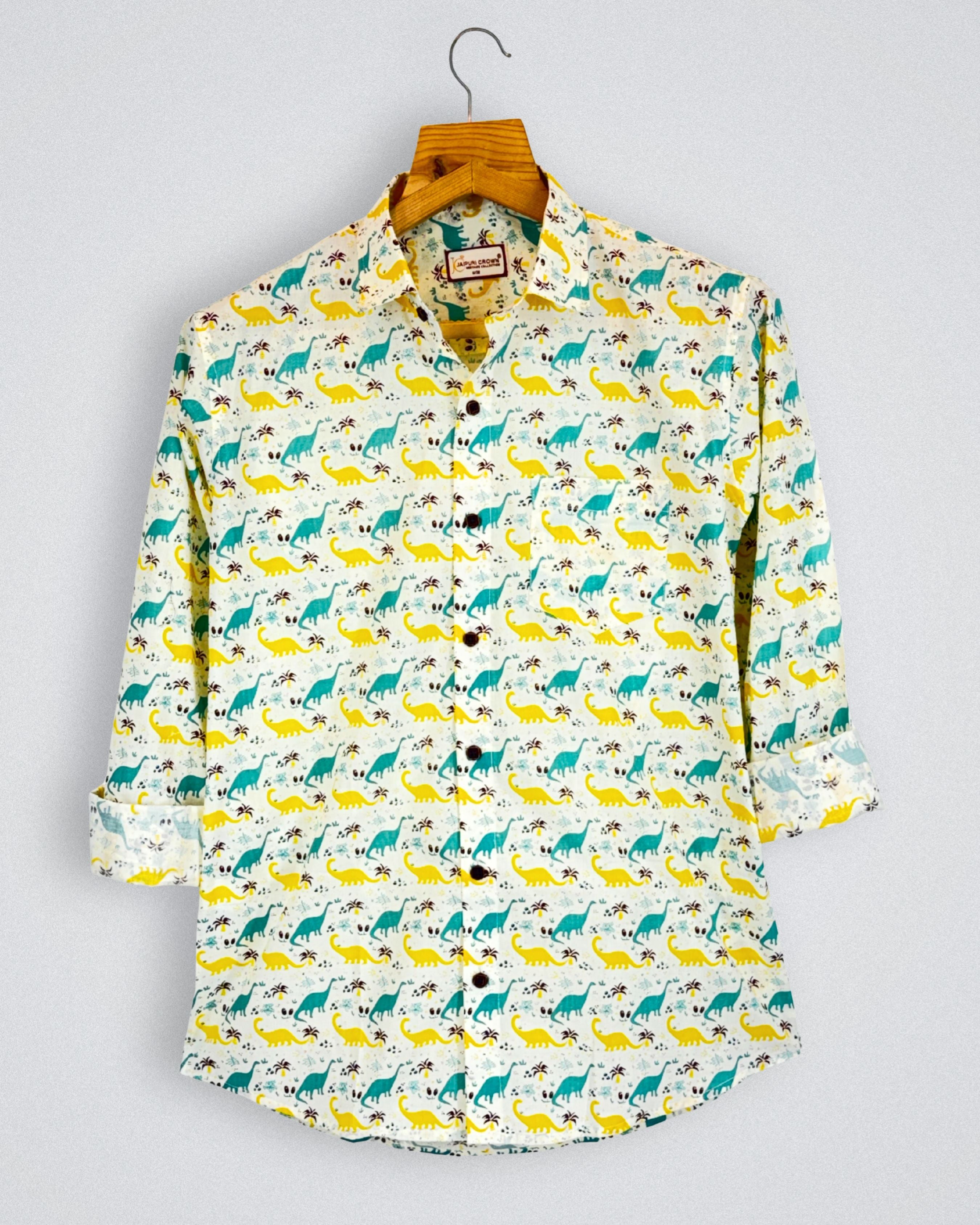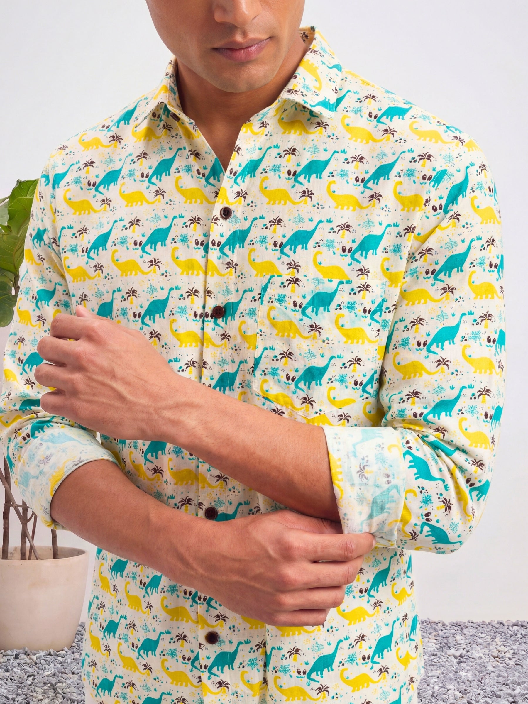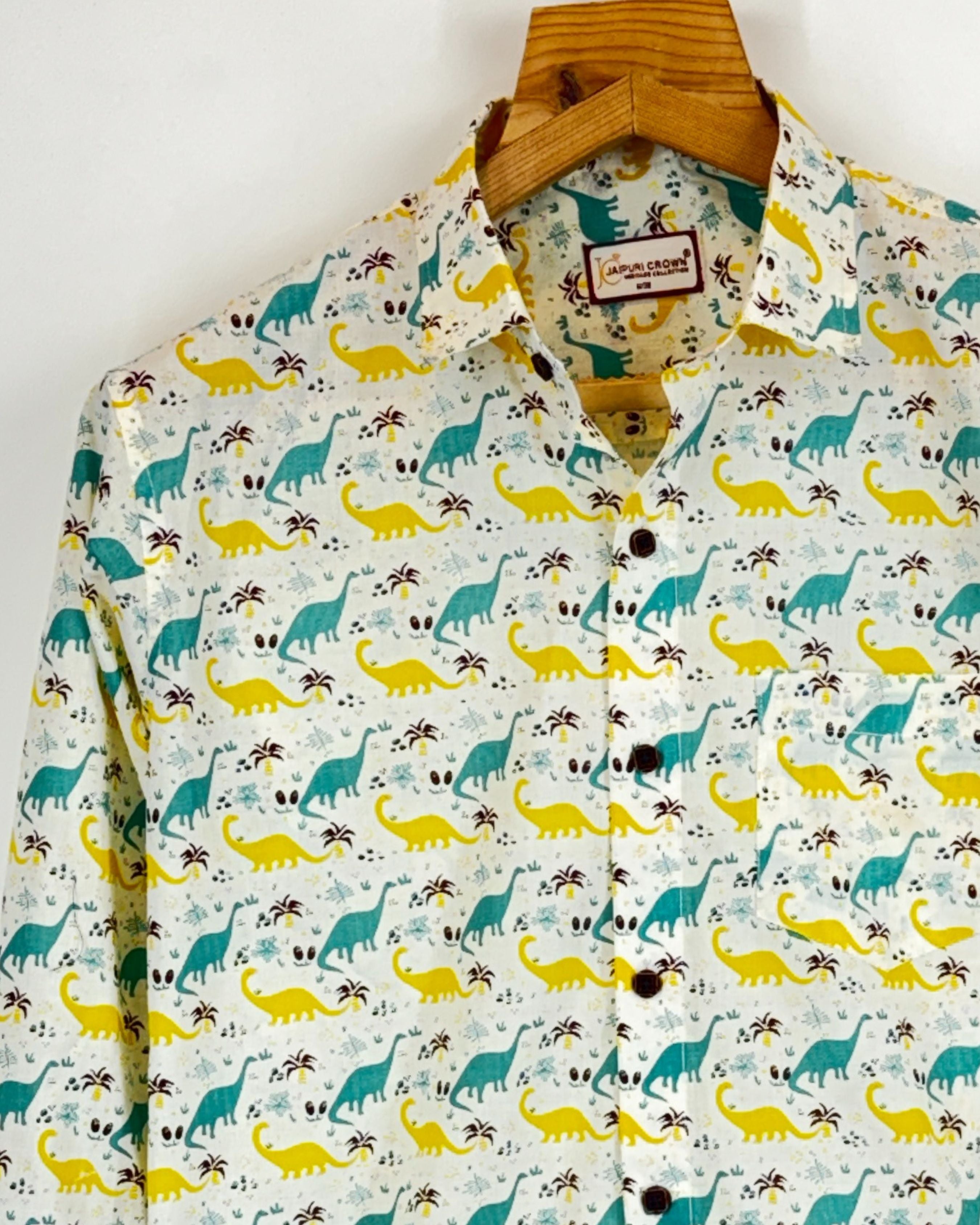 Ignite your playful spirit with Dino Adventure by Jaipuri Crown – a charming Full sleeve cotton shirt featuring a whimsical dinosaur print in vibrant teal, yellow, and deep brown on a light cream backdrop. Made from 100% Sanganeri cotton, this shirt ensures comfort and breathability, making it perfect for casual outings, family picnics, or relaxed weekends.