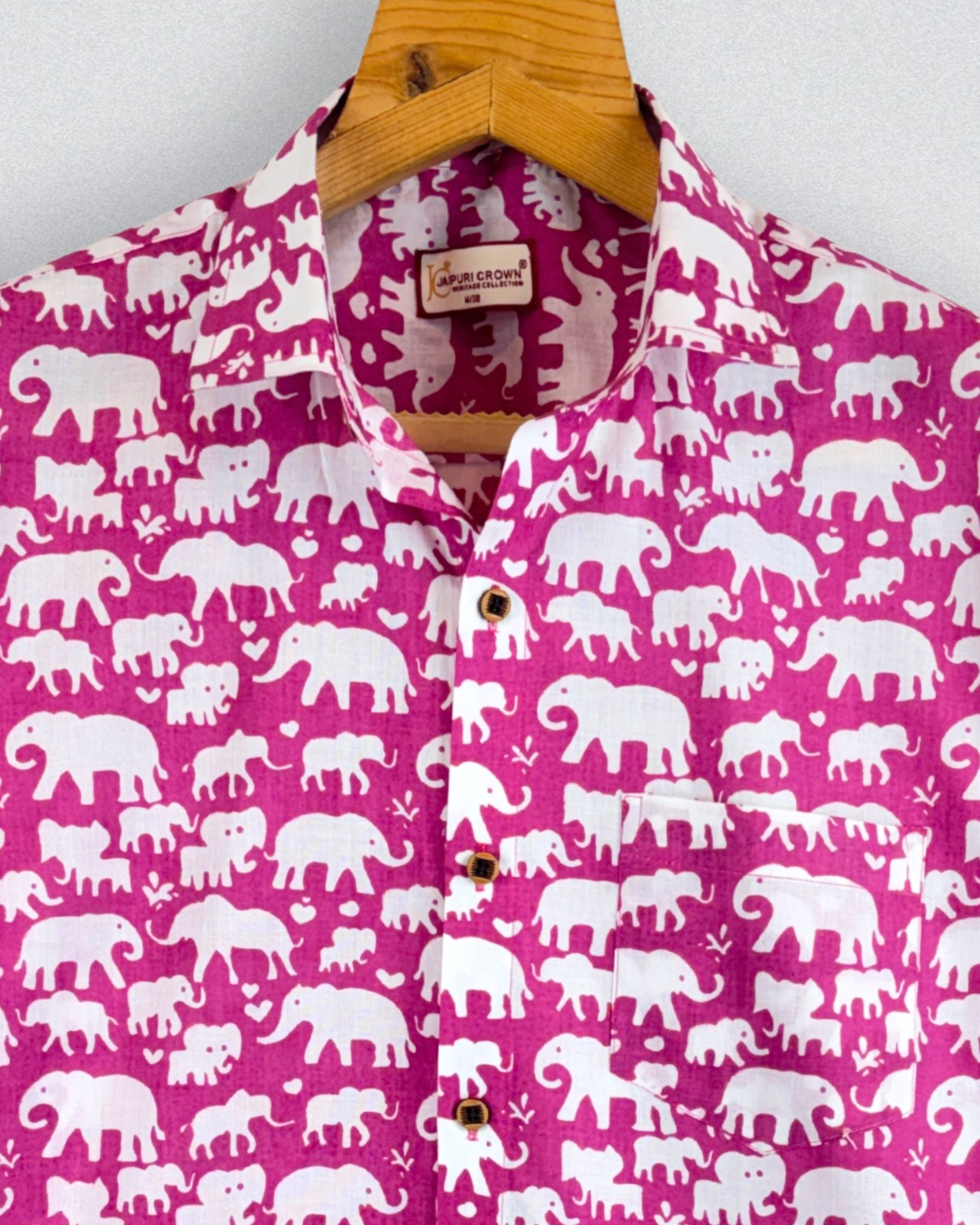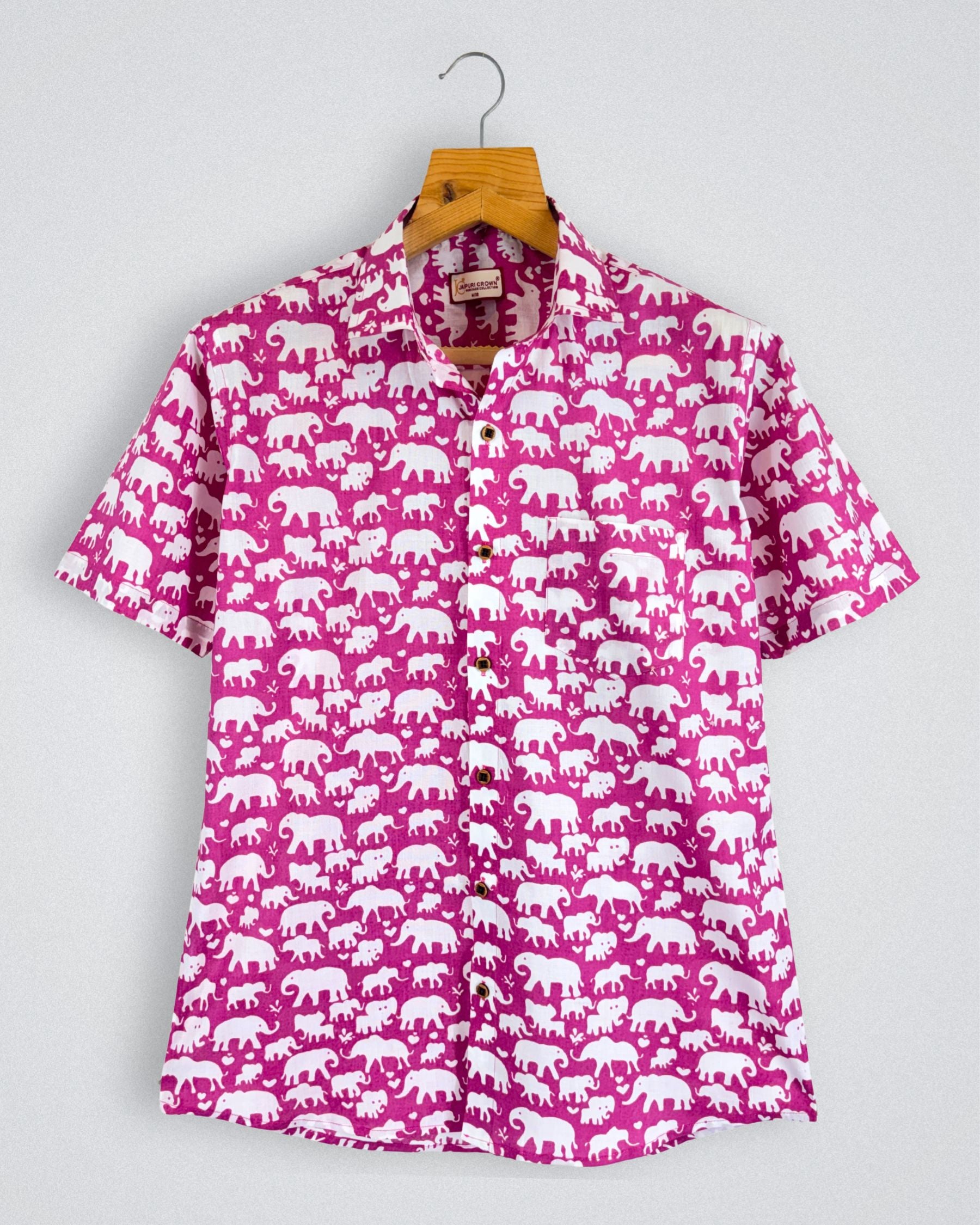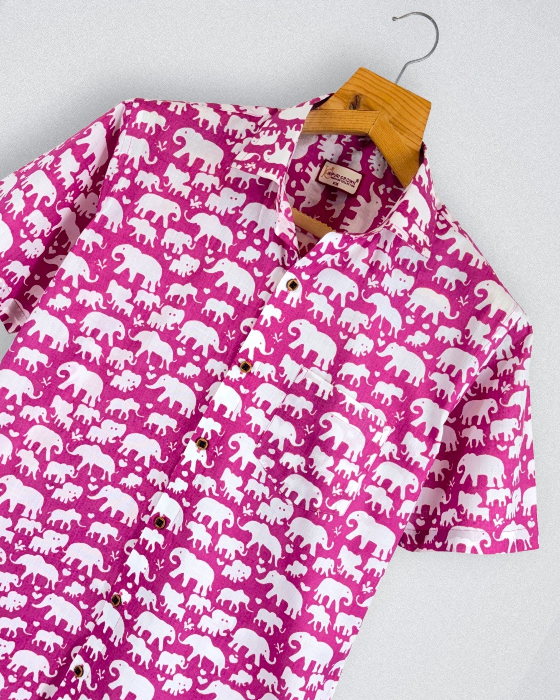 Step into a world of charm with our Elephant Parade by Jaipuri Crown – a delightful half sleeve cotton shirt featuring a playful elephant print in vibrant pink and white. Made from 100% Sanganeri cotton, this shirt promises a soft and comfortable fit, perfect for casual outings or laid-back weekends. The fun design adds a unique flair to your wardrobe, making it a must-have for any fashion-forward individual.