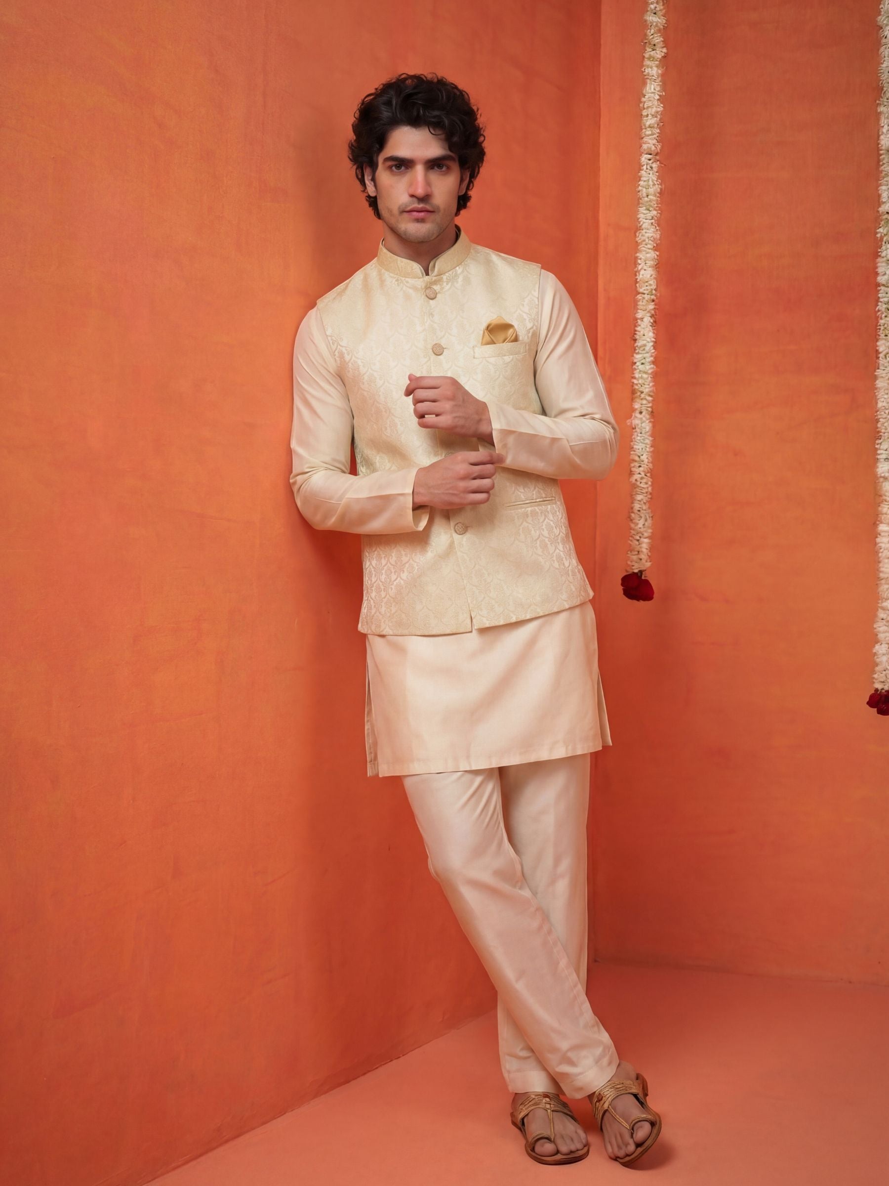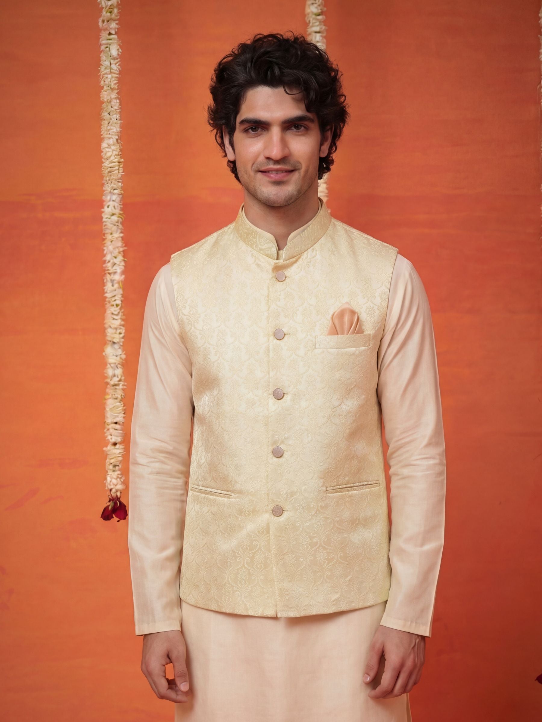 Add a sharp, contemporary edge to your wardrobe with the कोटी (Koti) प्रभा (Prabha) Damask Jacquard Nehru Jacket. This Modi Jacket features a complex, repeating embossed pattern in soft ivory tones that subtly reflect light for a multi-dimensional, radiant look.