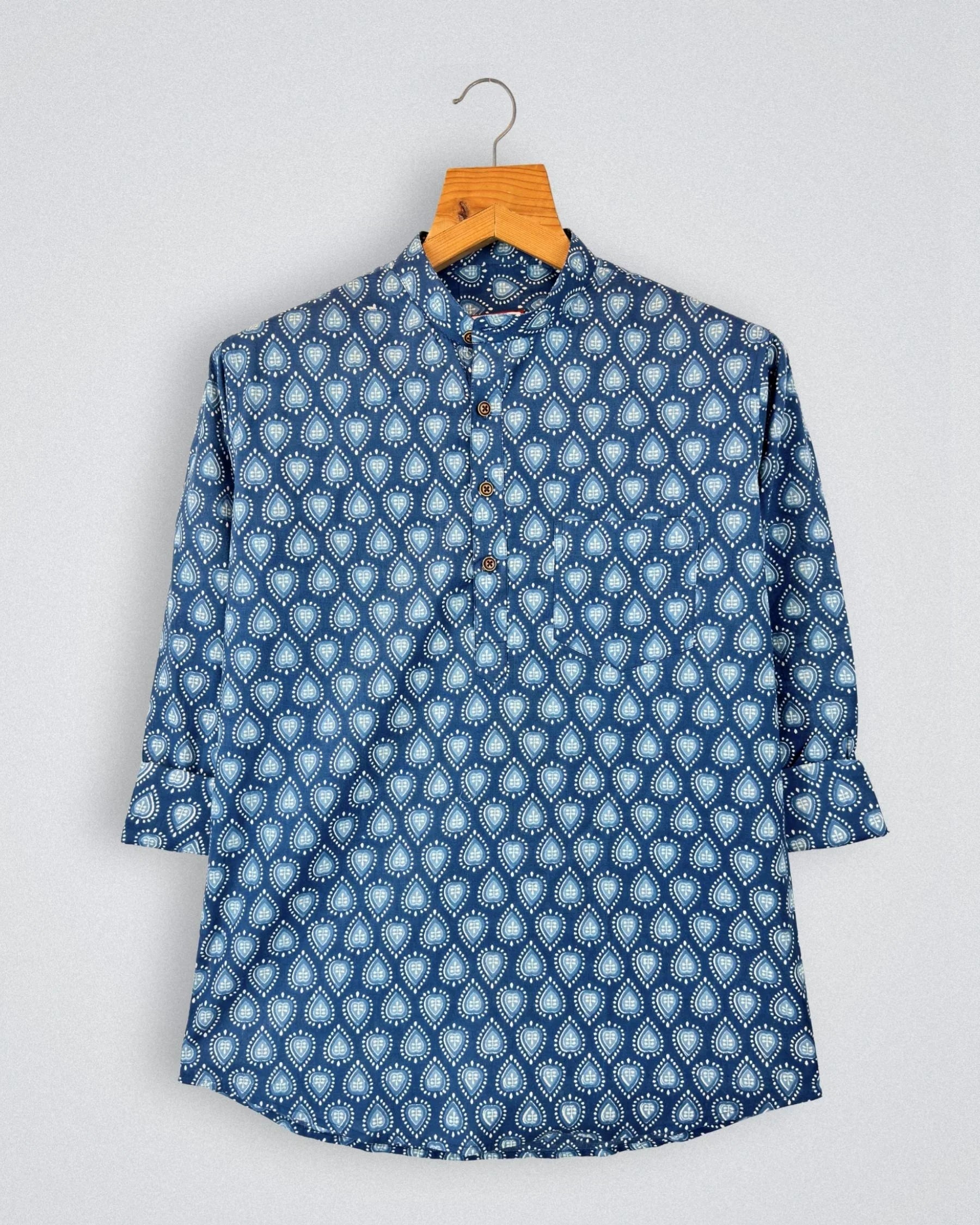 Step into style with Raindrop Rhythm by Jaipuri Crown – a chic Short Kurta featuring a stunning teardrop print in shades of blue on a navy backdrop. Crafted from 100% Sanganeri cotton, this Kurta ensures a soft, breathable fit, making it an ideal choice for casual outings, festive occasions, or laid-back weekends.