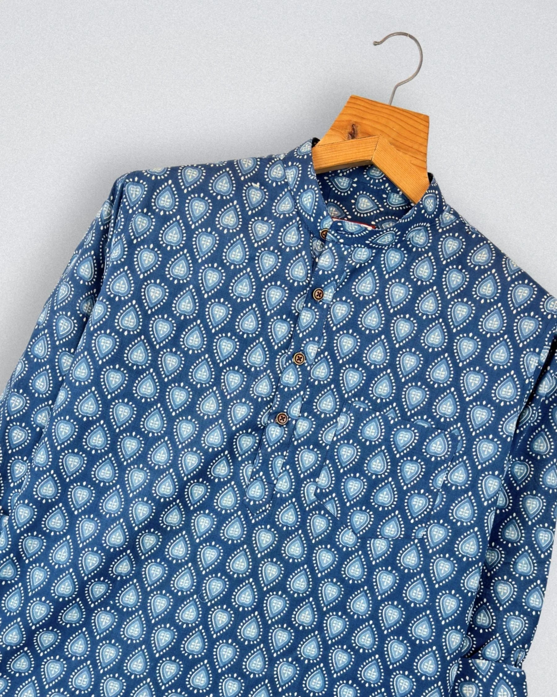 Step into style with Raindrop Rhythm by Jaipuri Crown – a chic Short Kurta featuring a stunning teardrop print in shades of blue on a navy backdrop. Crafted from 100% Sanganeri cotton, this Kurta ensures a soft, breathable fit, making it an ideal choice for casual outings, festive occasions, or laid-back weekends.