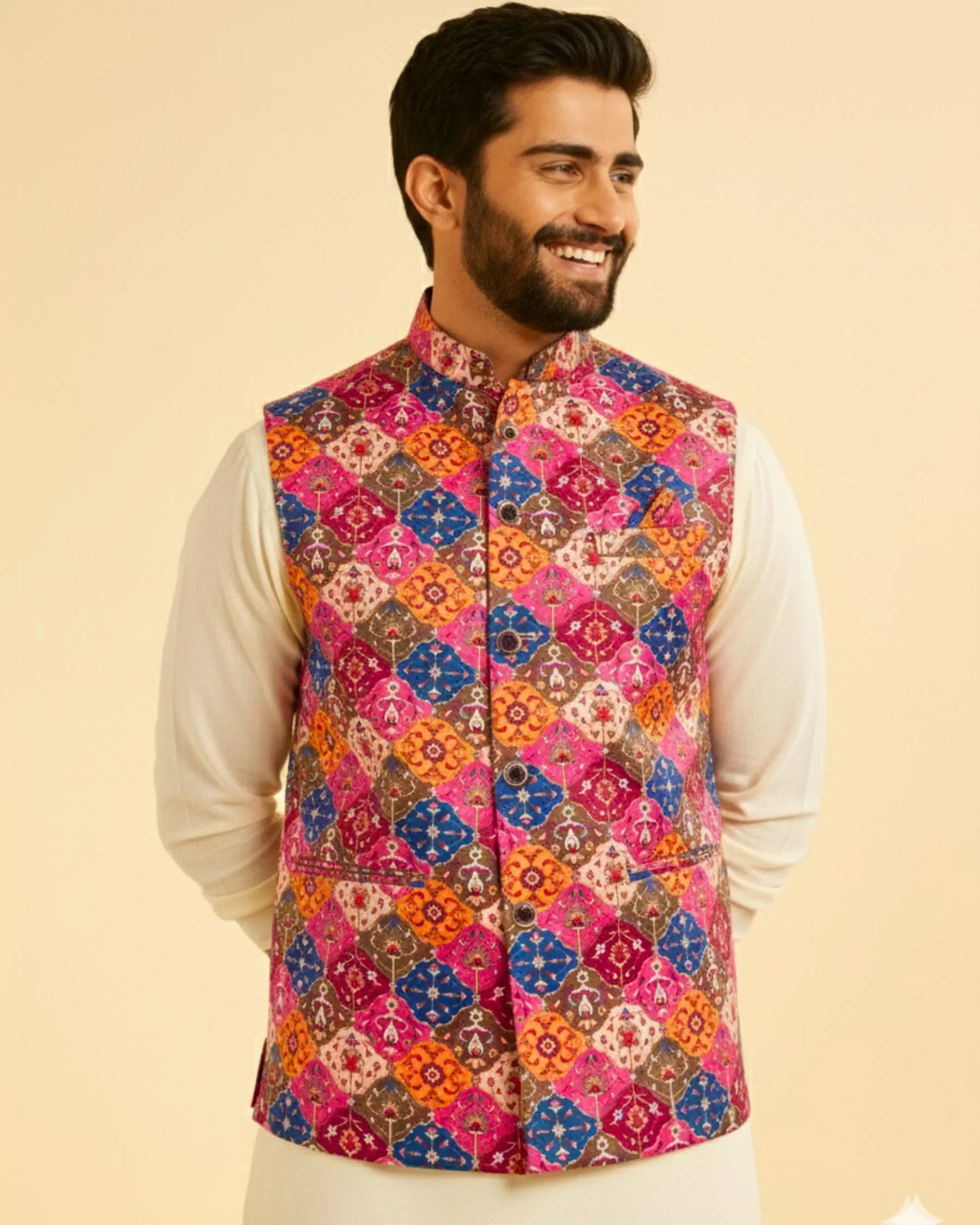 Our Modi Jacket boasts a traditional print that captures the essence of rich heritage and cultural vibrancy. 🌟 This timeless design infuses your attire with elegance, perfect for celebrating cultural occasions with flair.