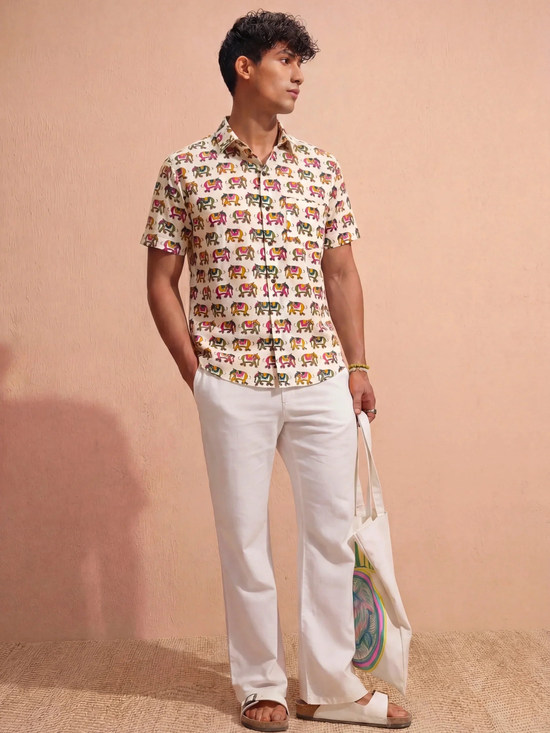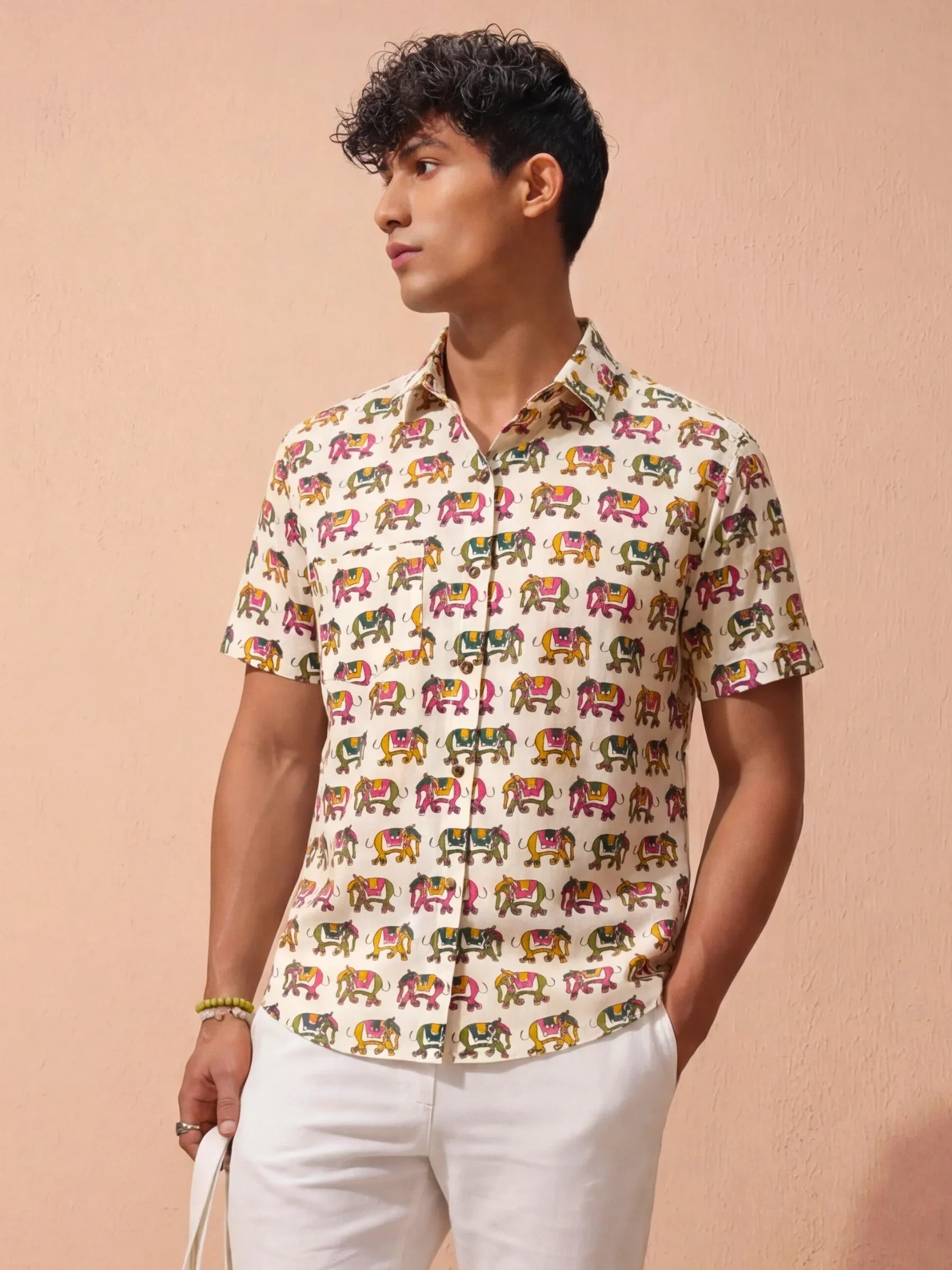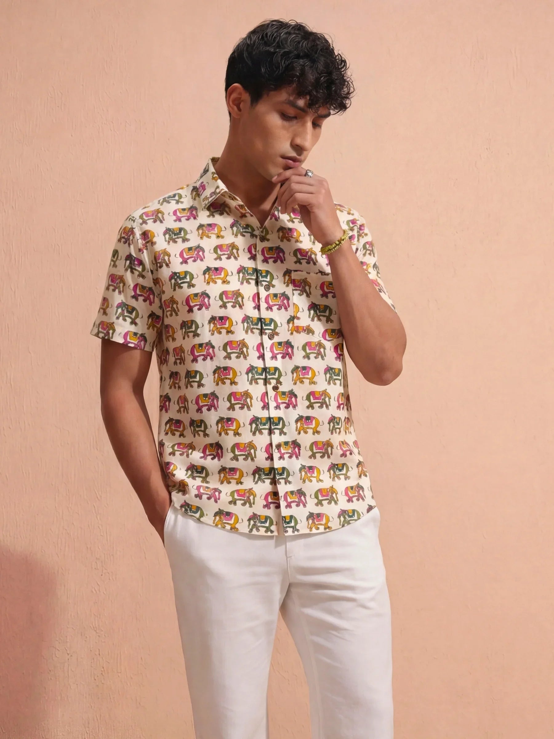 Step into a world of vibrant tradition with Rajasthani Charm by Jaipuri Crown – a stylish half sleeve cotton shirt featuring a lively print of colorful camels set against a cream base. Made from 100% Sanganeri cotton, this shirt is designed for comfort and breathability, making it an ideal choice for casual outings, festive occasions, or laid-back weekends.
