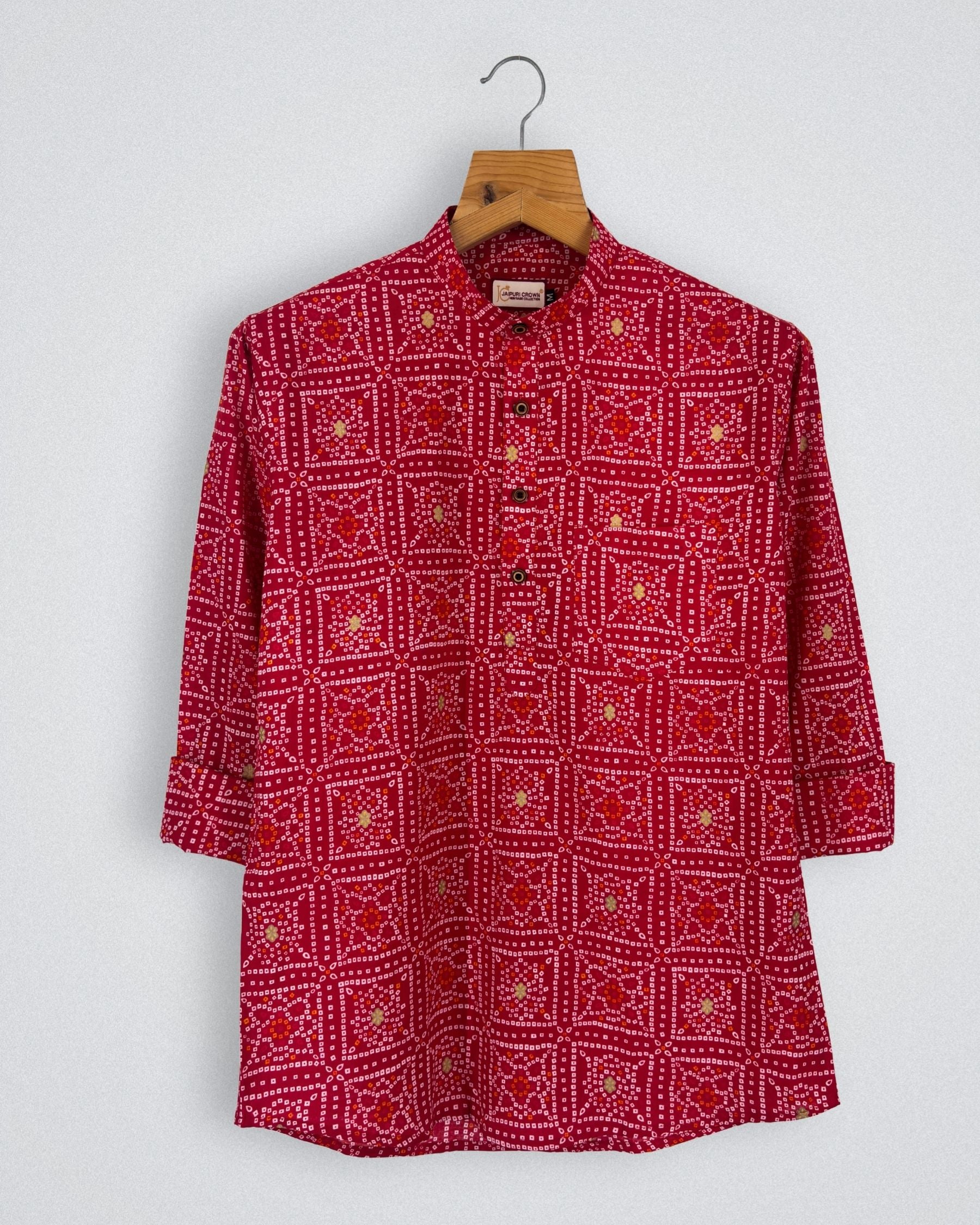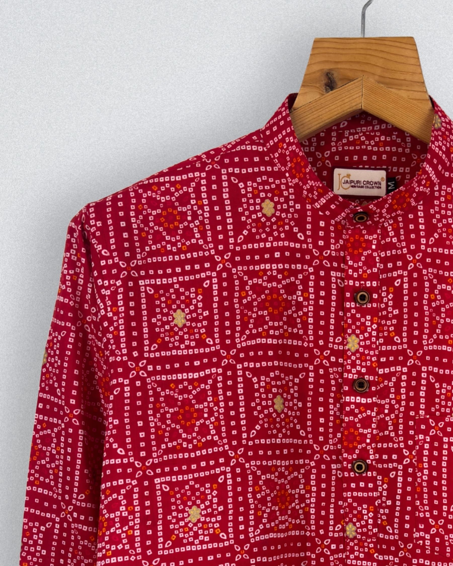 Step into a world of tradition with Rajasthani Charm by Jaipuri Crown – a stunning Short Kurta featuring an intricate print in vibrant red, adorned with delicate green and white motifs. Made from 100% Sanganeri cotton, this Kurta ensures a soft and breathable feel, perfect for festive occasions, family gatherings, or casual outings.