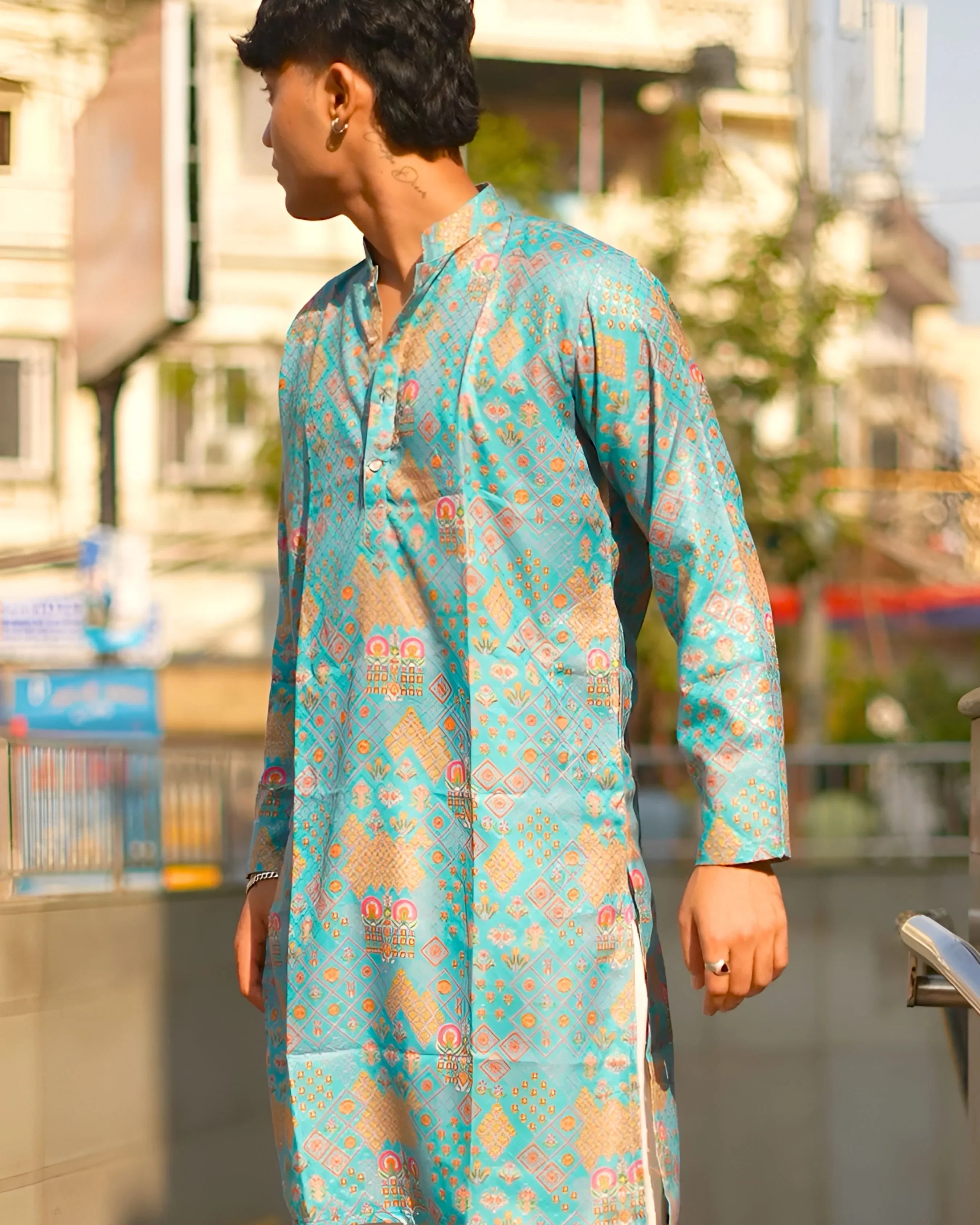 Infuse your festive wardrobe with regal charm in this Rajasthani jaal print long kurta, styled in a rich turquoise base with intricate floral and temple-inspired motifs. 🌸 The detailed jaal design reflects traditional craftsmanship, making it perfect for weddings, festive gatherings, or cultural events. ✨ Featuring a mandarin collar and full sleeves, this kurta blends elegance with all-day comfort. ✅ Pair with white or beige trousers for a striking ethnic look.