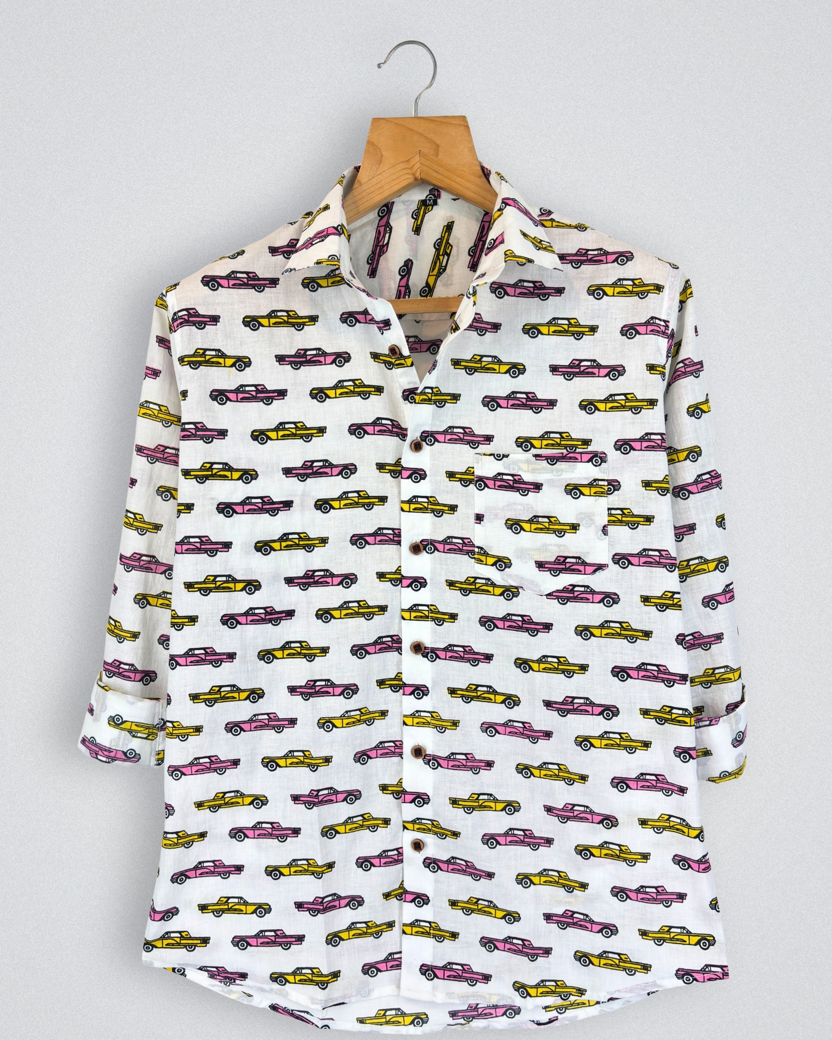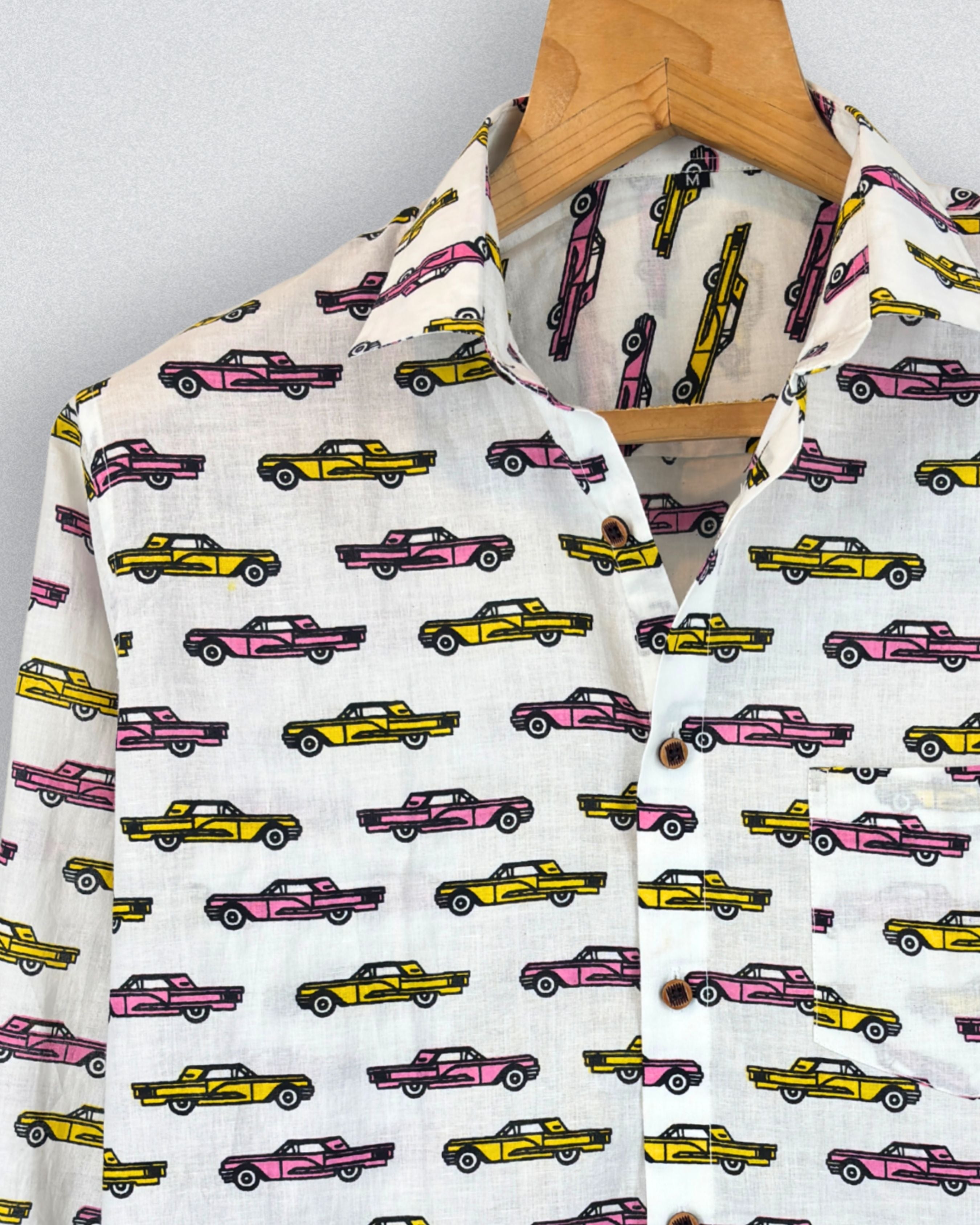 Rev up your style with the Vintage Cars by Jaipuri Crown – a unique Full sleeve cotton shirt featuring an eye-catching print of classic cars in vibrant yellow and pink tones on a crisp white background. Made from 100% Sanganeri cotton, this shirt not only offers exceptional comfort but also breathability, making it an ideal choice for casual outings, road trips, or laid-back weekends.