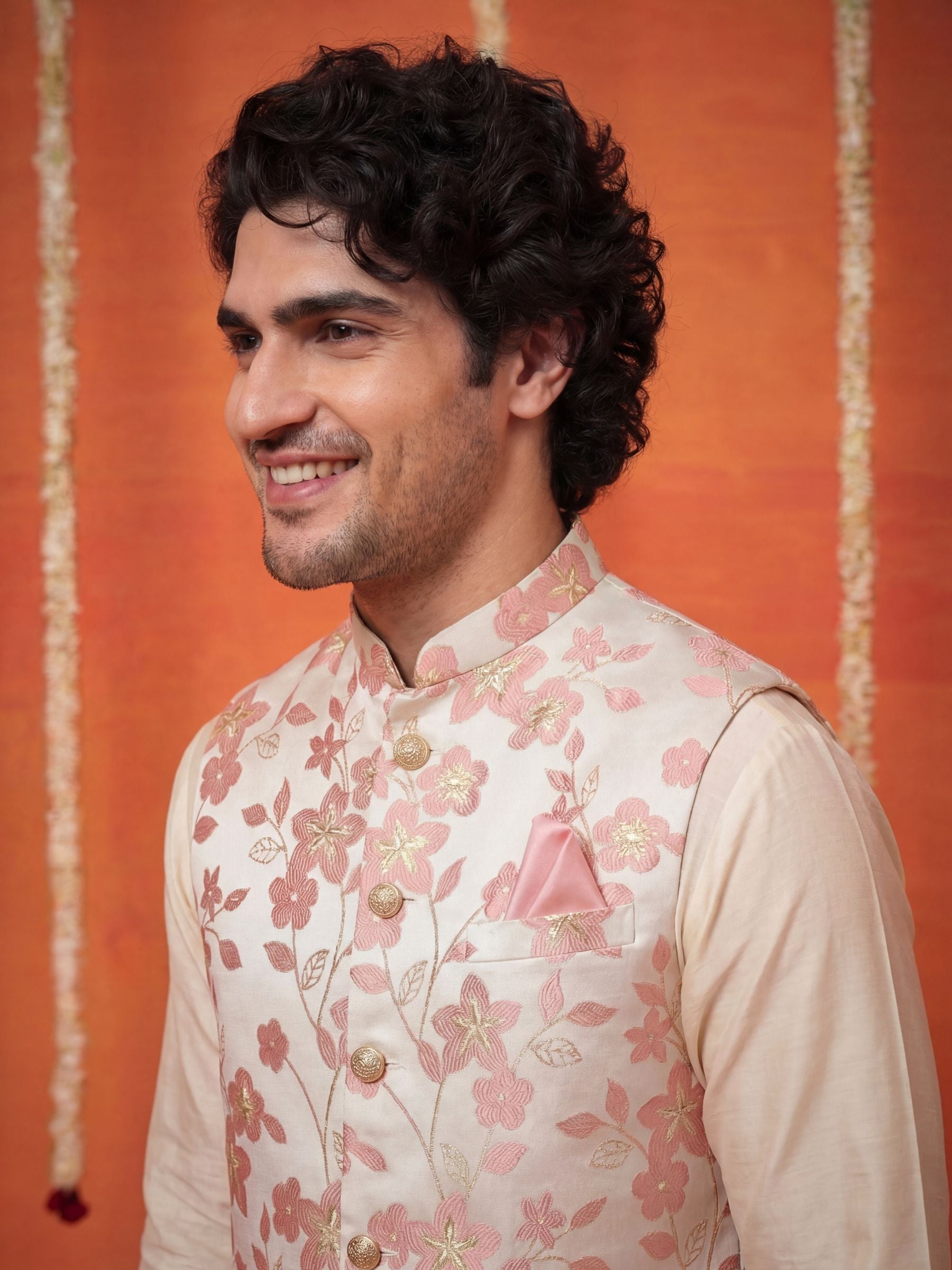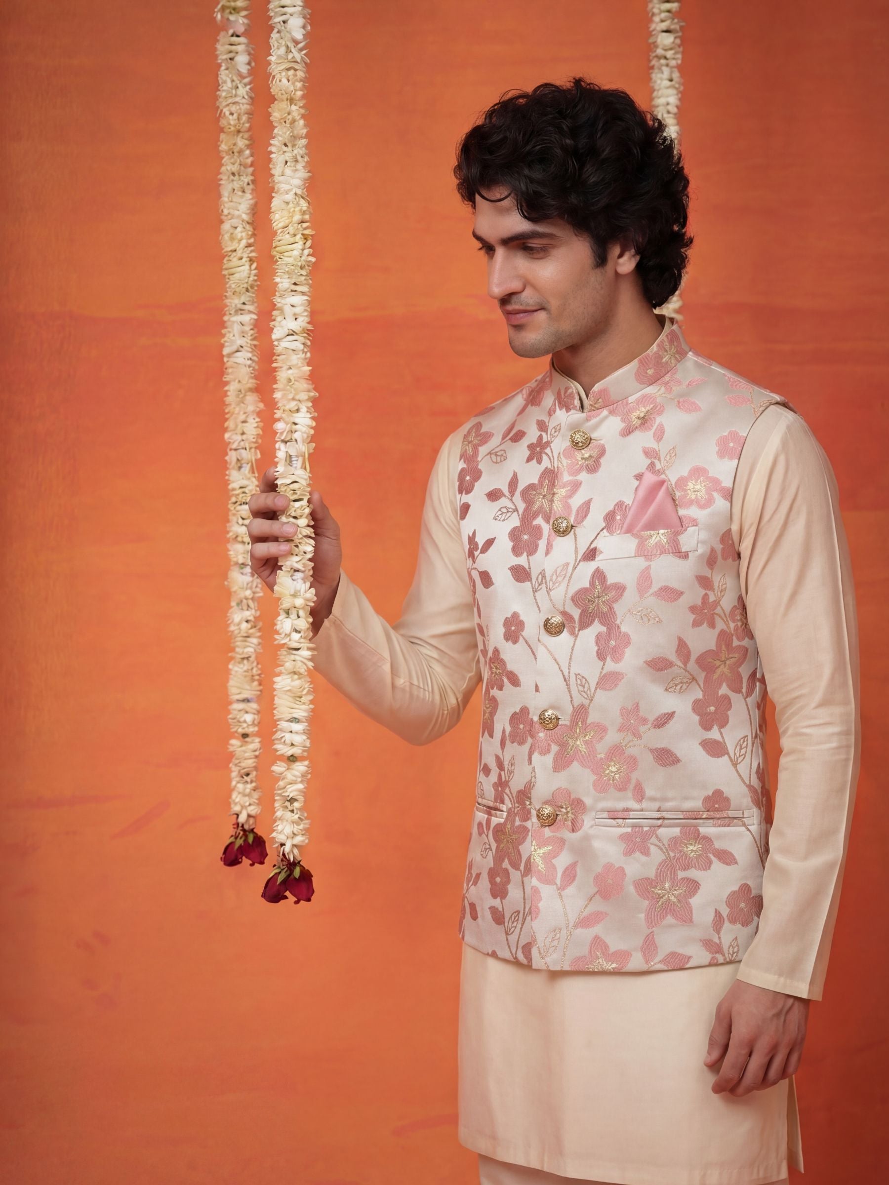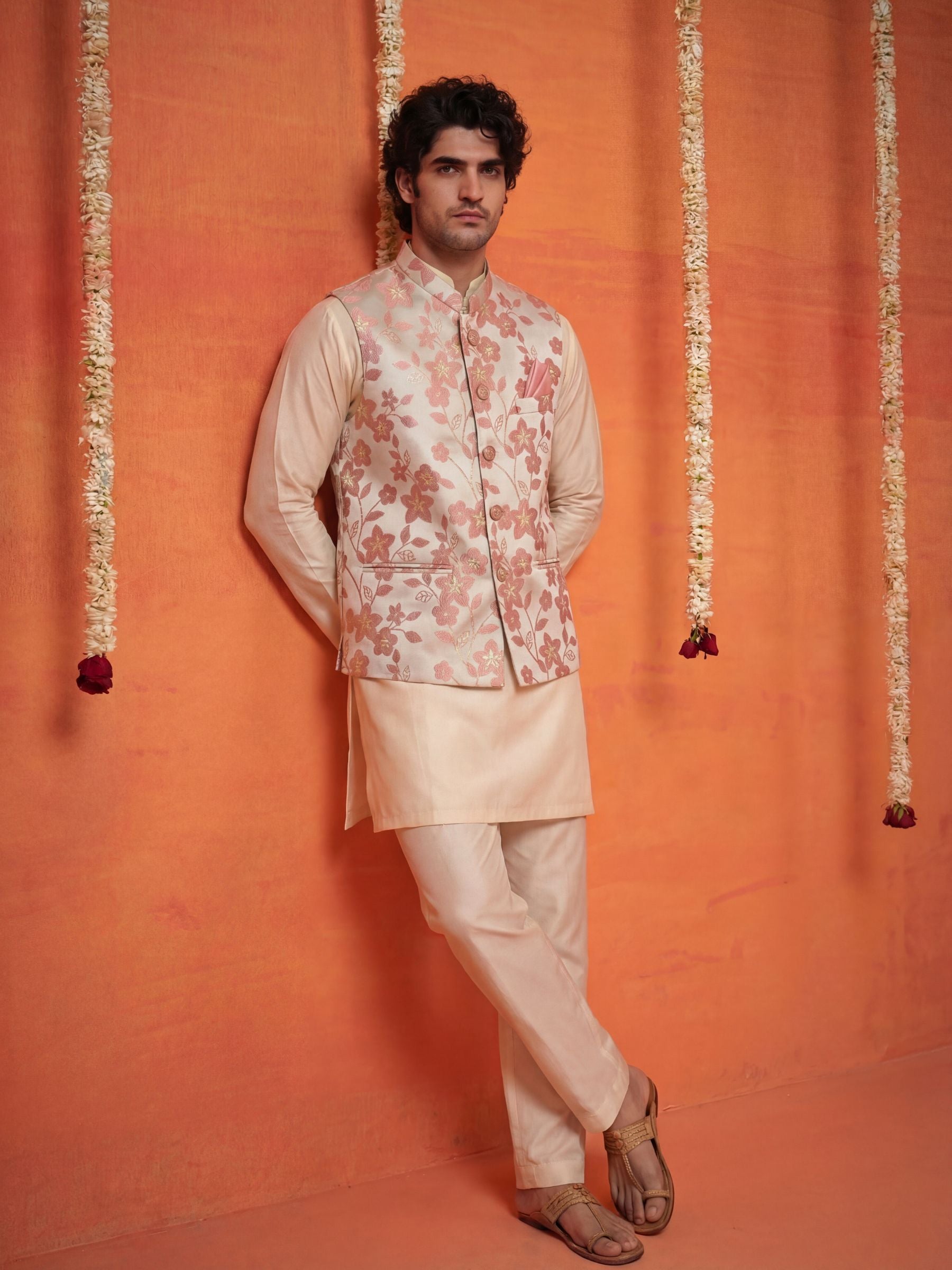 Add a sharp, contemporary edge to your wardrobe with the सदरी (Sadri) Botanical Blossom Silk Nehru Jacket. This Modi Jacket features an intricate, hand-inspired floral vine pattern in soft rose-gold and dusty pink tones that subtly reflect light for a multi-dimensional look.