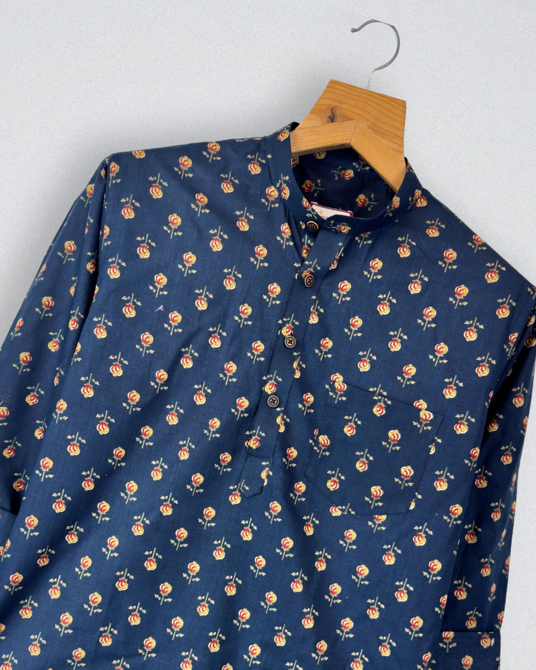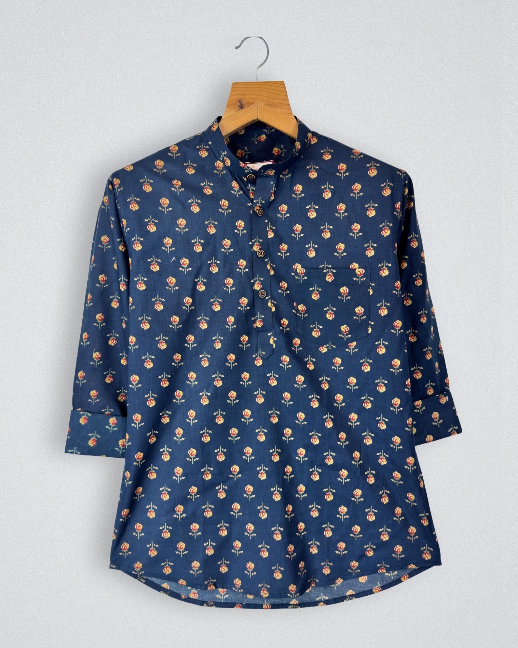 Step into style with Rose Symphony by Jaipuri Crown – a chic Short Kurta featuring an elegant rose print in warm hues against a deep navy background. Made from 100% Sanganeri cotton, this Kurta ensures a soft, breathable feel, making it ideal for casual gatherings, festive occasions, or lounging in comfort.