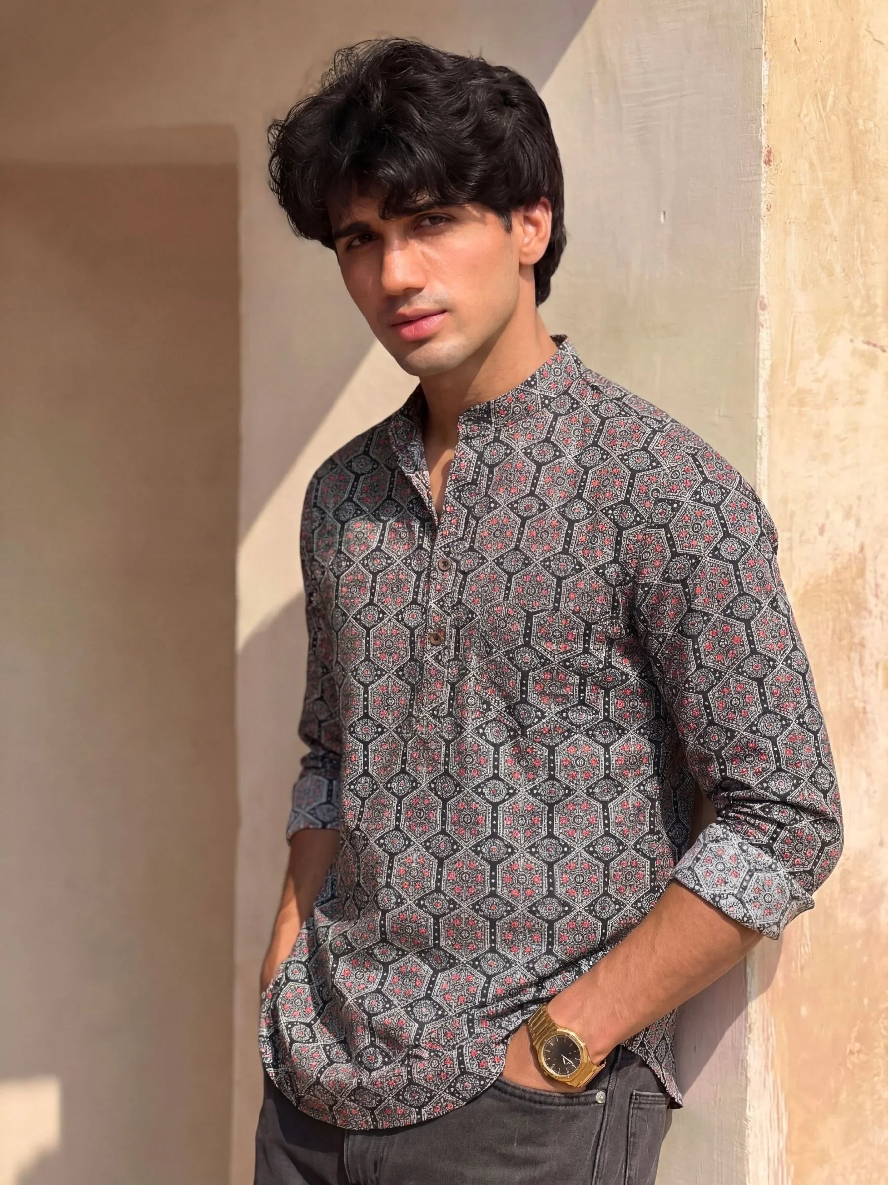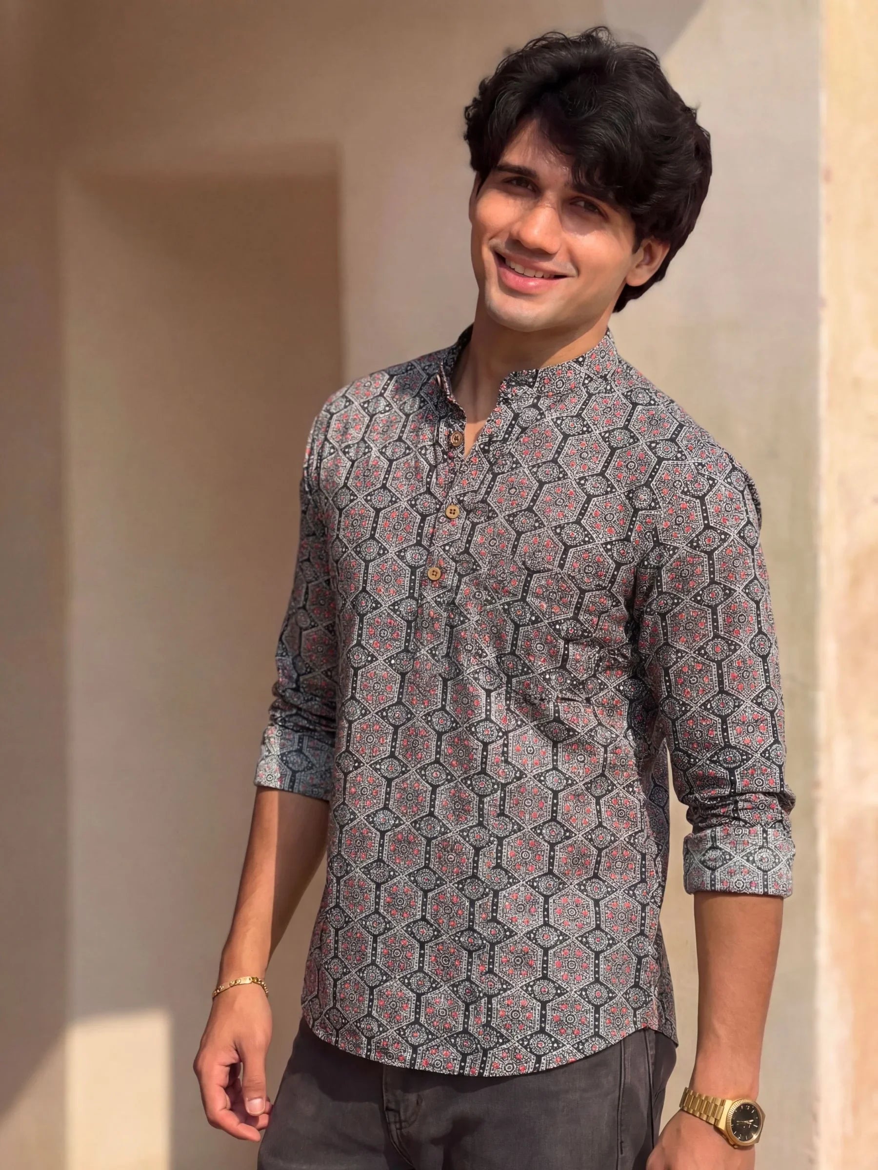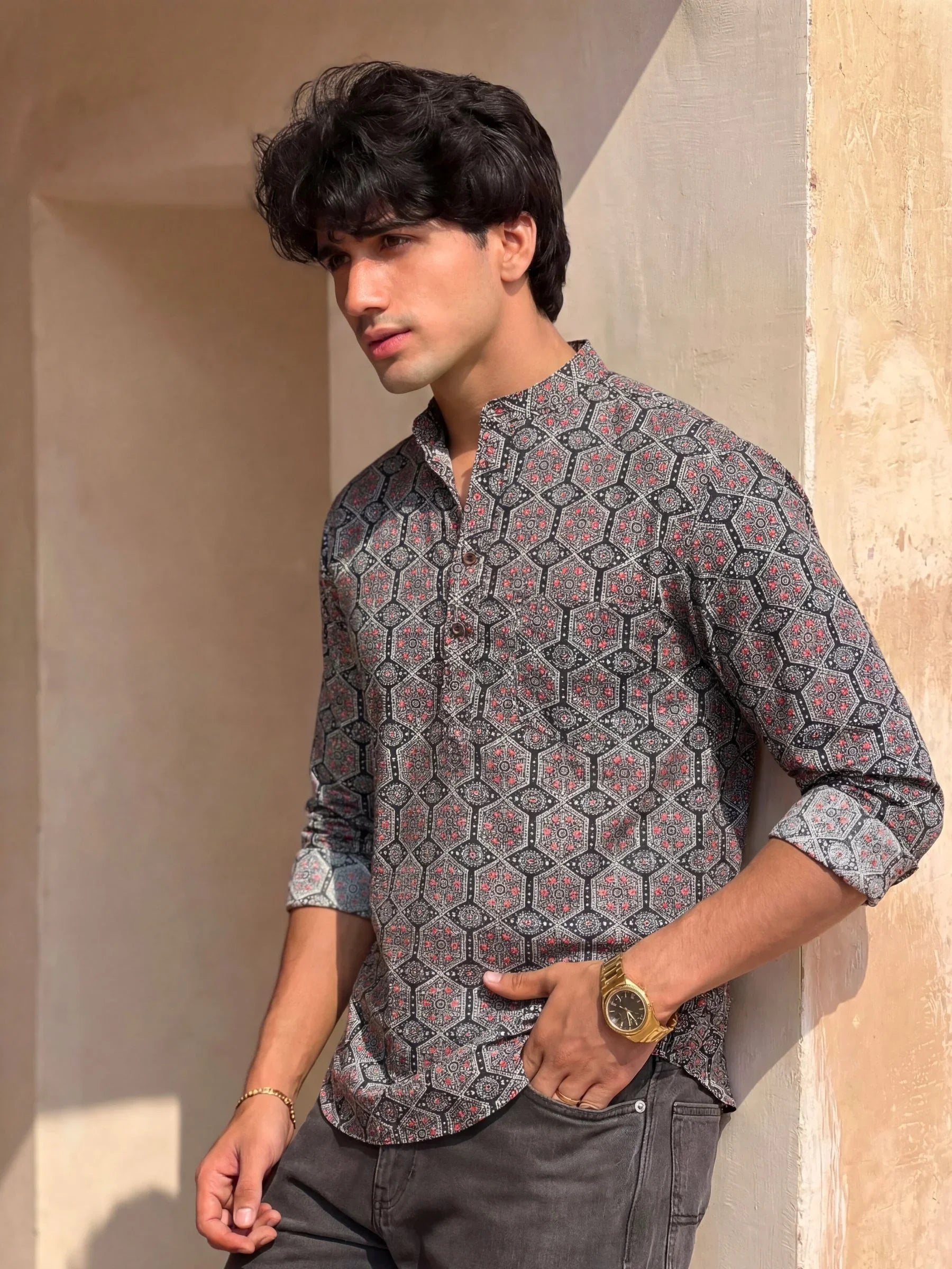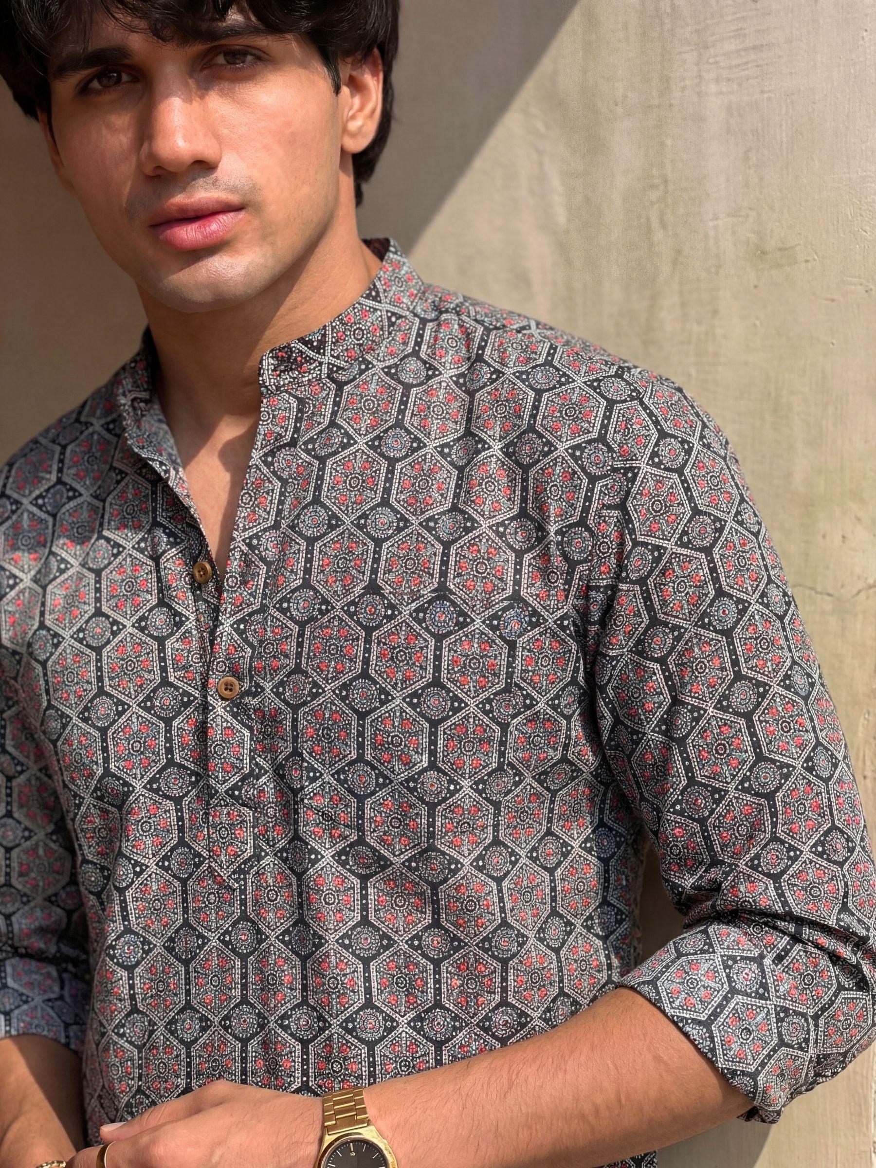 Step into elegance with Royal Mosaic by Jaipuri Crown – a stunning Short Kurta featuring an intricate geometric print in rich red and blue on a bold black background. Made from 100% Sanganeri cotton, this Kurta ensures a soft, breathable feel, making it ideal for festivals, gatherings, or casual outings.