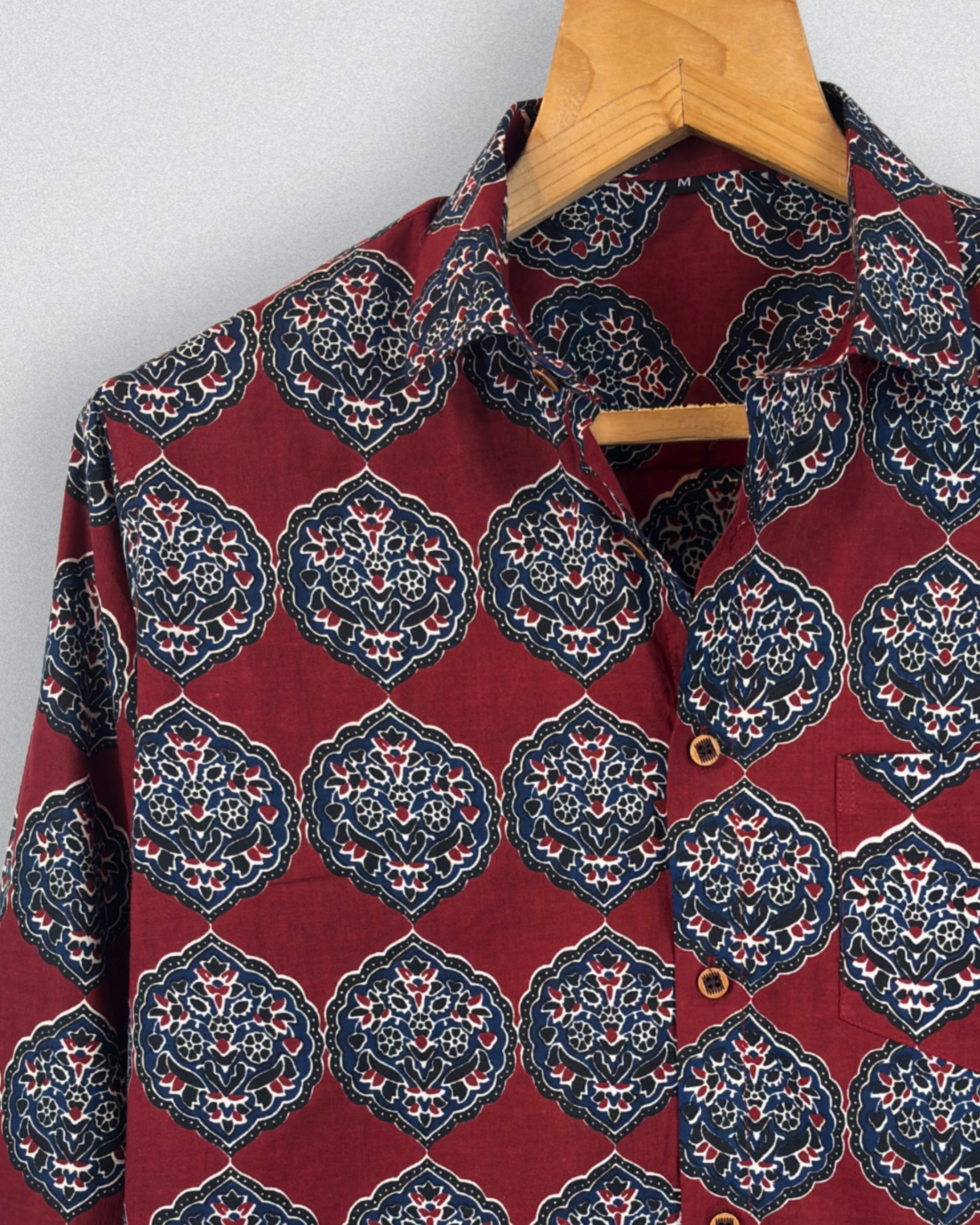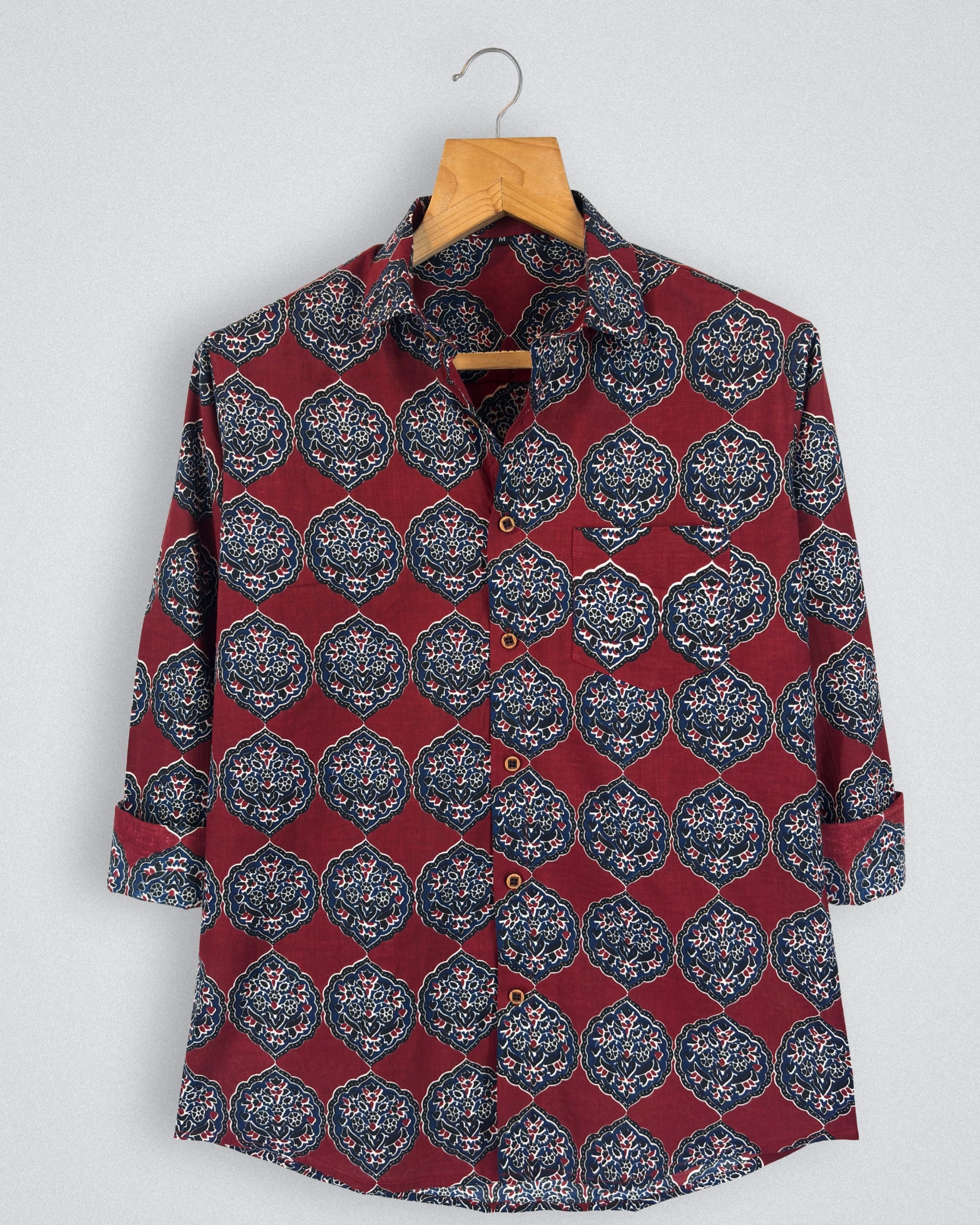 Step into elegance with the Royal Motif by Jaipuri Crown – a chic Full sleeve cotton shirt featuring a stunning burgundy base adorned with intricate navy blue patterns. Made from 100% Sanganeri cotton, this shirt promises a soft, breathable feel, making it an ideal choice for casual outings, family gatherings, or relaxed evenings.