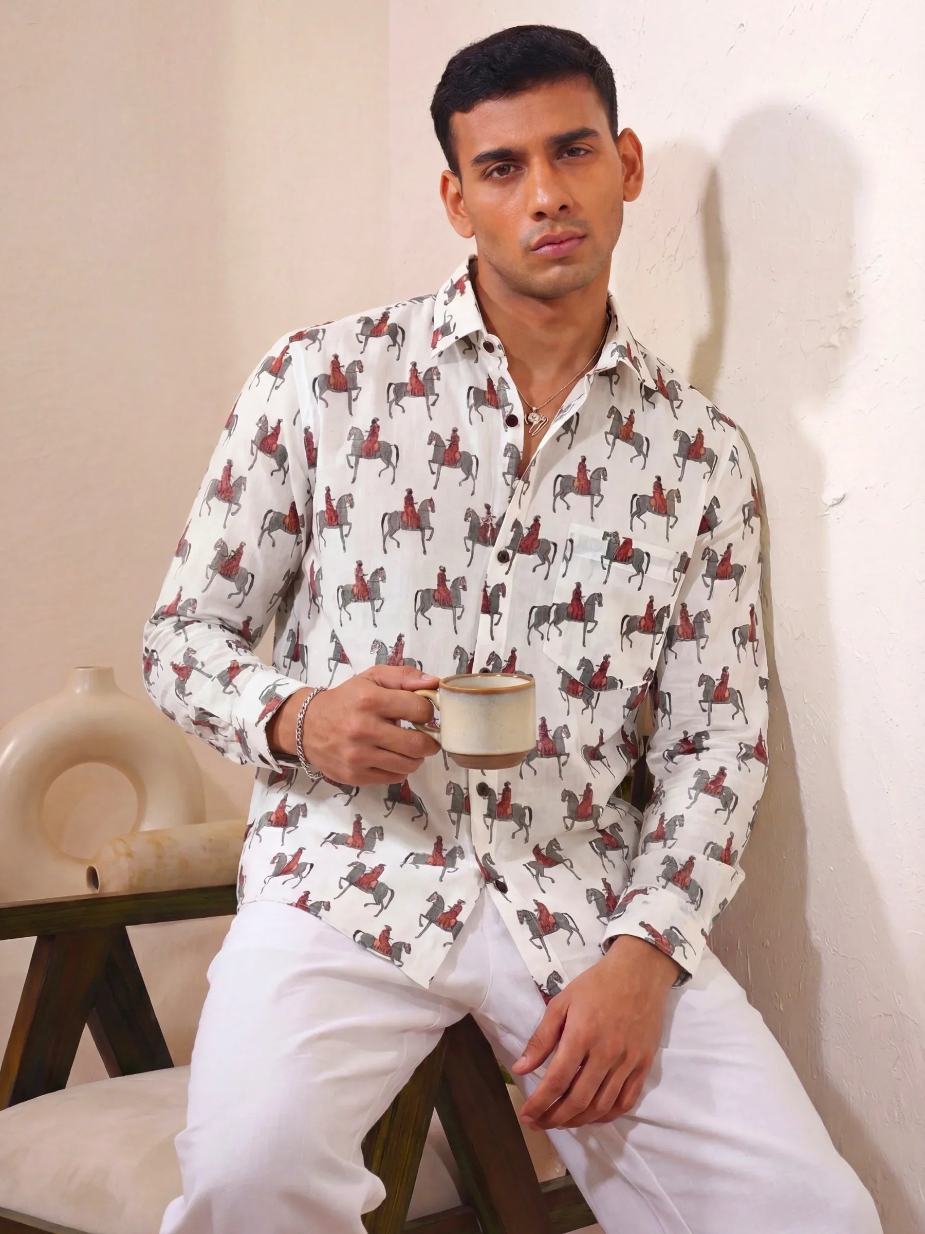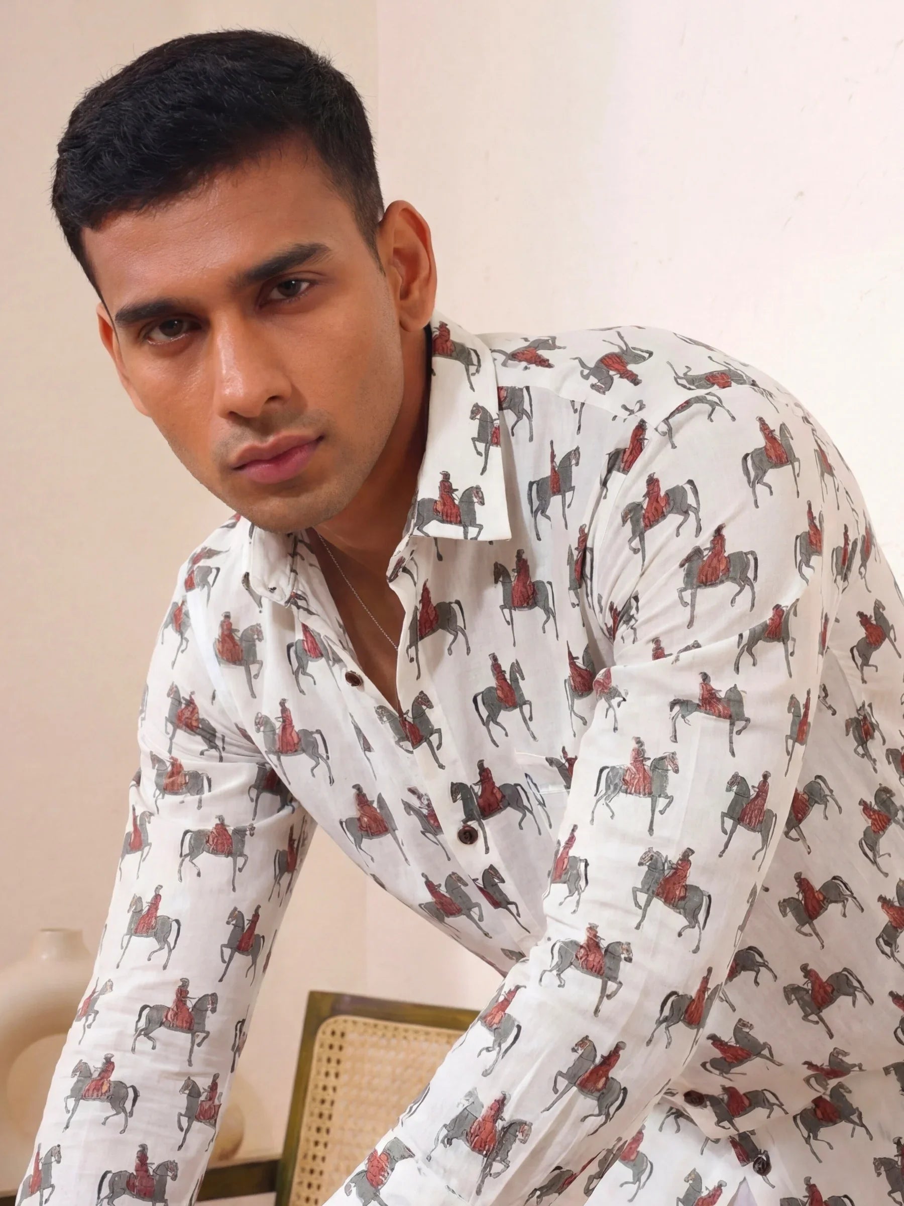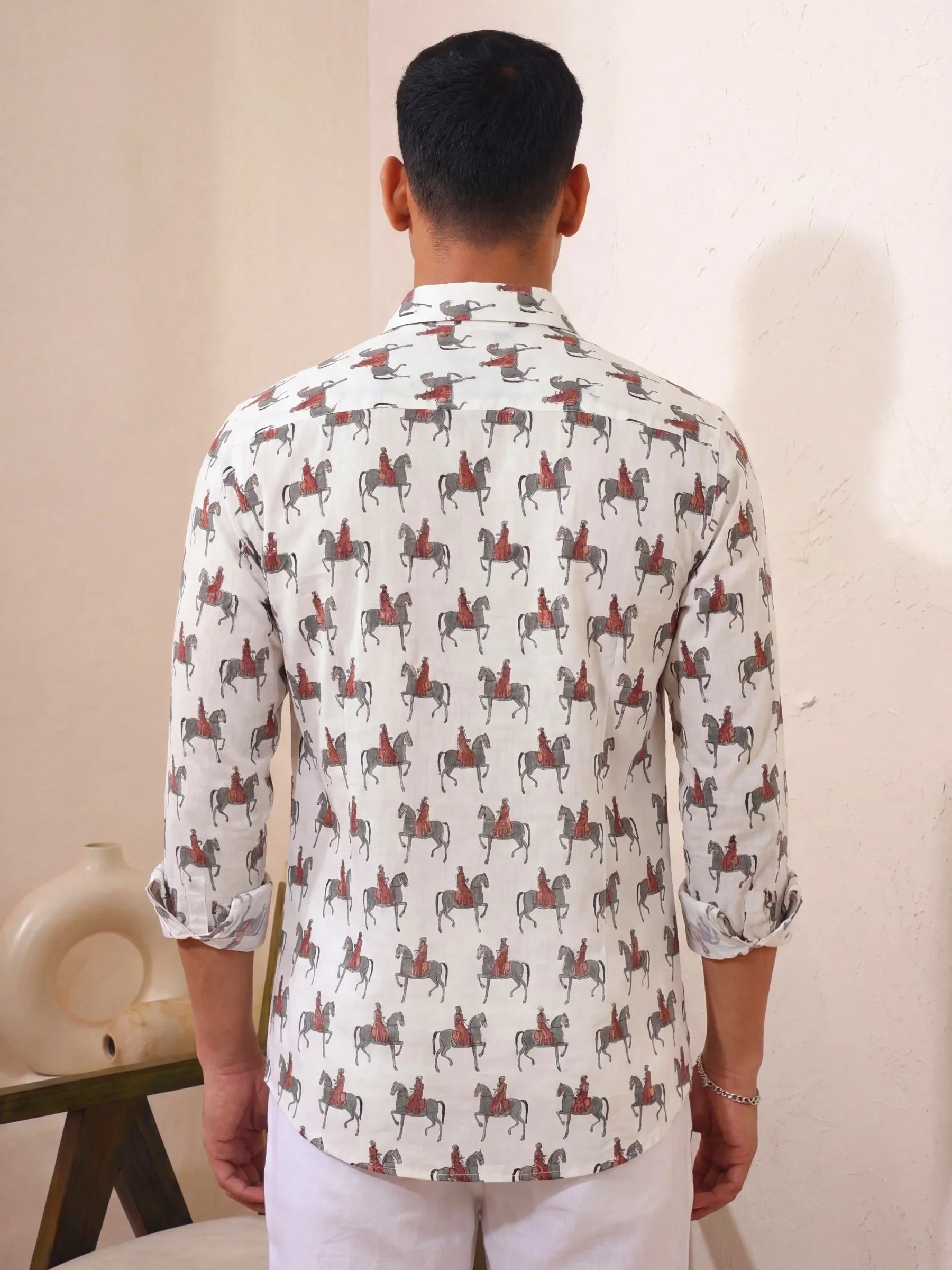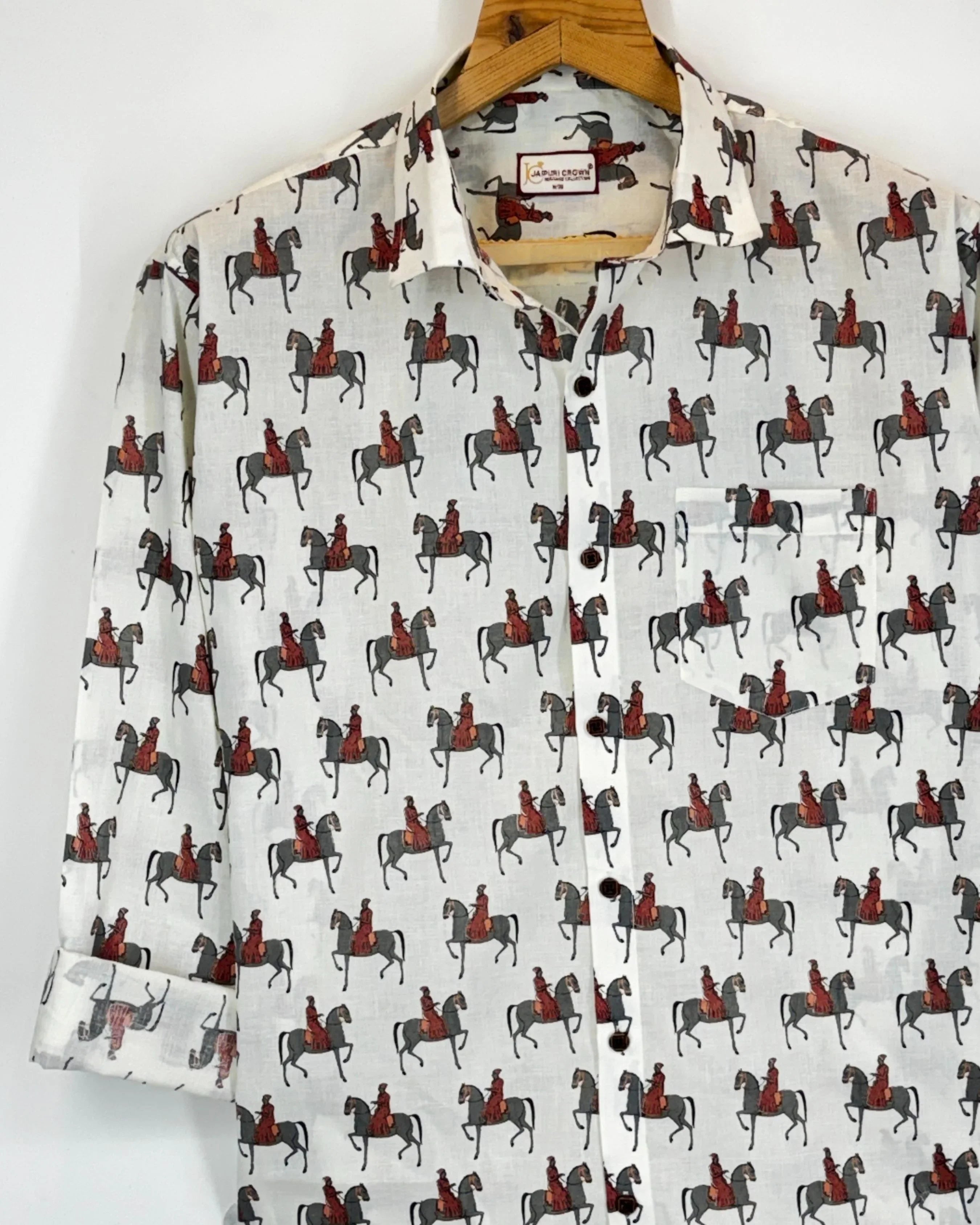Step into a world of elegance with Royal Rider by Jaipuri Crown – a unique Full sleeve cotton shirt featuring a playful horse motif in striking shades of red and grey on a soft cream background. Made from 100% Sanganeri cotton, this shirt ensures a soft, breathable experience that's perfect for casual gatherings, cultural events, or relaxed outings with friends.