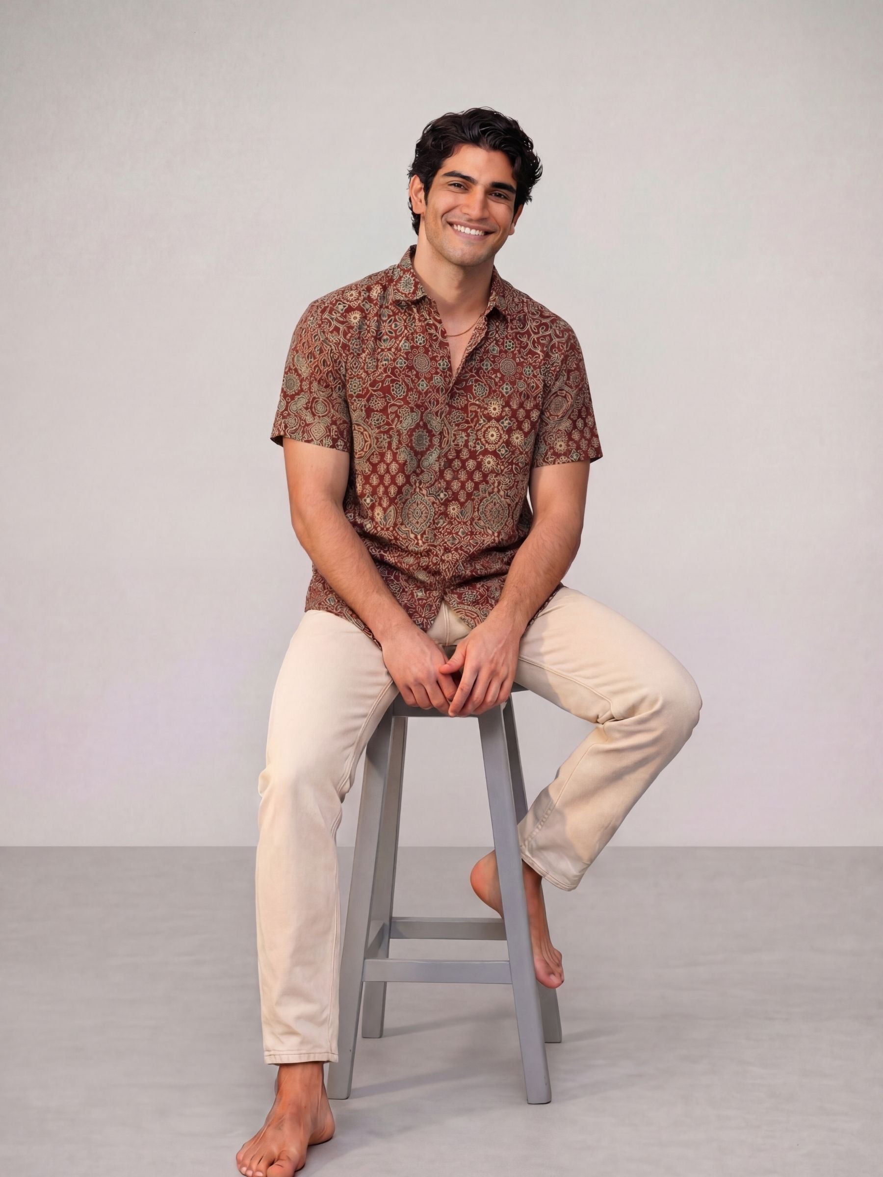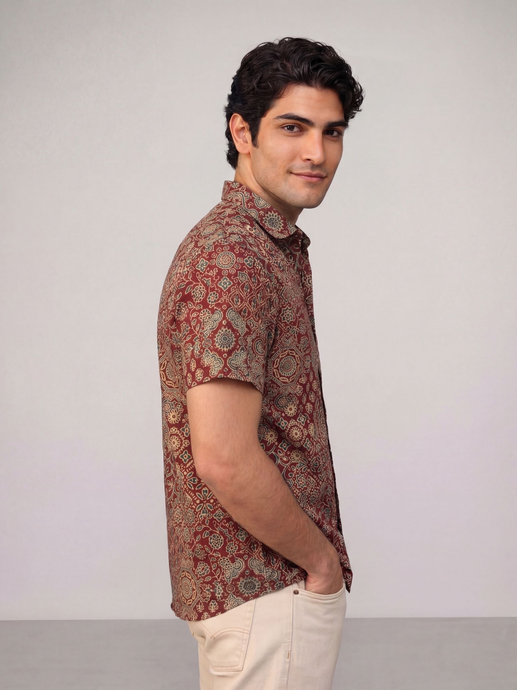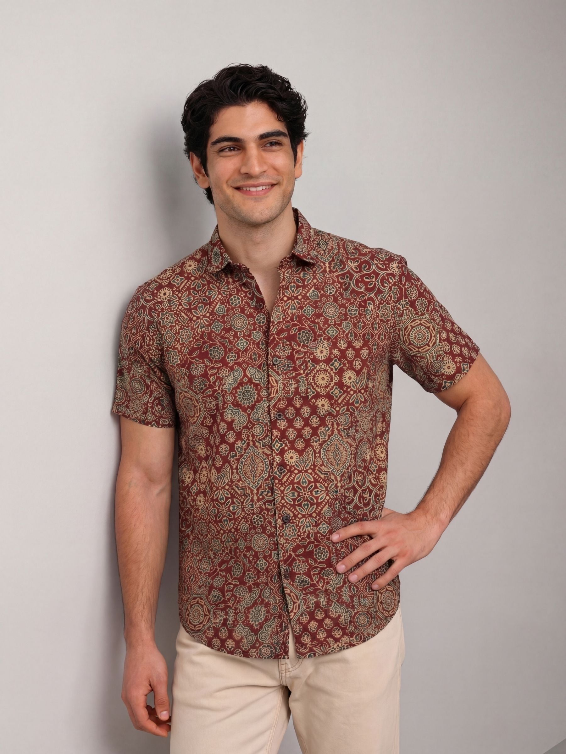 Elevate your casual wardrobe with Rustic Charm by Jaipuri Crown – a stunning half sleeve cotton shirt featuring an intricate floral design in earthy tones. Made from 100% breathable cotton, this shirt ensures comfort and style for any occasion, whether you're heading out for a relaxed day or enjoying a festive gathering.